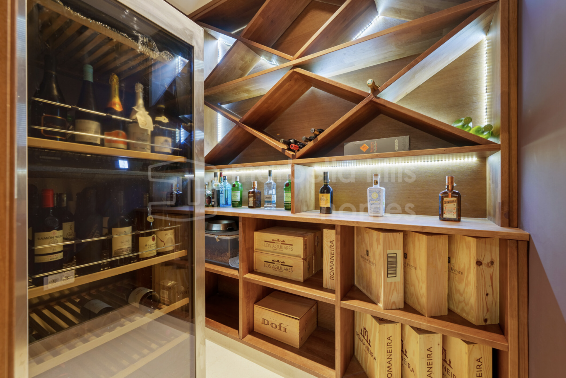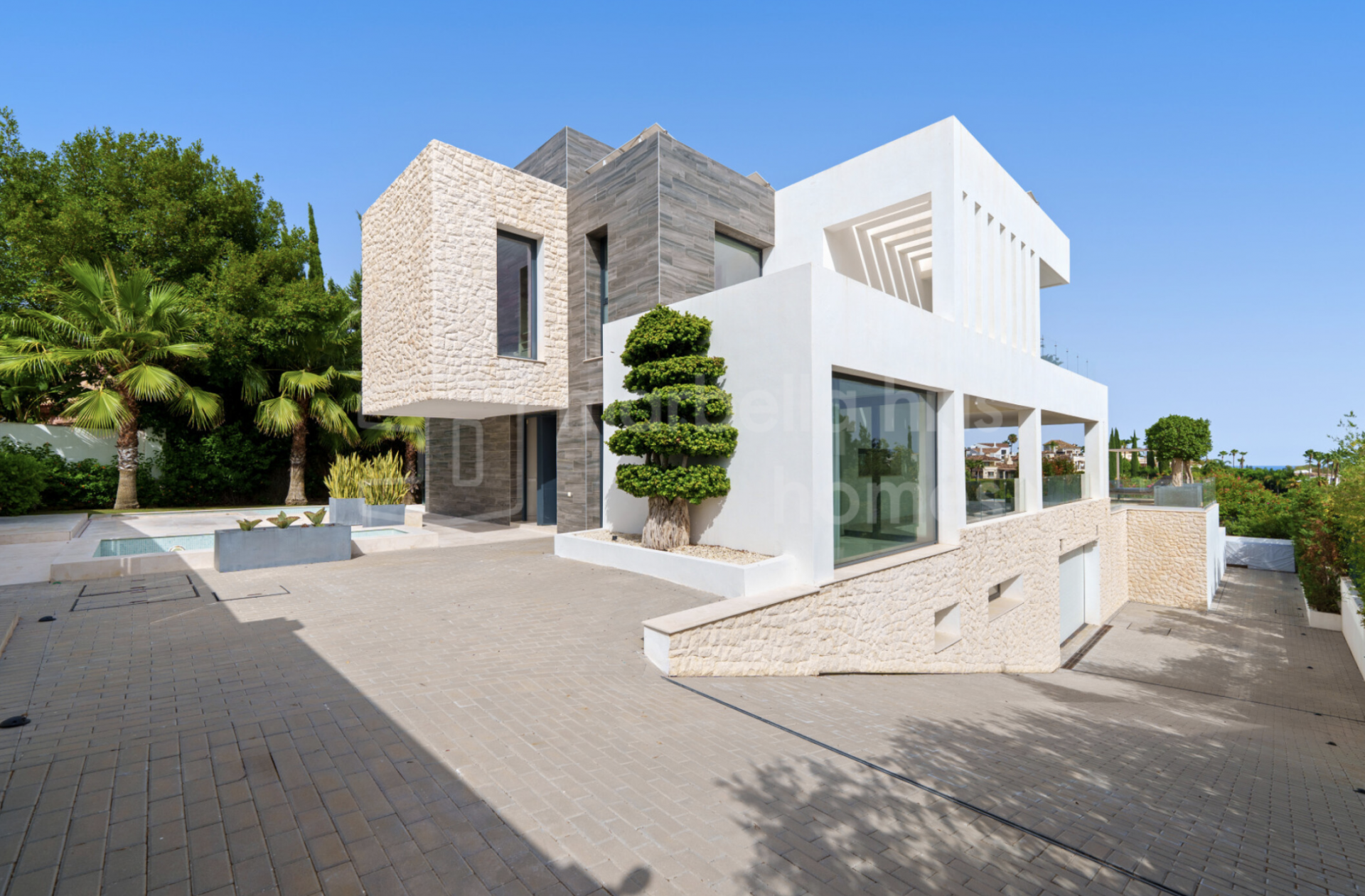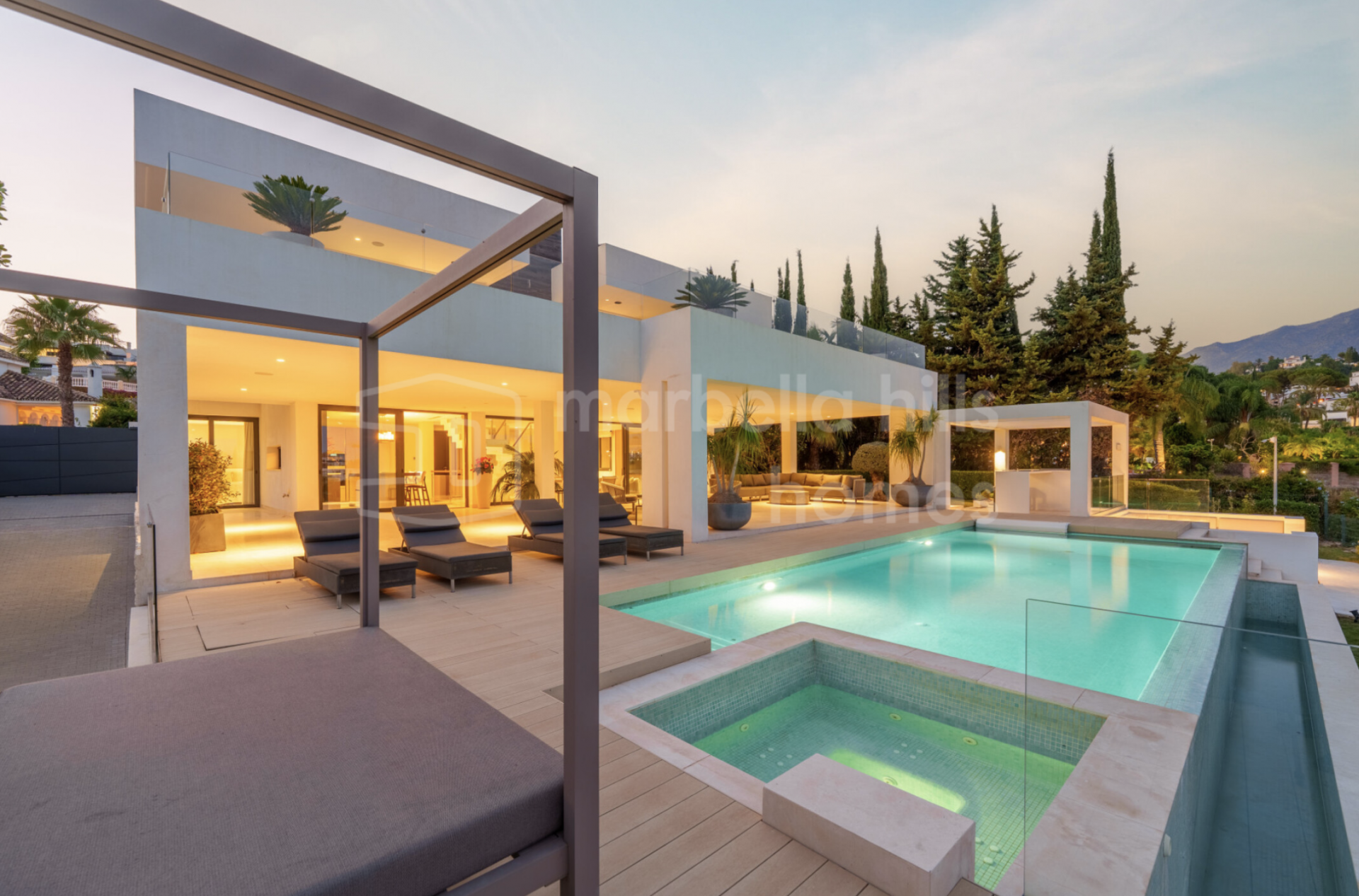 - Chambres : 6 – Salles de bains : 8 – Niveaux : 3 – Garage privé – Piscine à débordement – Système domotique – Cave à vin, salle de sport et espaces lounge