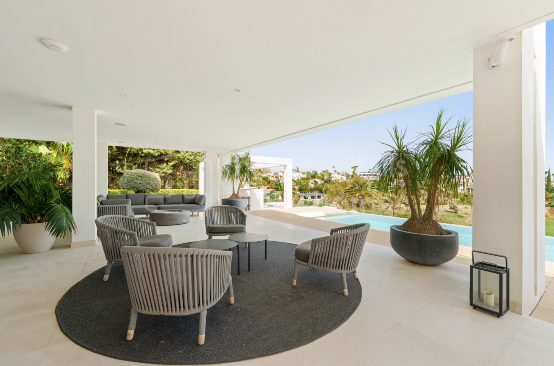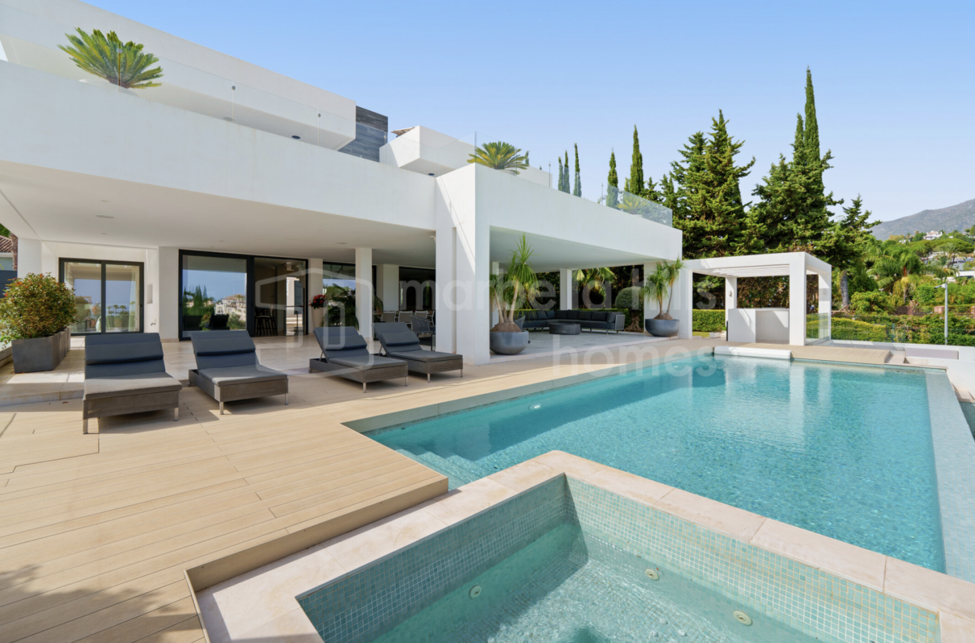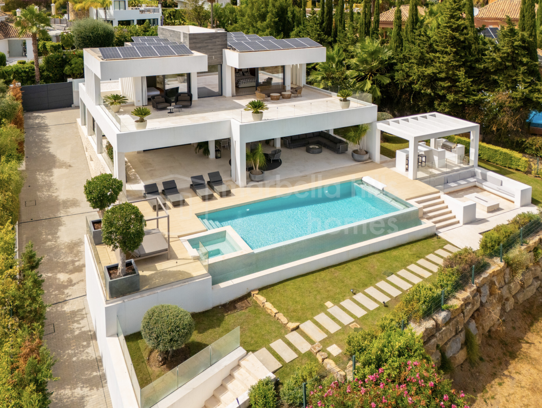 L’extérieur de la villa a été pensé pour une utilisation tout au long de l’année. Les jardins paysagers entourent la piscine à débordement, tandis que de multiples terrasses offrent des espaces variés pour se détendre ou se divertir. Un salon extérieur encastré, une cuisine d’été et plusieurs zones chill-out subliment l’expérience du style de vie méditerranéen.