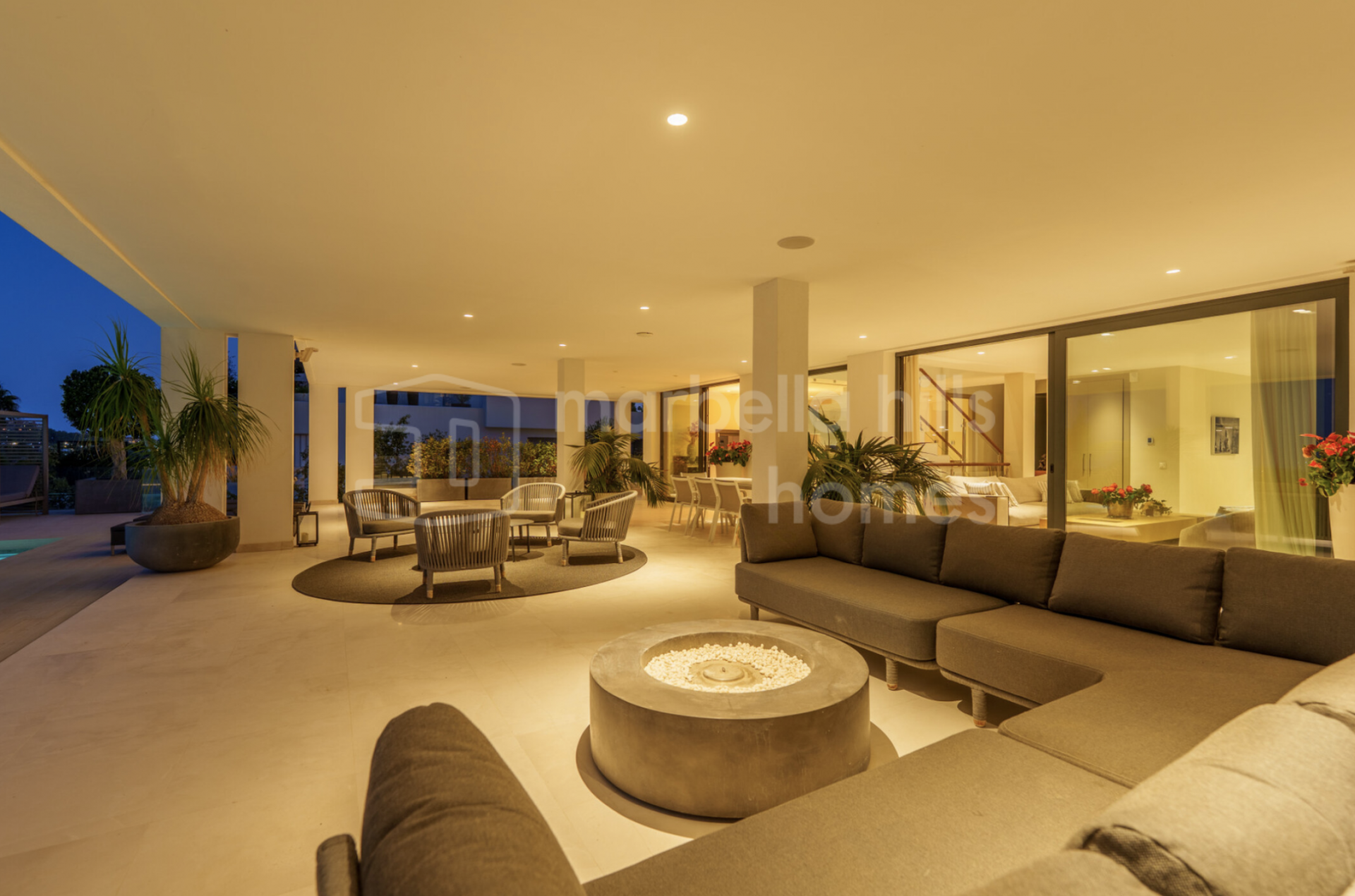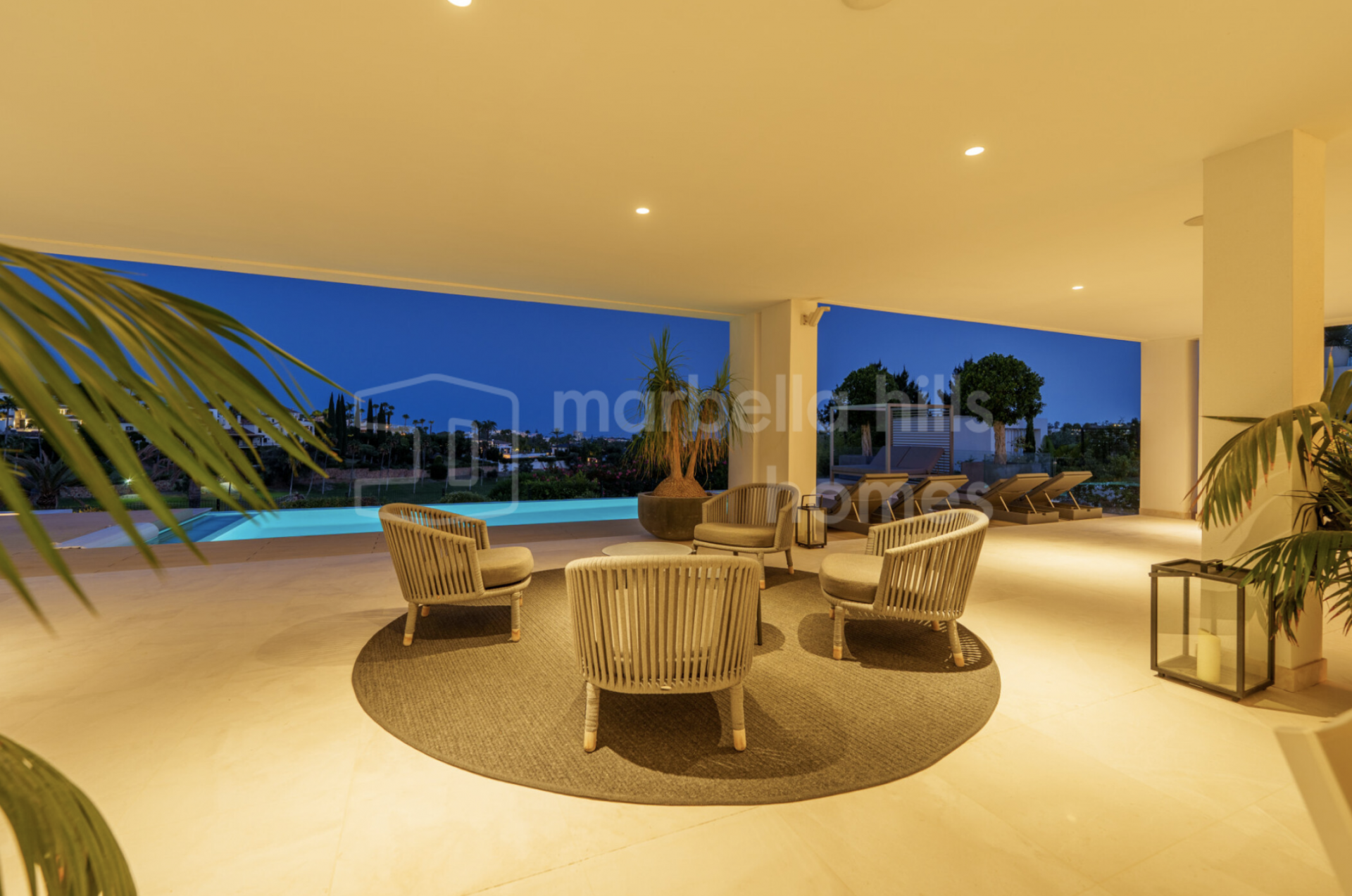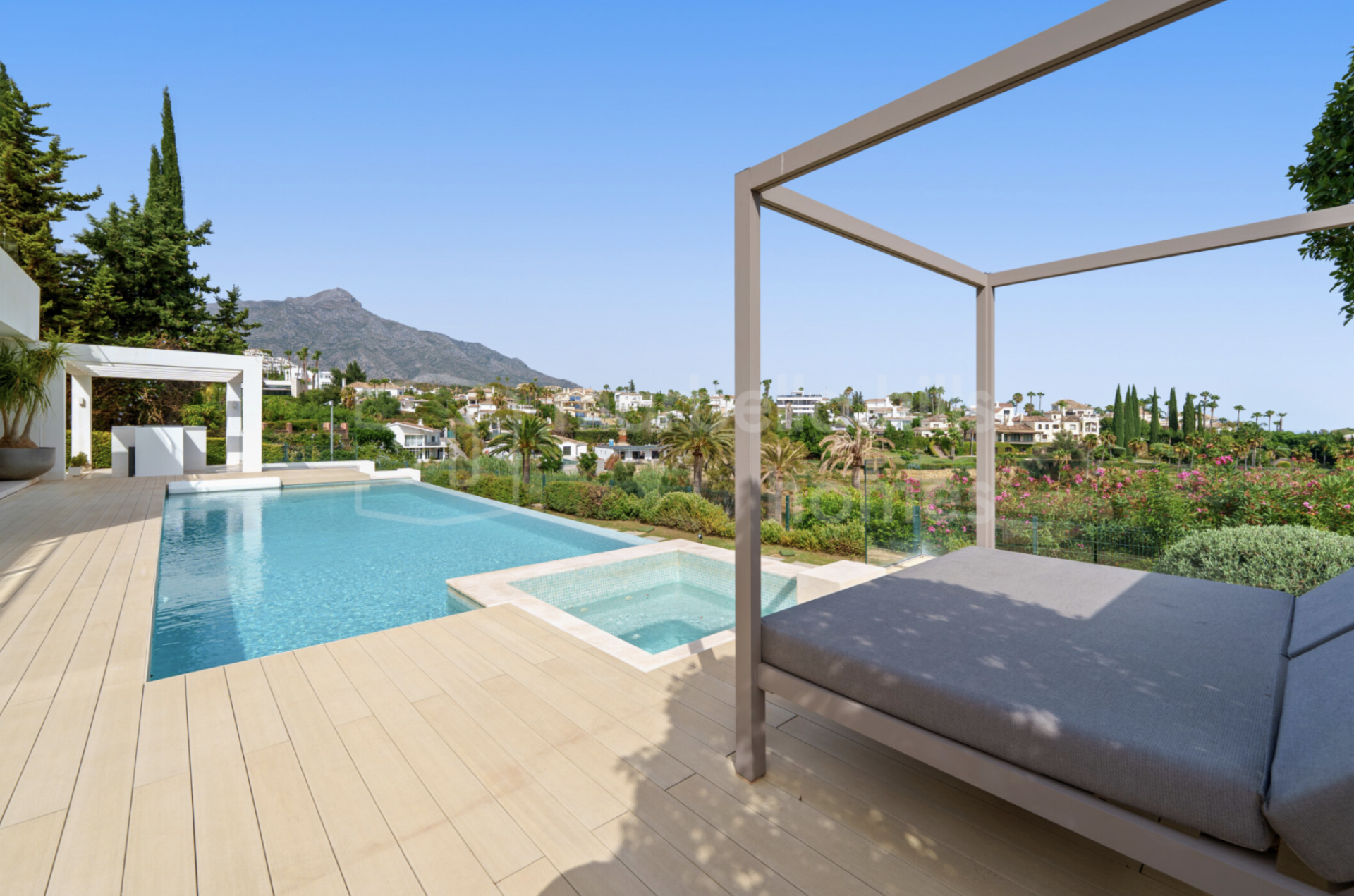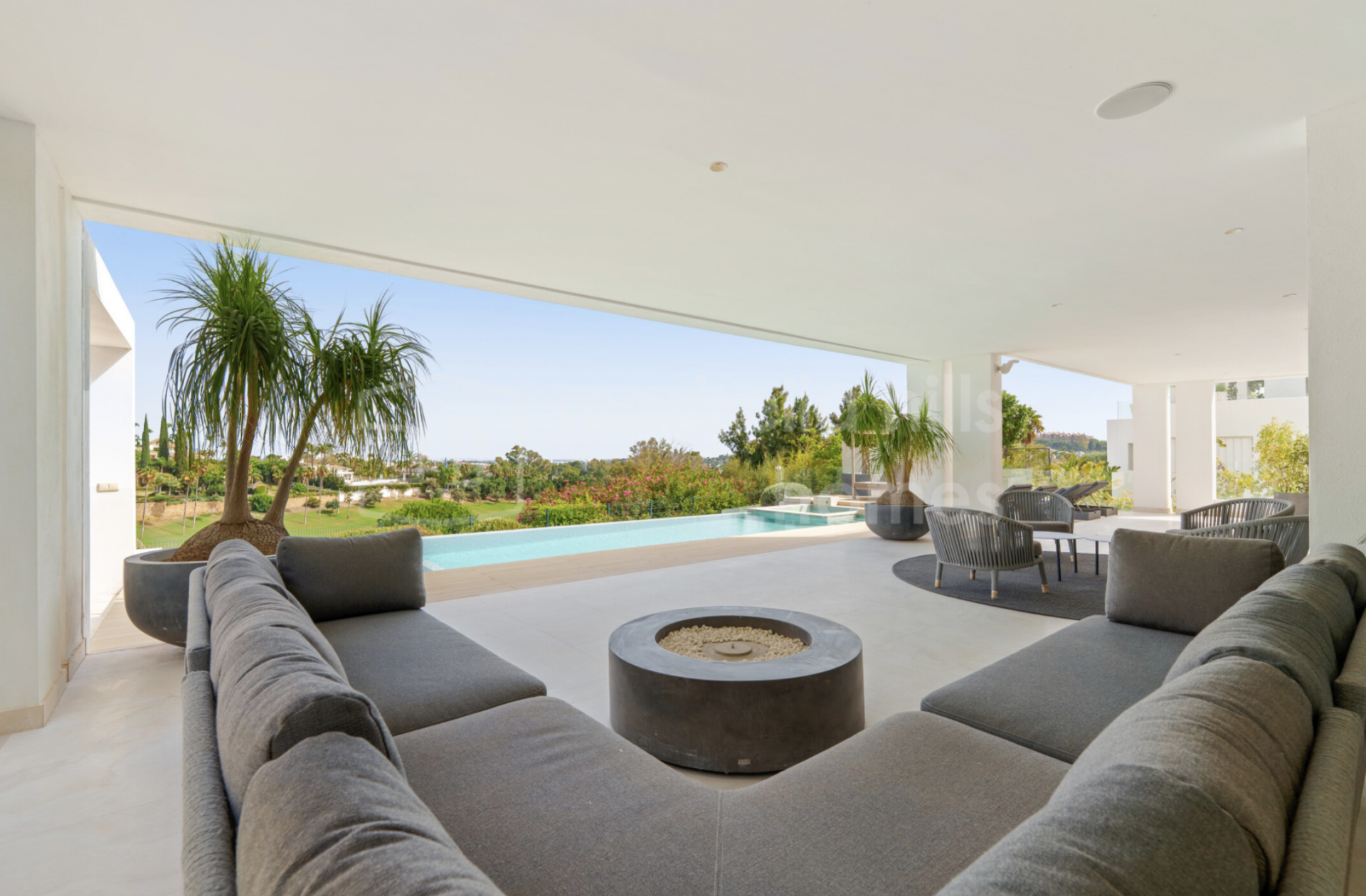 L’extérieur de la villa a été pensé pour une utilisation tout au long de l’année. Les jardins paysagers entourent la piscine à débordement, tandis que de multiples terrasses offrent des espaces variés pour se détendre ou se divertir. Un salon extérieur encastré, une cuisine d’été et plusieurs zones chill-out subliment l’expérience du style de vie méditerranéen.