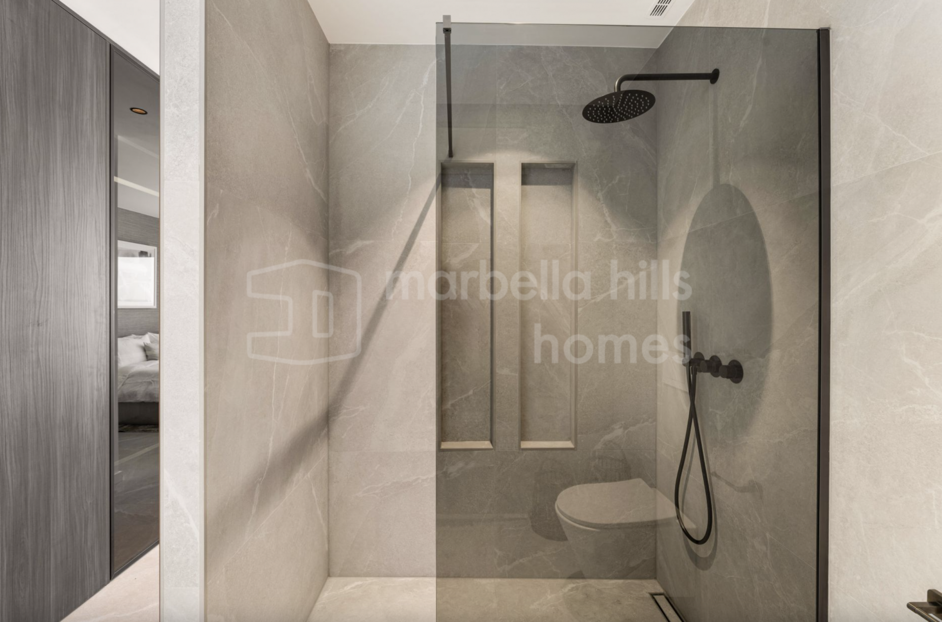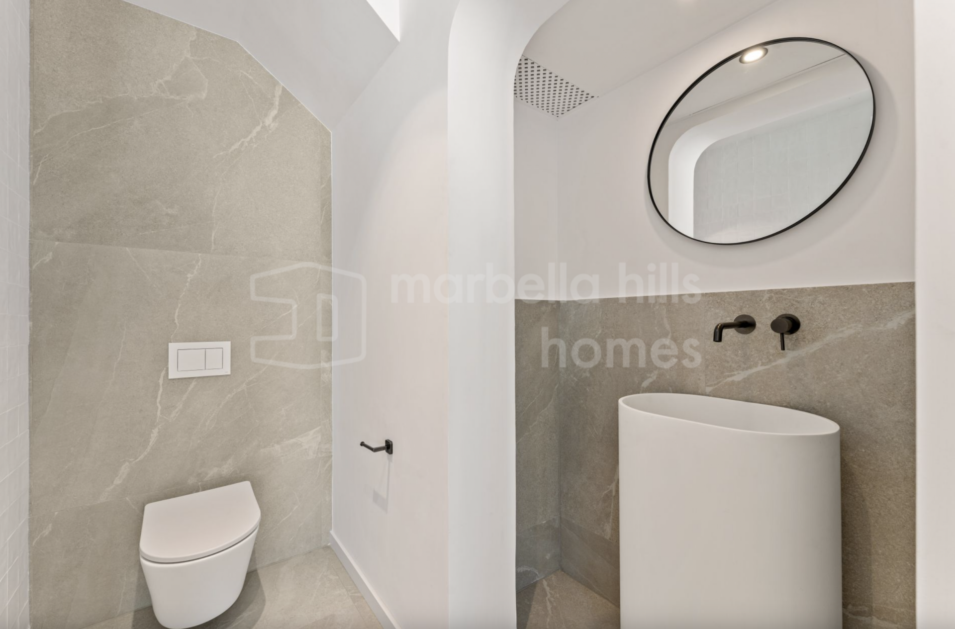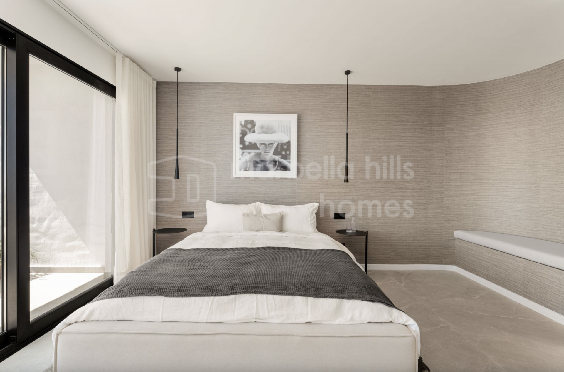 À l’étage, les trois chambres avec salle de bains privative sont conçues pour offrir intimité et confort. Chacune dispose d’un accès direct à une terrasse privée avec vue sur la mer Méditerranée et les montagnes environnantes. La suite principale se distingue par une terrasse plus vaste et un agencement spacieux, offrant un cadre idéal pour profiter de la douceur de vivre de la Costa del Sol.