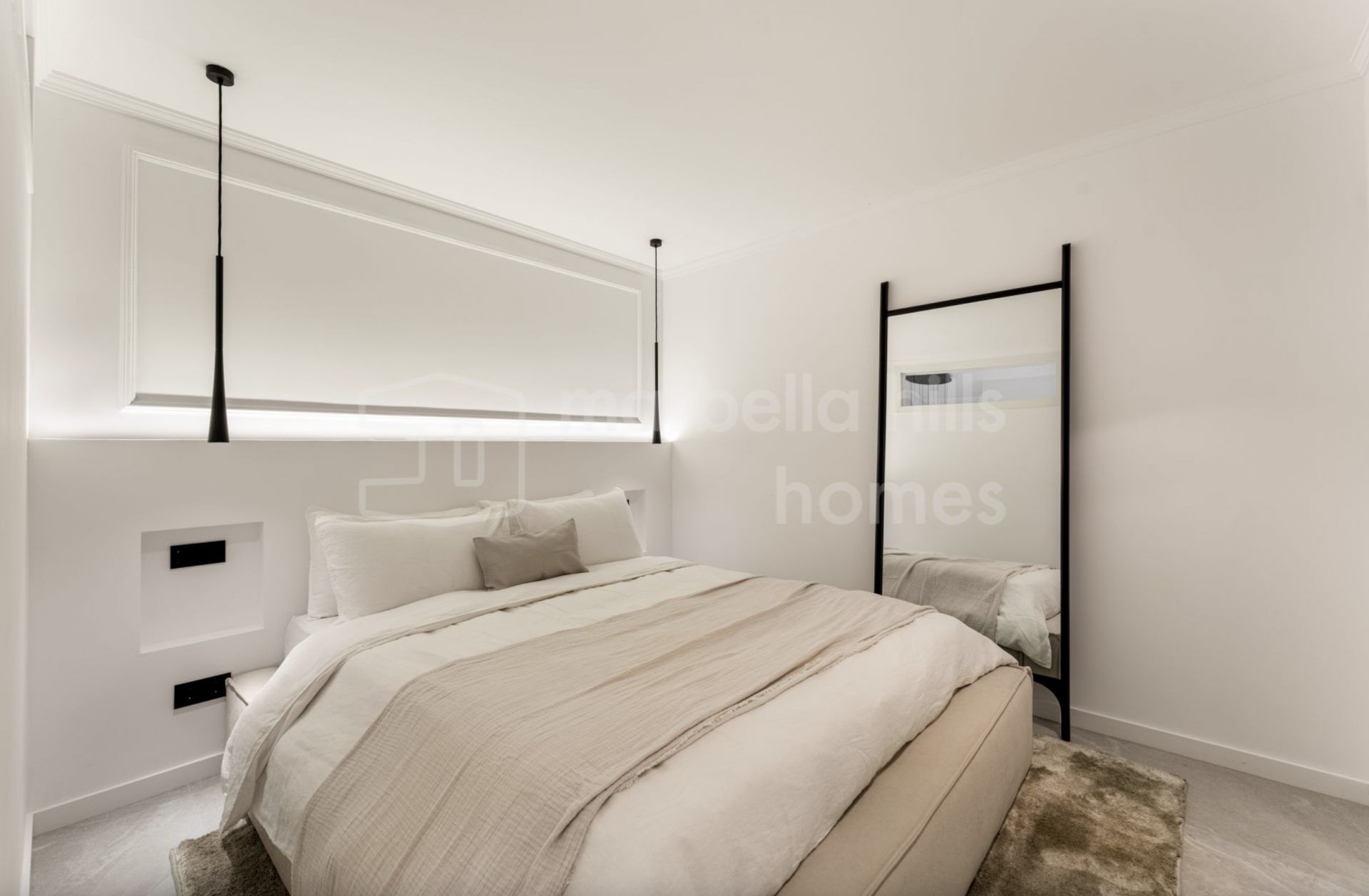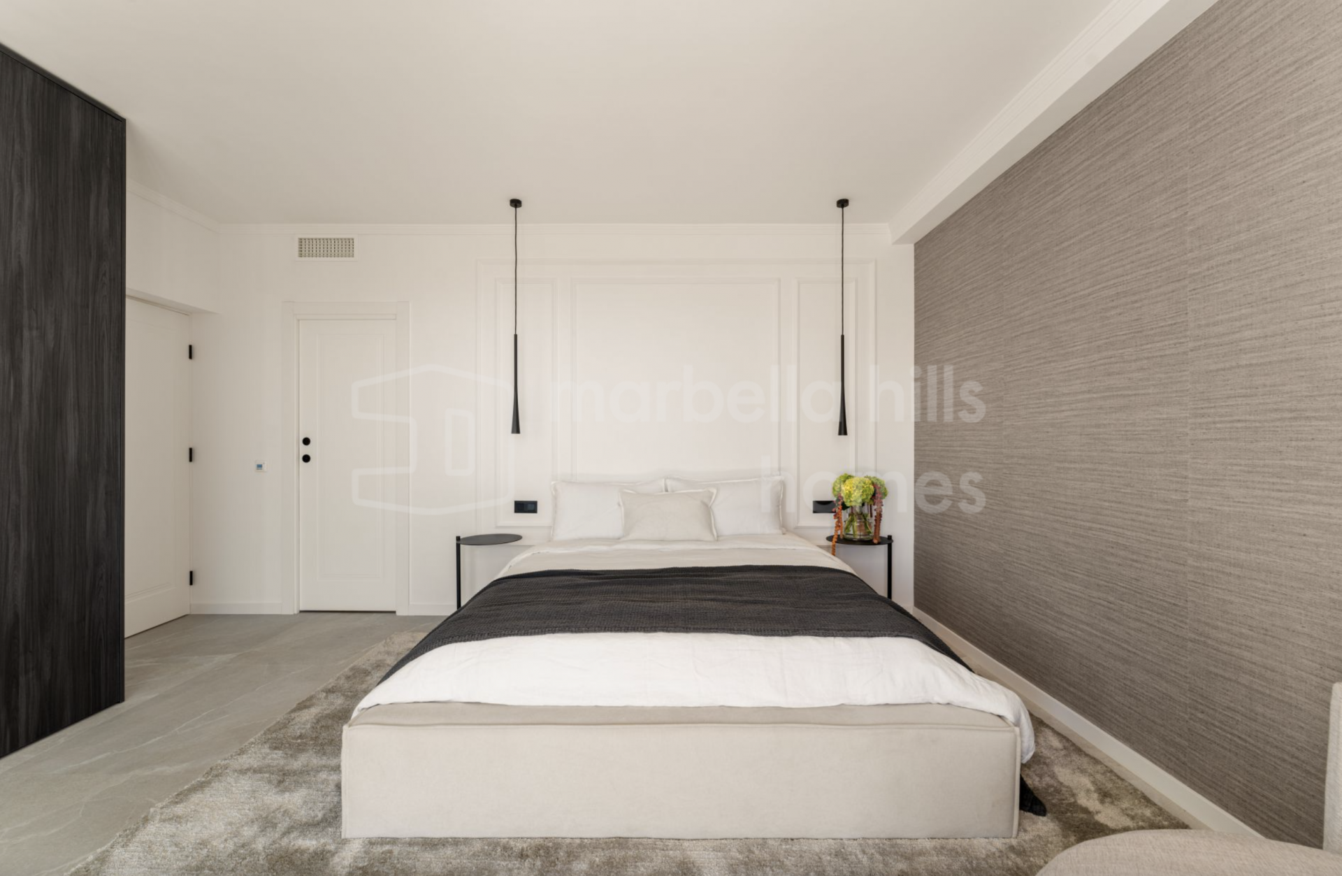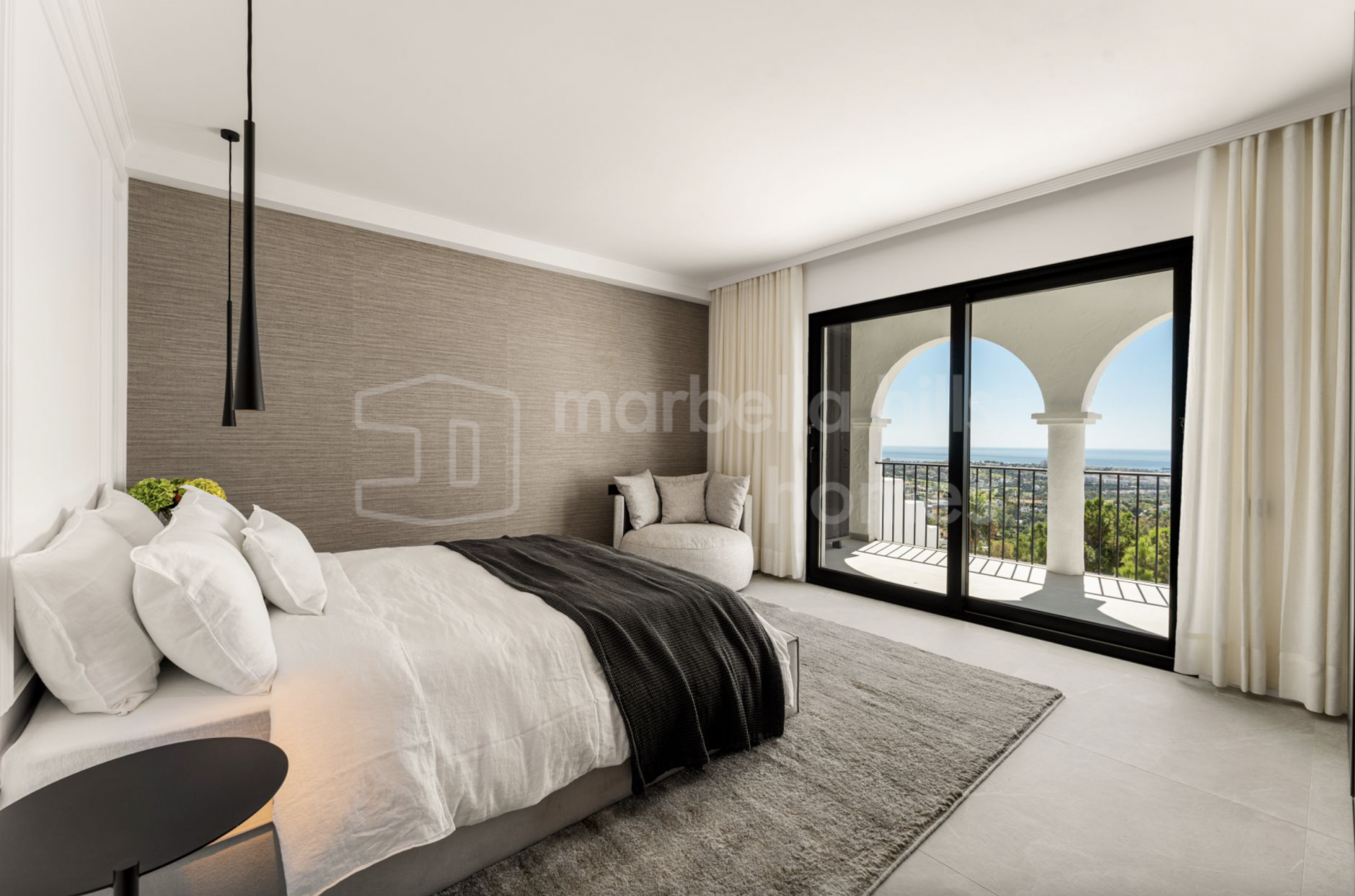 À l’étage, les trois chambres avec salle de bains privative sont conçues pour offrir intimité et confort. Chacune dispose d’un accès direct à une terrasse privée avec vue sur la mer Méditerranée et les montagnes environnantes. La suite principale se distingue par une terrasse plus vaste et un agencement spacieux, offrant un cadre idéal pour profiter de la douceur de vivre de la Costa del Sol.