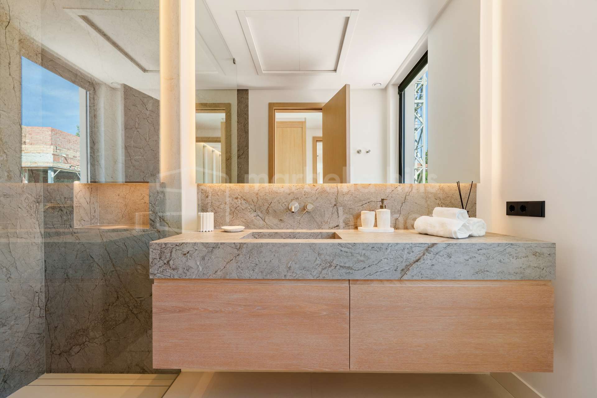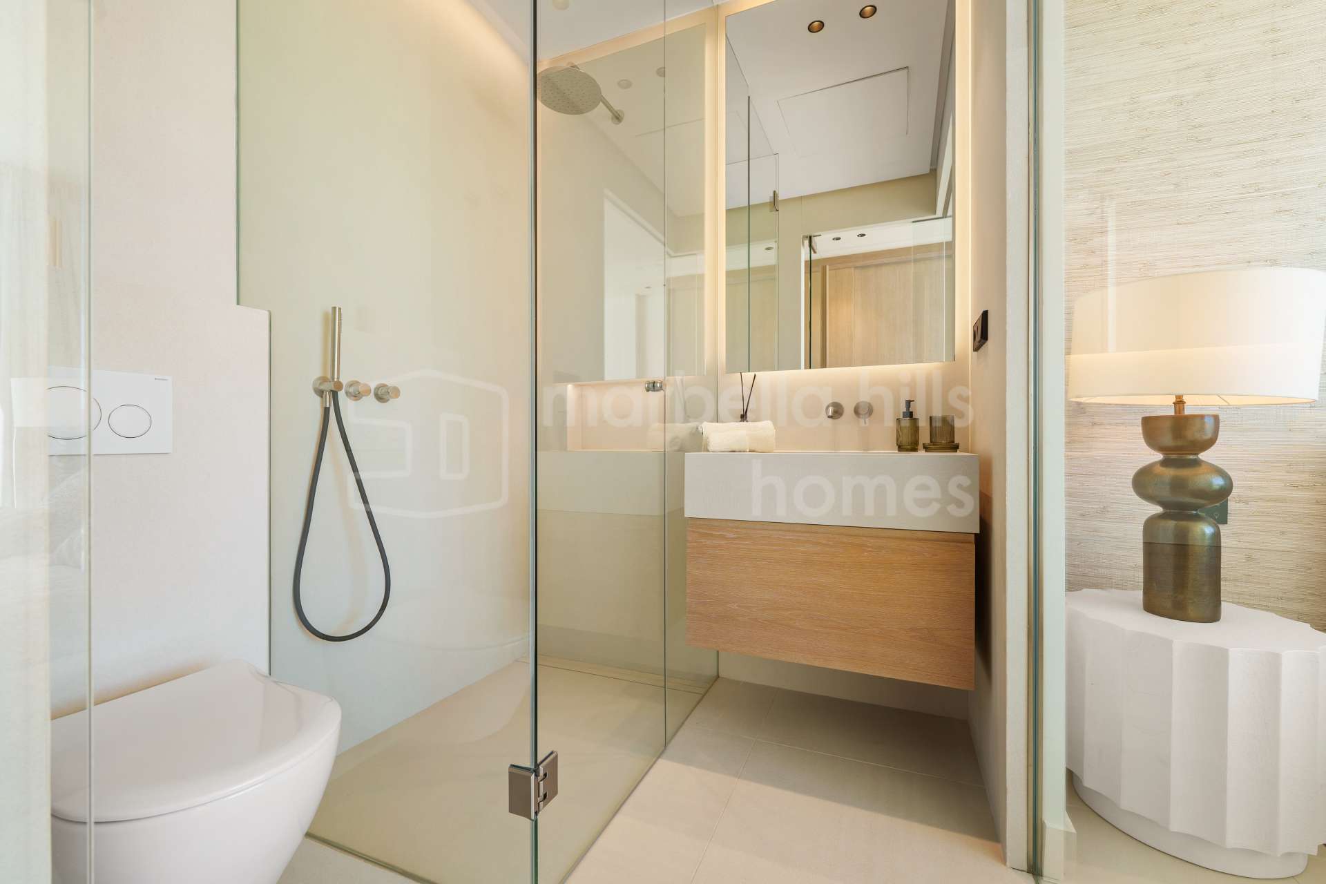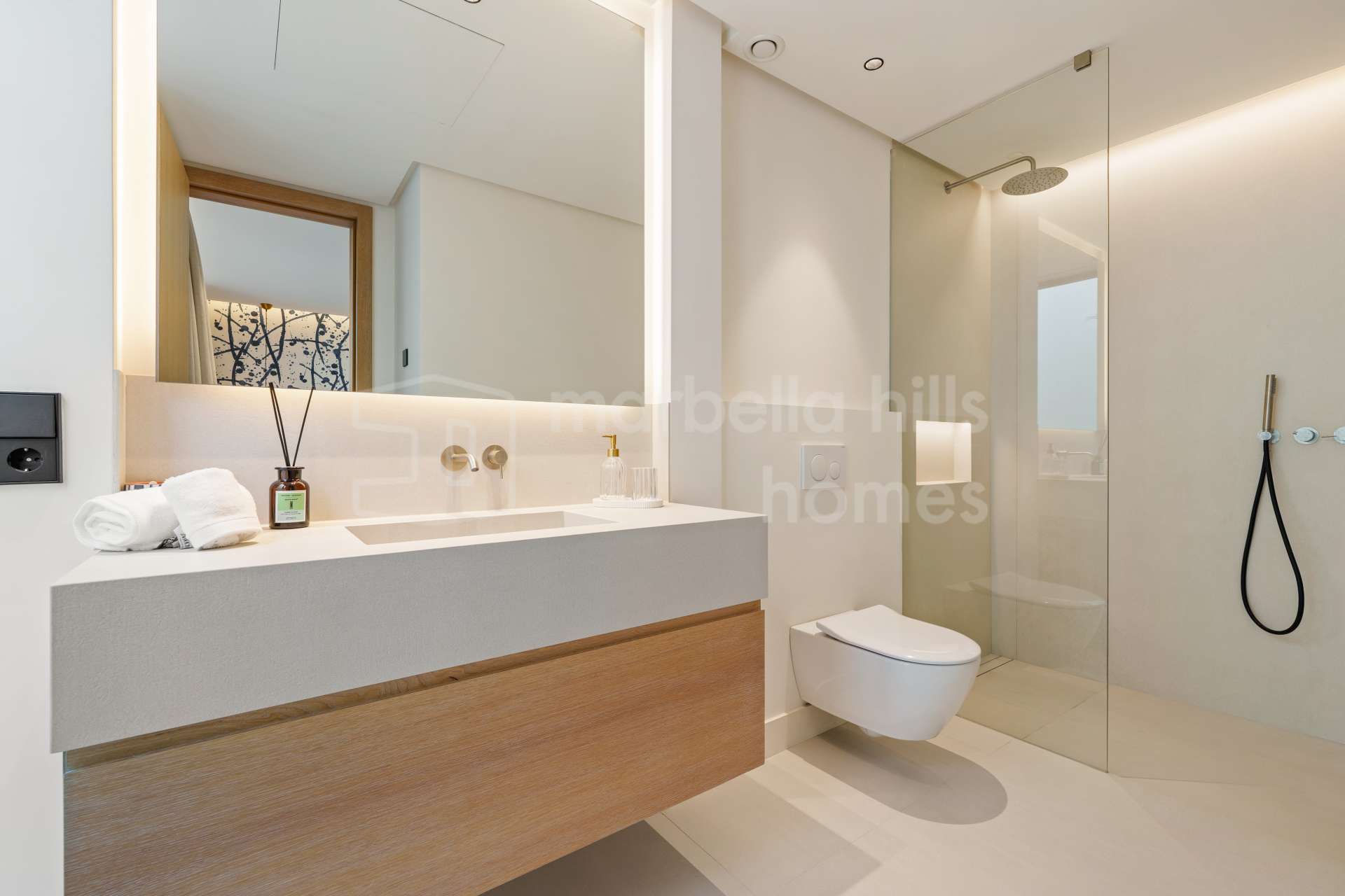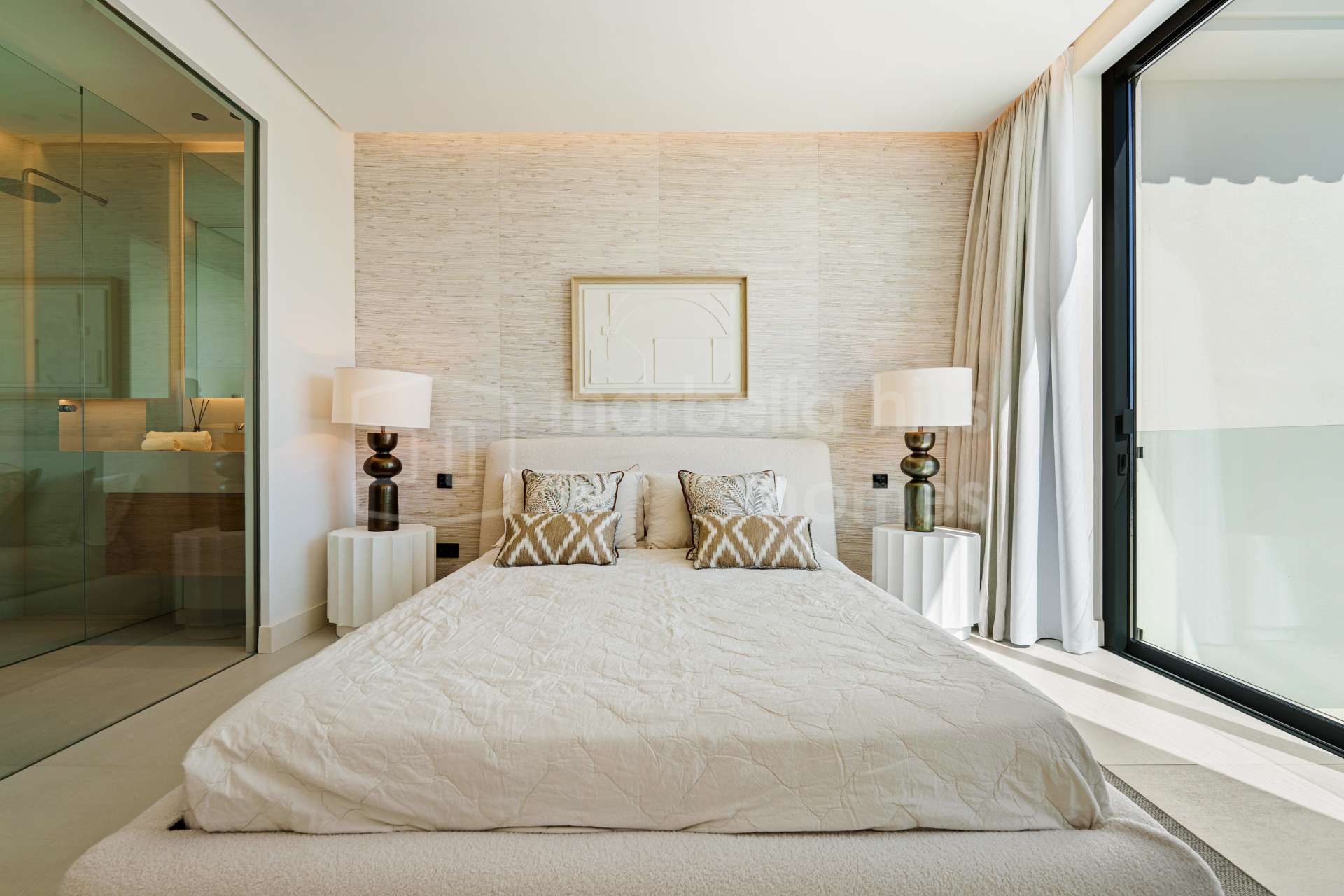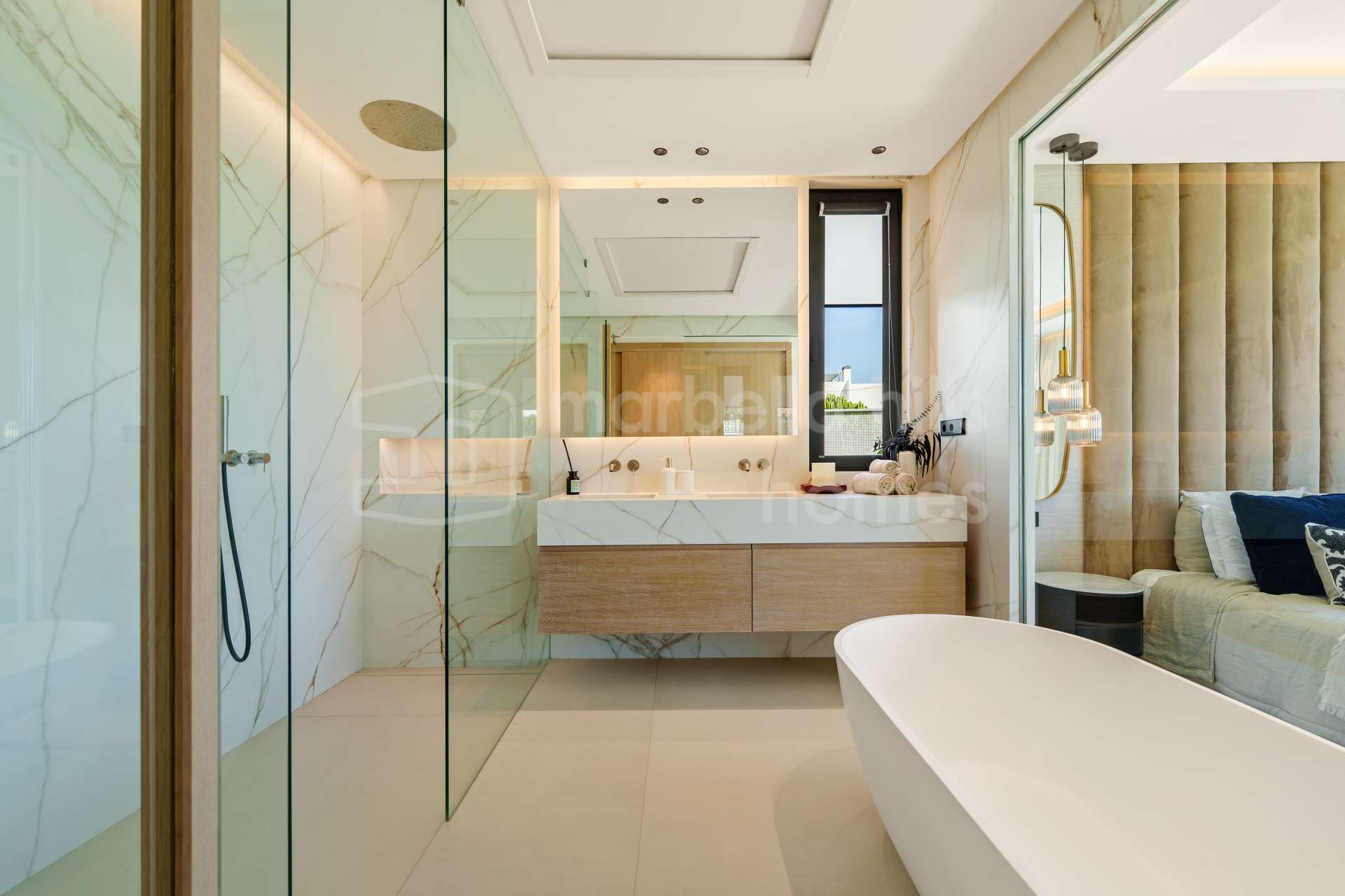 Les cinq chambres ont été conçues comme de véritables suites privées, avec accès direct aux terrasses, grandes portes vitrées et salles de bain attenantes élégantes, dotées de vasques suspendues, finitions en marbre et baignoires îlot. La suite parentale se distingue par ses dimensions généreuses, sa salle de bain luxueuse et sa terrasse privée, créant un espace intime et exclusif au sein de la maison.