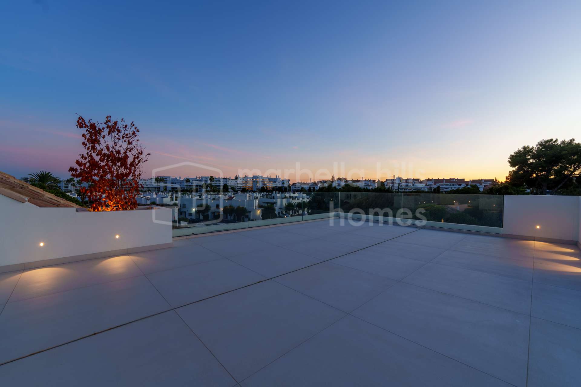 Implantée sur un terrain privé de 612 m², la propriété offre 446 m² d’espace intérieur et 218 m² de terrasses, entourées de végétation et d’une façade blanche aux lignes épurées. Les espaces extérieurs sont pensés pour la détente et la convivialité, avec une piscine privée, une élégante terrasse en bois, de vastes espaces couverts pour les repas et les moments de détente, ainsi qu’un spectaculaire solarium sur le toit avec vues panoramiques.