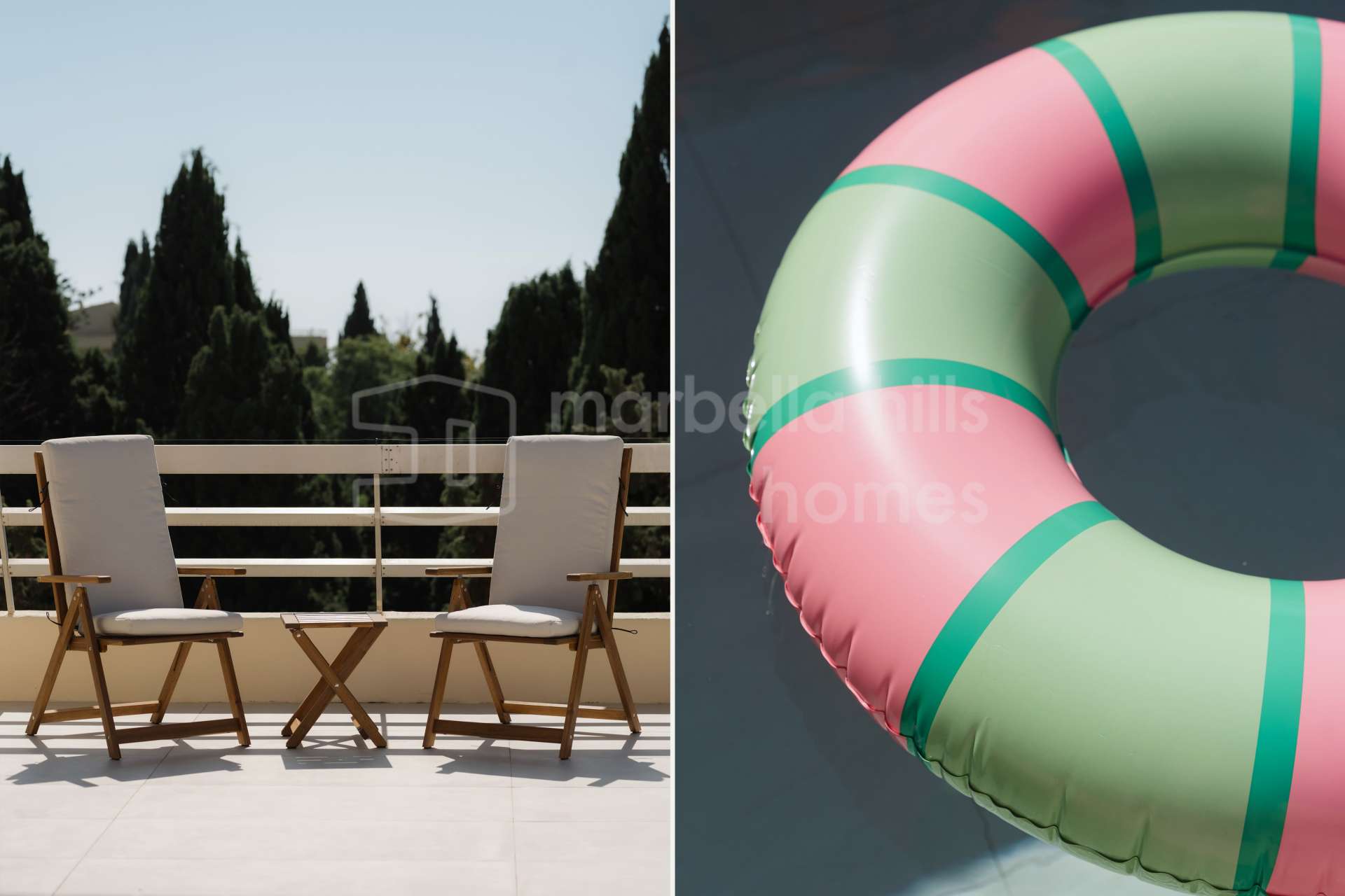 Le véritable atout de cette propriété est la terrasse sur le toit — un véritable havre de paix au cœur de la ville — équipée d’une élégante piscine, d’un coin repas extérieur et d’espaces lounge confortables offrant une vue panoramique sur Marbella et la célèbre montagne de La Concha. C’est l’endroit idéal pour profiter de matinées paisibles, de dîners au coucher du soleil ou de soirées entre amis sous les étoiles.