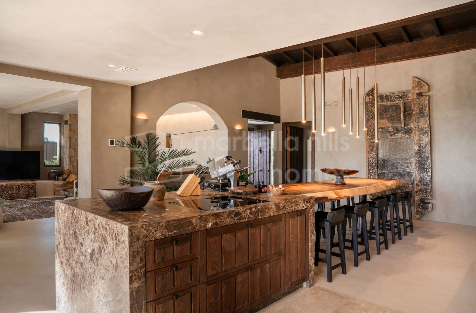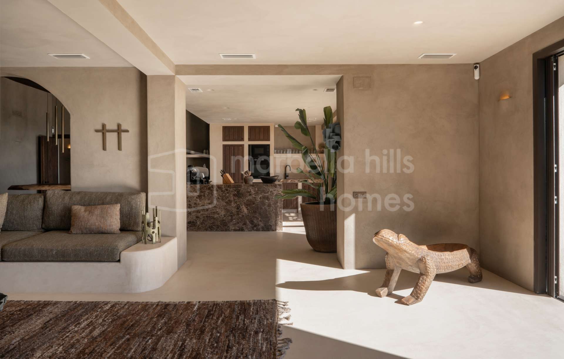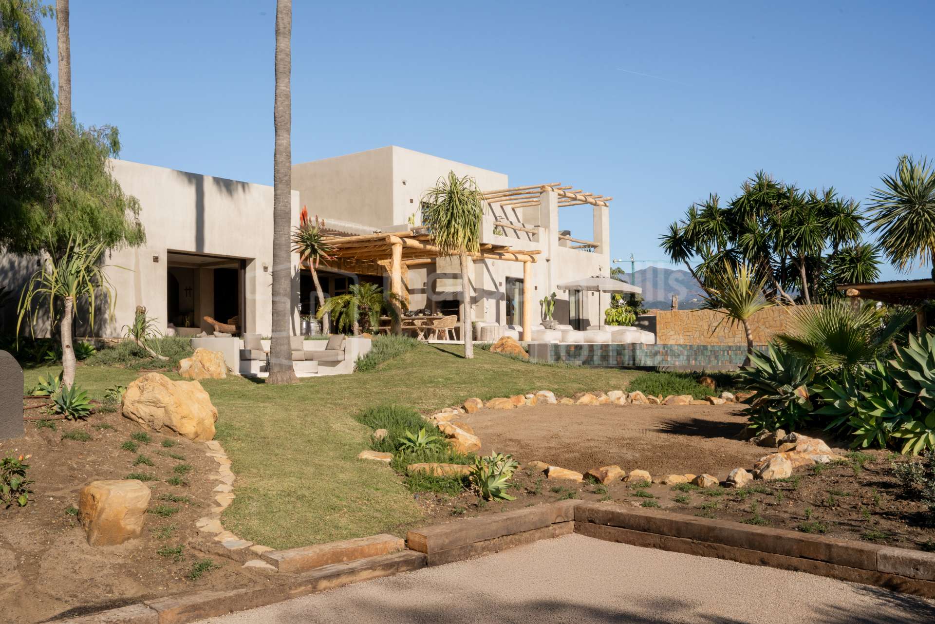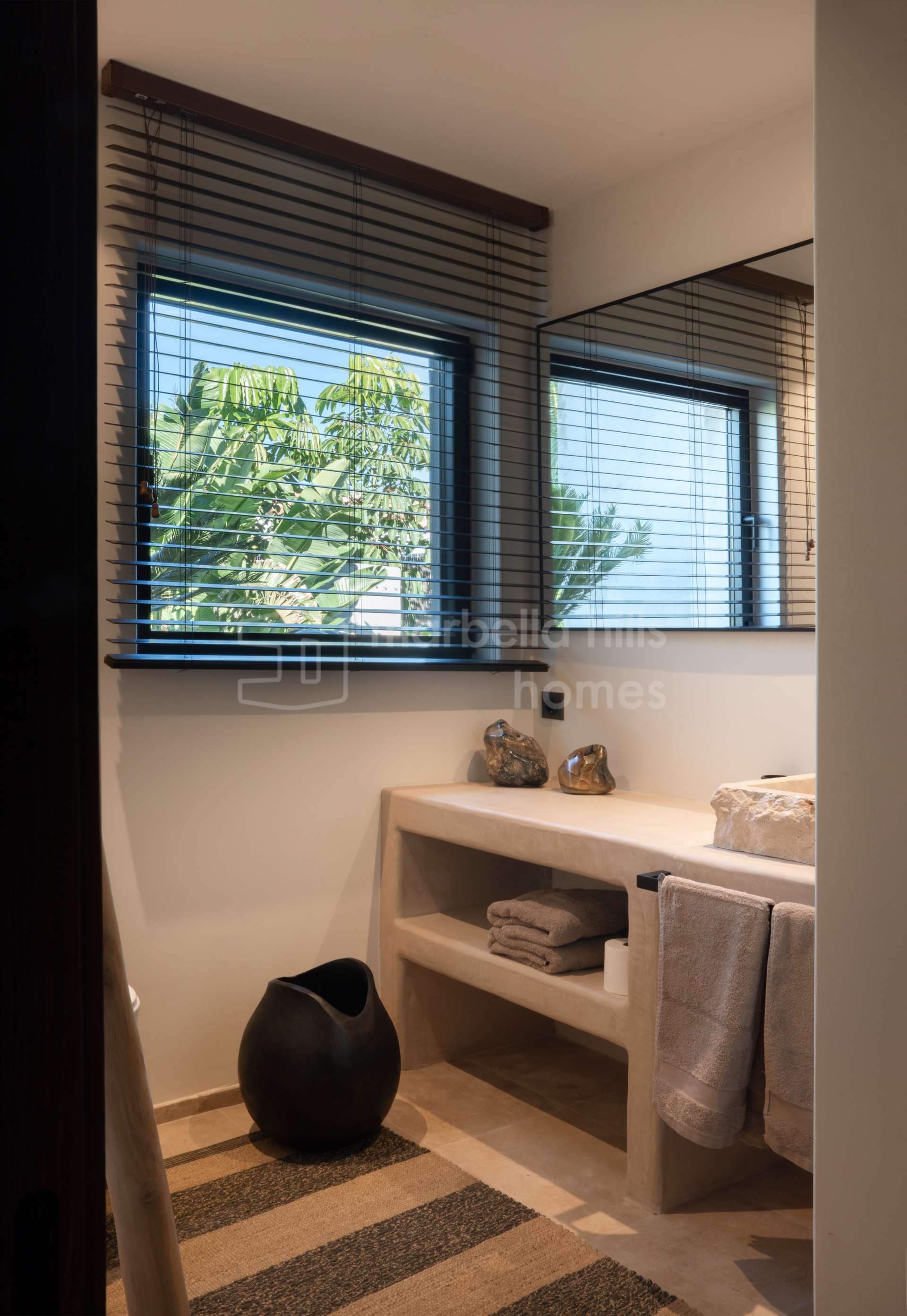 Découvrez une villa véritablement exceptionnelle à Selwo, Estepona — une propriété unique entièrement rénovée en 2024, inspirée par les styles du Mexique, de la Thaïlande, d’Ibiza et de l’Andalousie. Ce chef-d’œuvre architectural allie charme exotique et élégance méditerranéenne contemporaine, offrant de magnifiques vues sur la mer depuis le jardin et la piscine à débordement.