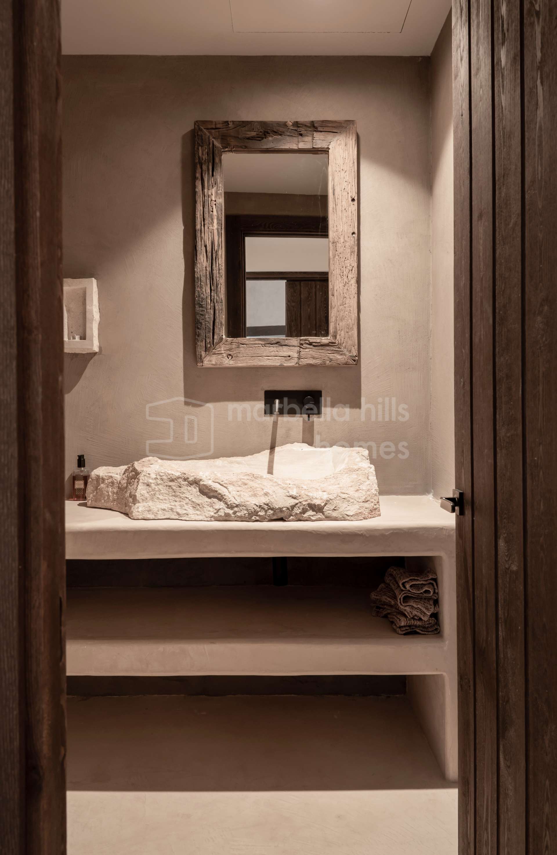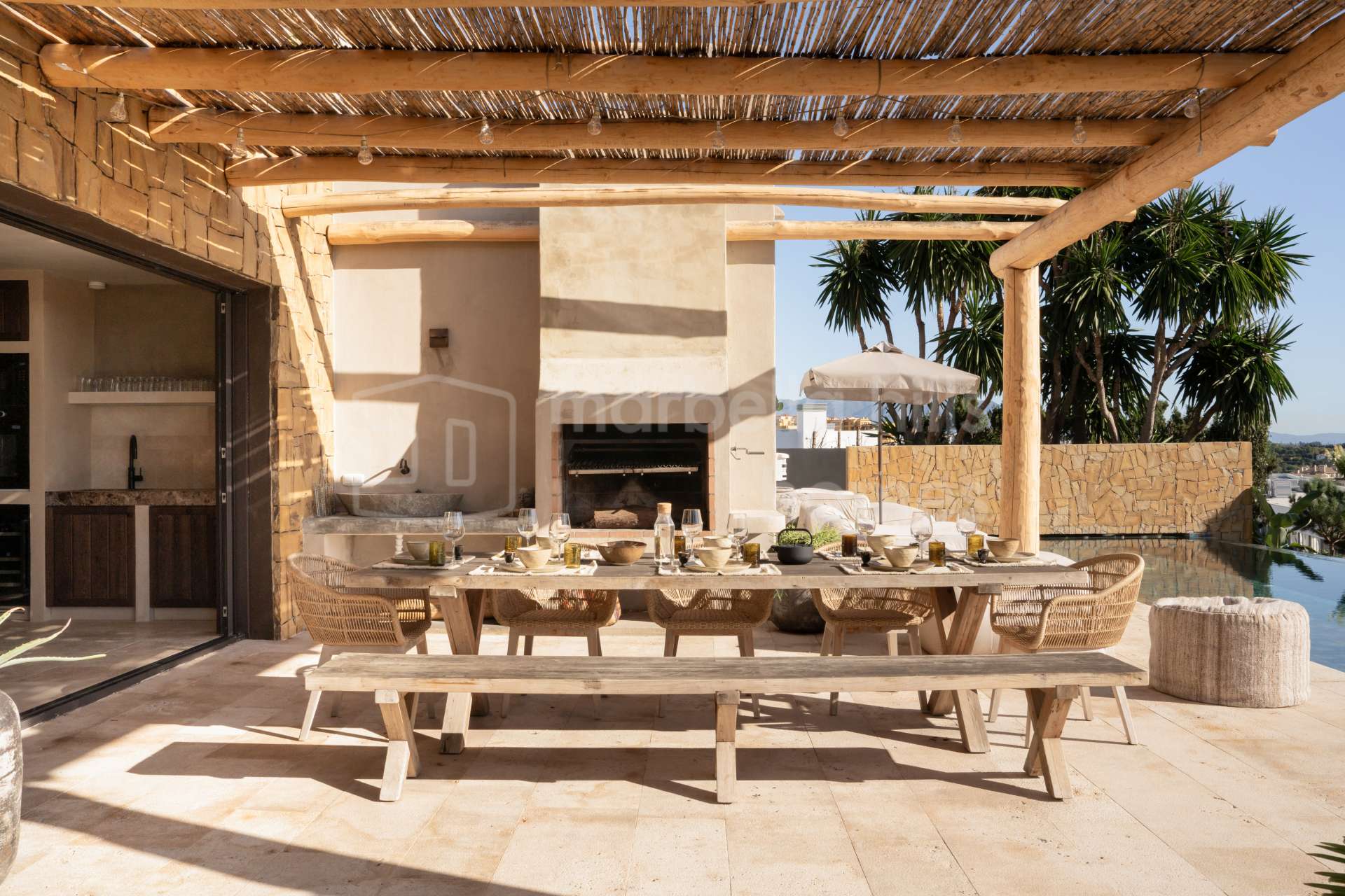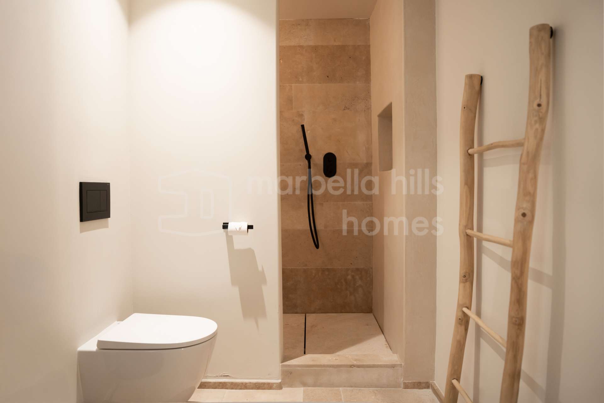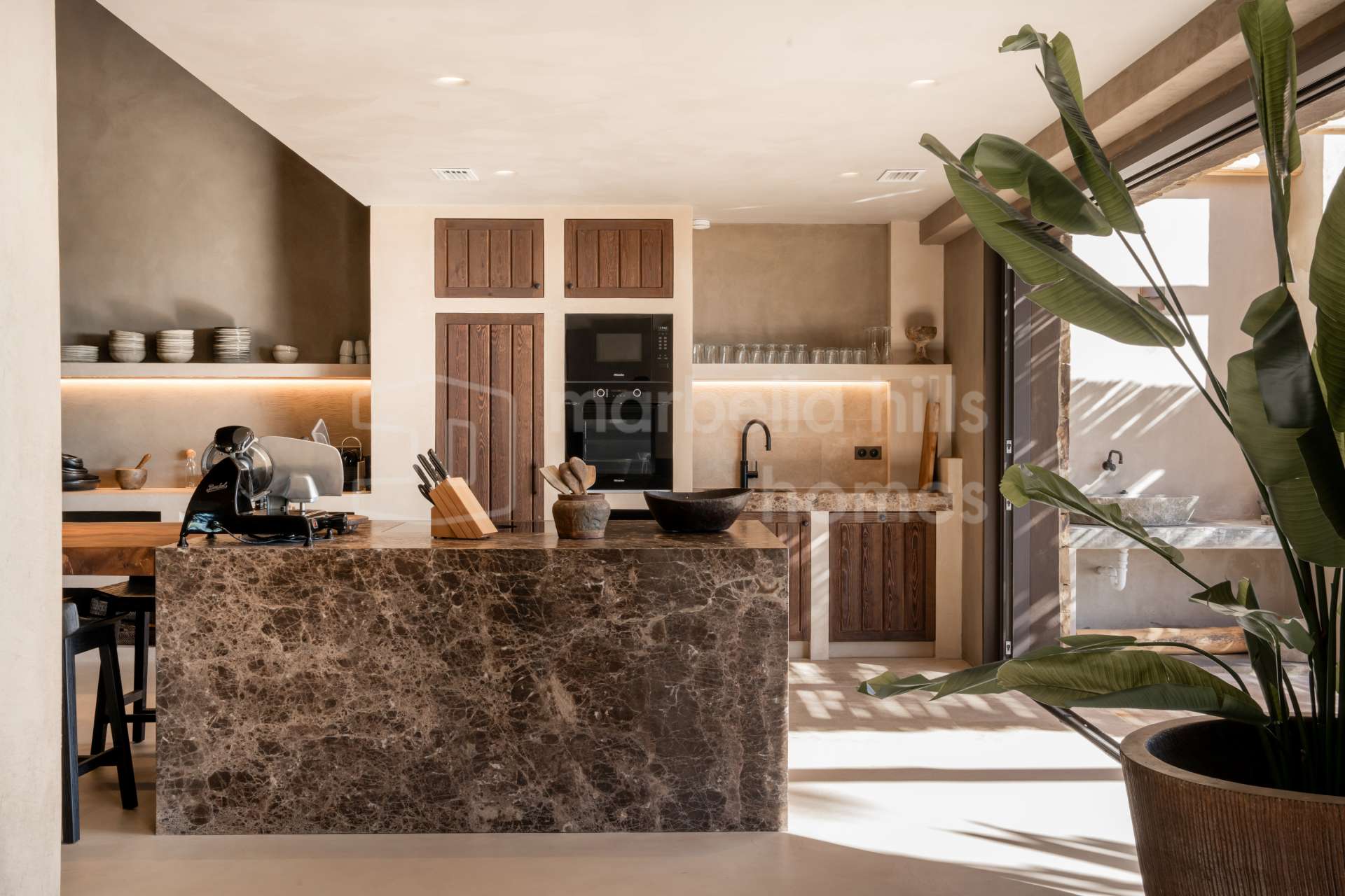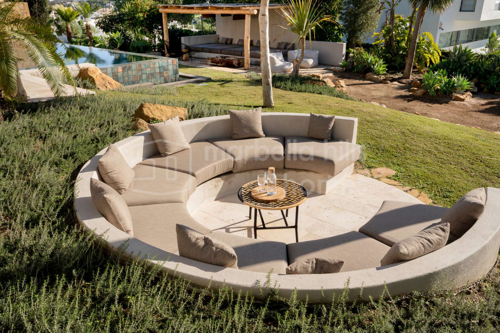 Les extérieurs sont conçus pour profiter du climat privilégié de la Costa del Sol tout au long de l’année. Ils comprennent une piscine à débordement chauffée avec salle de douche attenante, un carport pour deux voitures, ainsi que plusieurs espaces de détente. Le jardin, magnifiquement aménagé, offre un coin lounge sous une pergola exotique, un terrain de pétanque et de nombreux espaces pour se relaxer. La terrasse principale est équipée d’un barbecue argentin et d’une élégante table en bois pour des repas en plein air face à la mer.