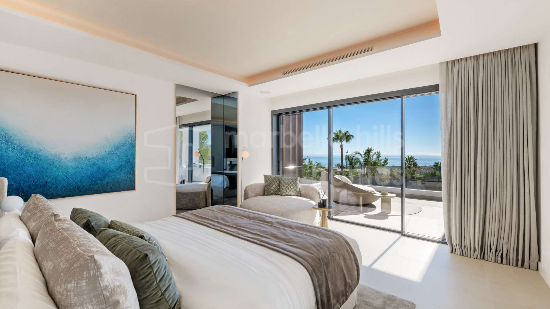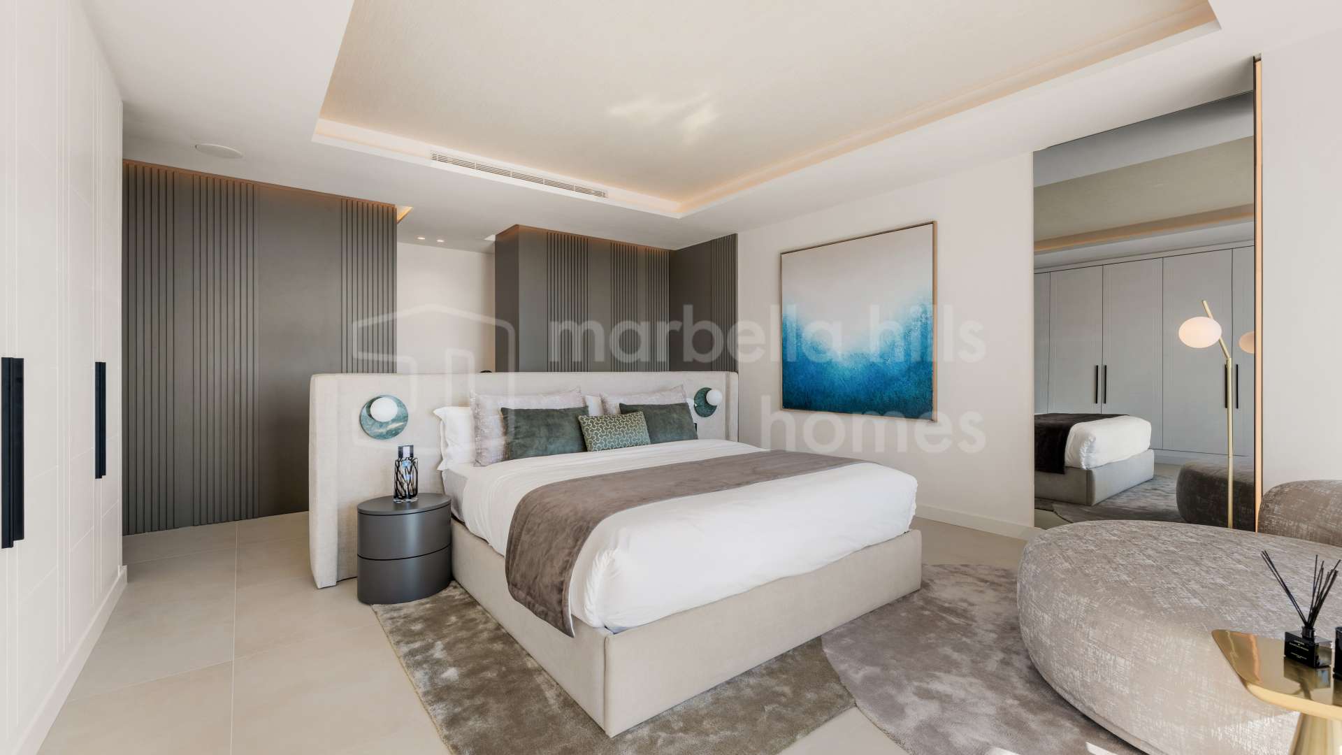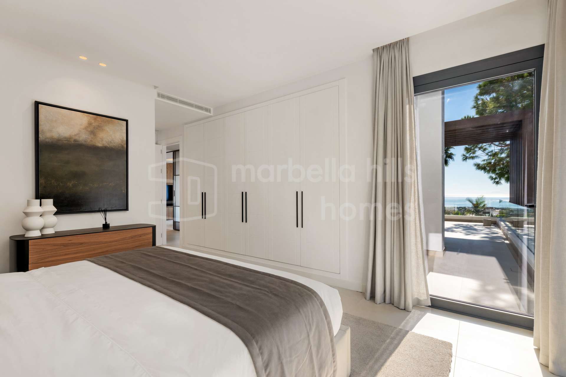 L’étage abrite trois chambres élégantes, chacune avec accès à une grande terrasse offrant des vues panoramiques à couper le souffle sur la côte de Marbella, la Méditerranée, Gibraltar et, par temps clair, les côtes africaines. La suite principale dispose d’une salle de bain privée et d’un dressing, créant un véritable havre de paix.