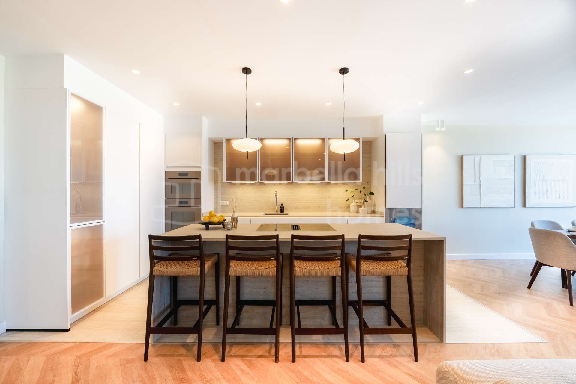 De larges baies vitrées coulissantes s’ouvrent sur la terrasse orientée plein sud, laissant entrer une abondante lumière naturelle et créant une parfaite continuité entre les espaces intérieurs et extérieurs. La terrasse dispose d’une cuisine extérieure, d’un salon lounge et d’un espace repas en plein air, idéal pour profiter du climat exceptionnel de Marbella toute l’année.
