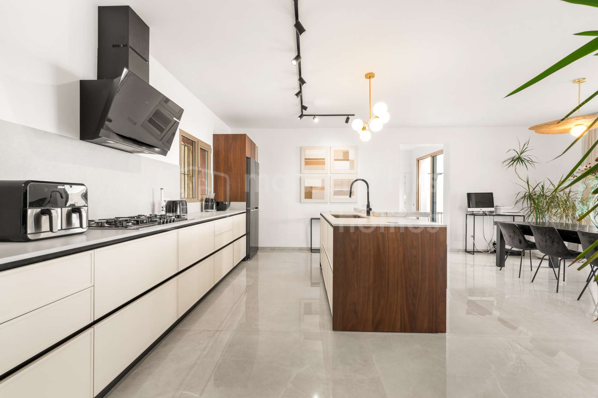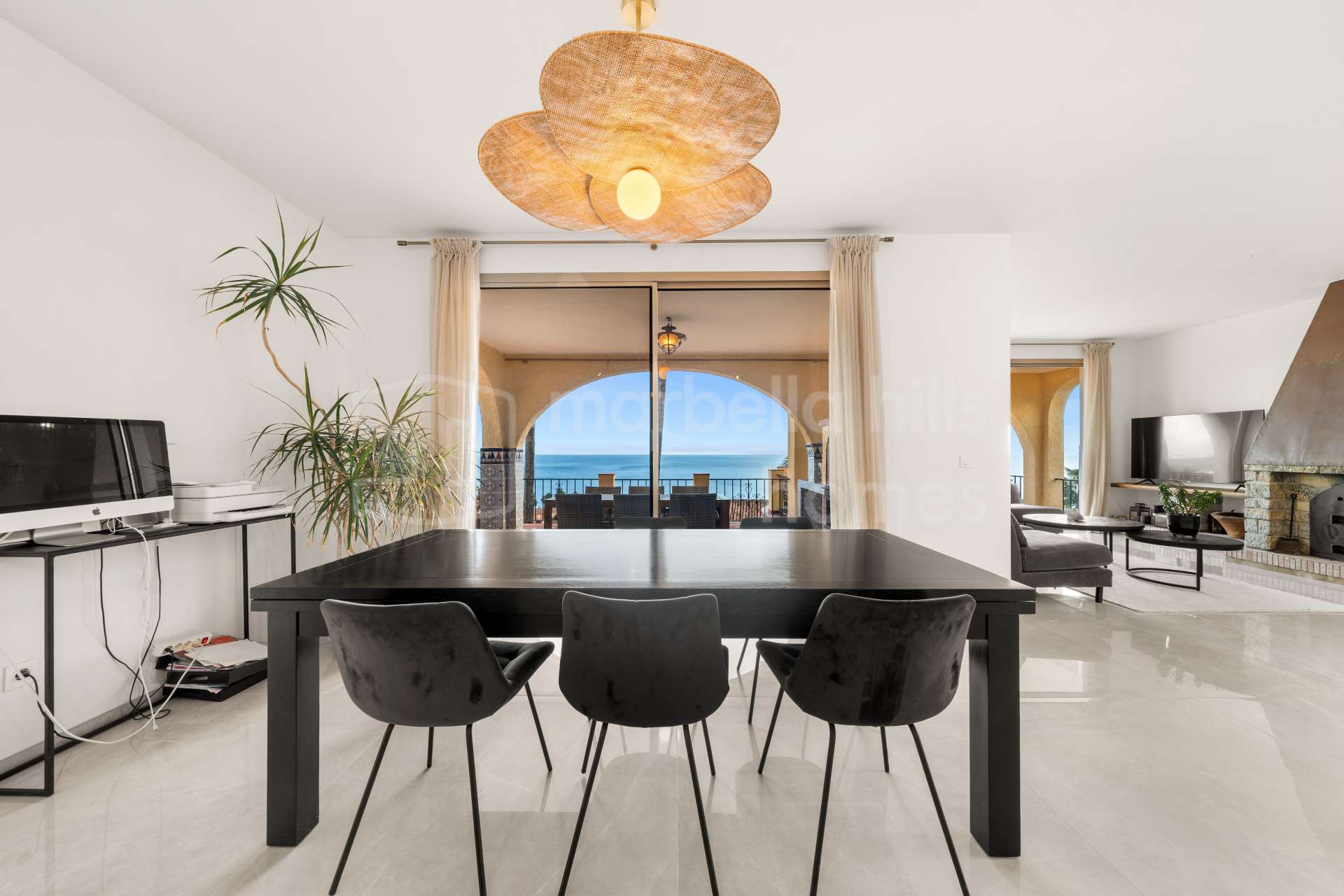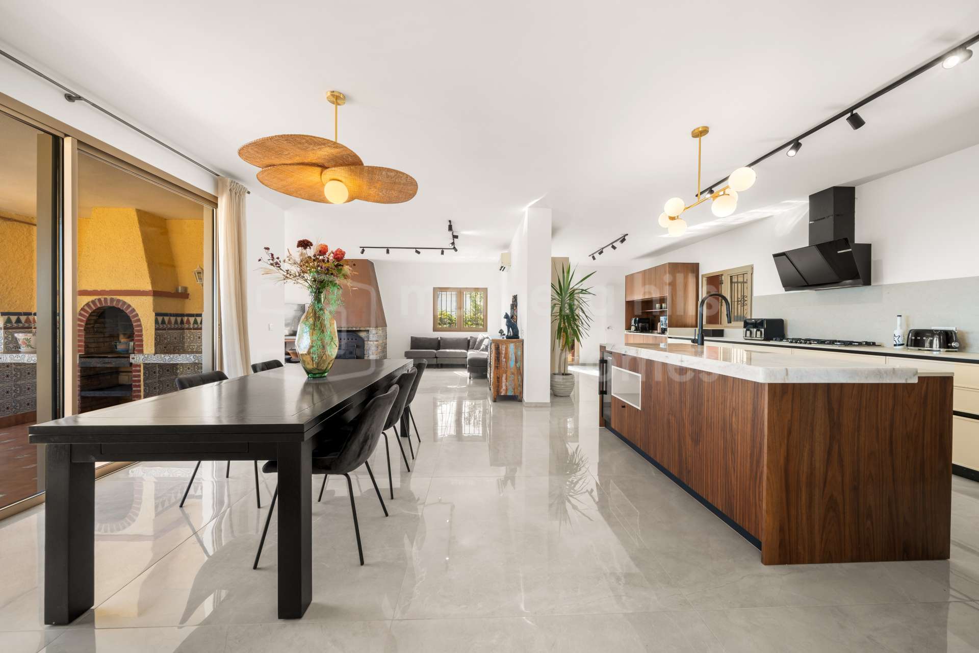 Édifiée sur un terrain de 1 195 m², la propriété dispose de 608 m² construits et de 136 m² de terrasses. À l’intérieur, la villa comprend sept chambres spacieuses, six salles de bain et un toilette invités, offrant un confort généreux pour la famille comme pour les invités. Le salon et la salle à manger à aire ouverte, agrémentés d’une cheminée design, créent une atmosphère à la fois élégante et conviviale, parfaitement intégrée à la cuisine moderne — un espace idéal pour recevoir ou profiter d’un style de vie détendu sur la Costa del Sol.