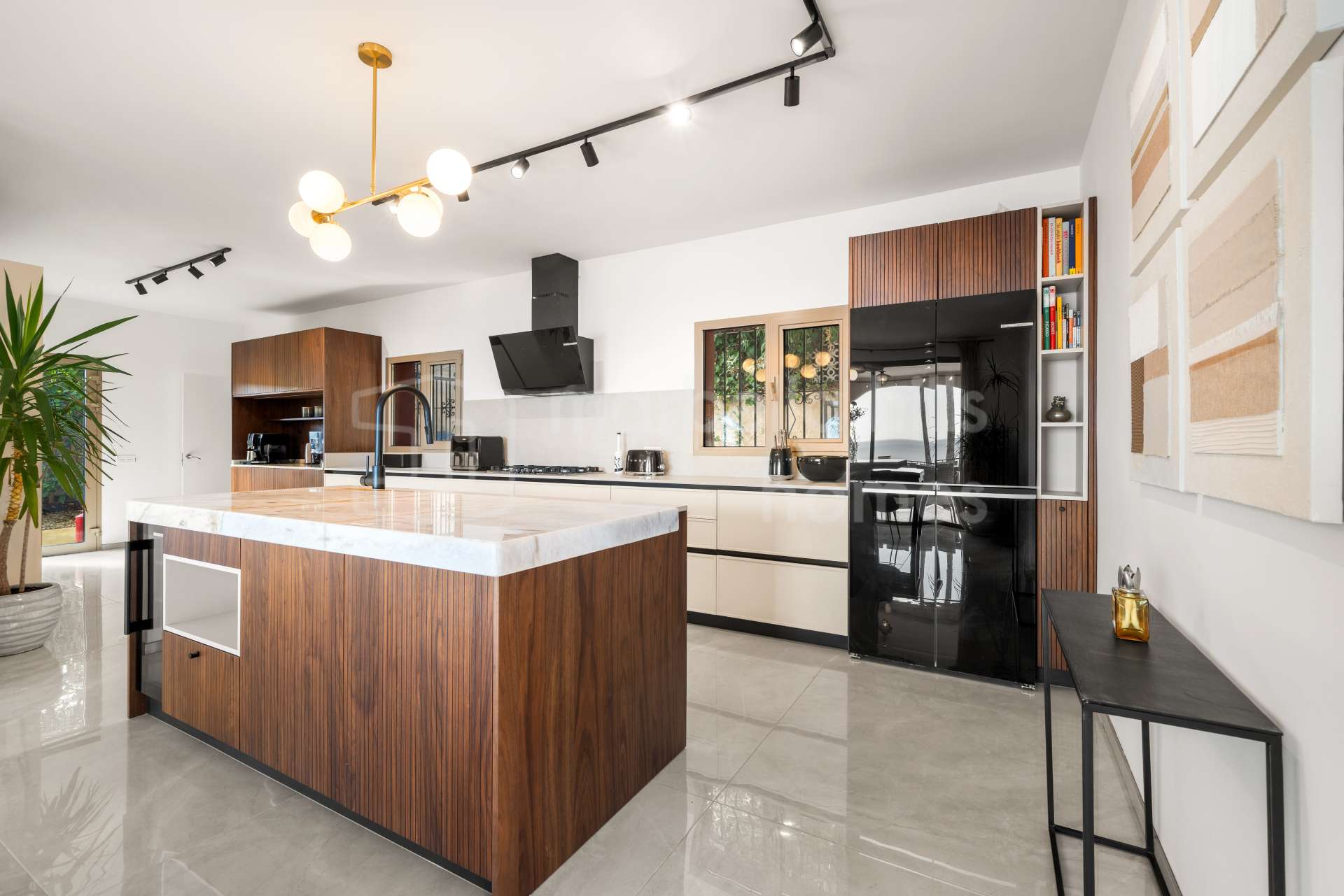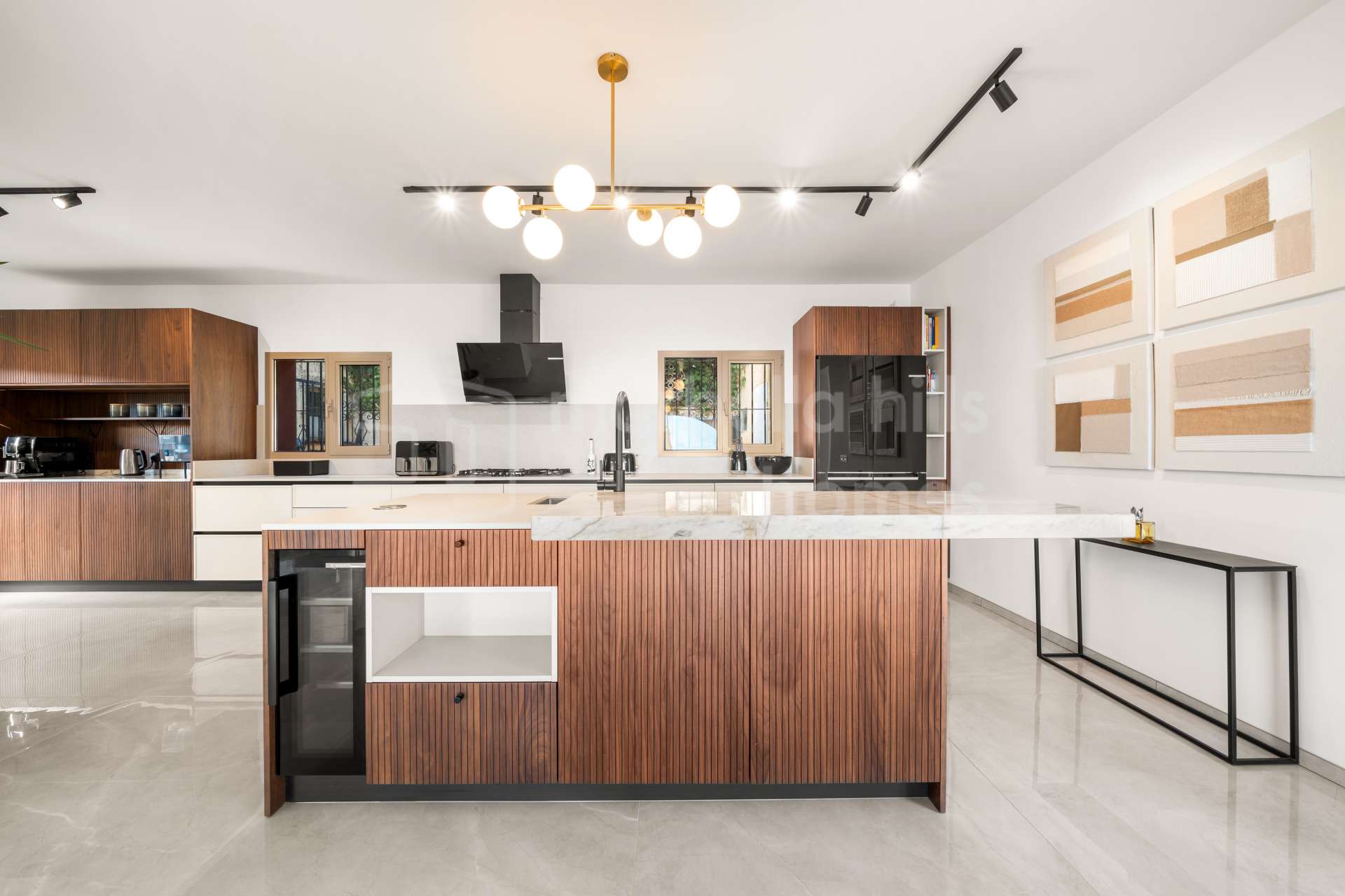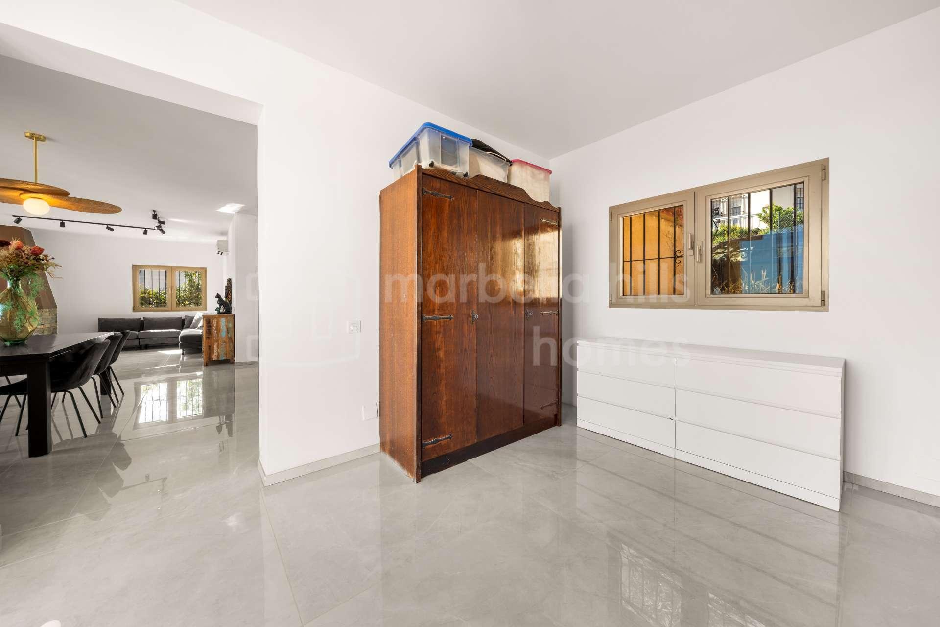 Édifiée sur un terrain de 1 195 m², la propriété dispose de 608 m² construits et de 136 m² de terrasses. À l’intérieur, la villa comprend sept chambres spacieuses, six salles de bain et un toilette invités, offrant un confort généreux pour la famille comme pour les invités. Le salon et la salle à manger à aire ouverte, agrémentés d’une cheminée design, créent une atmosphère à la fois élégante et conviviale, parfaitement intégrée à la cuisine moderne — un espace idéal pour recevoir ou profiter d’un style de vie détendu sur la Costa del Sol.