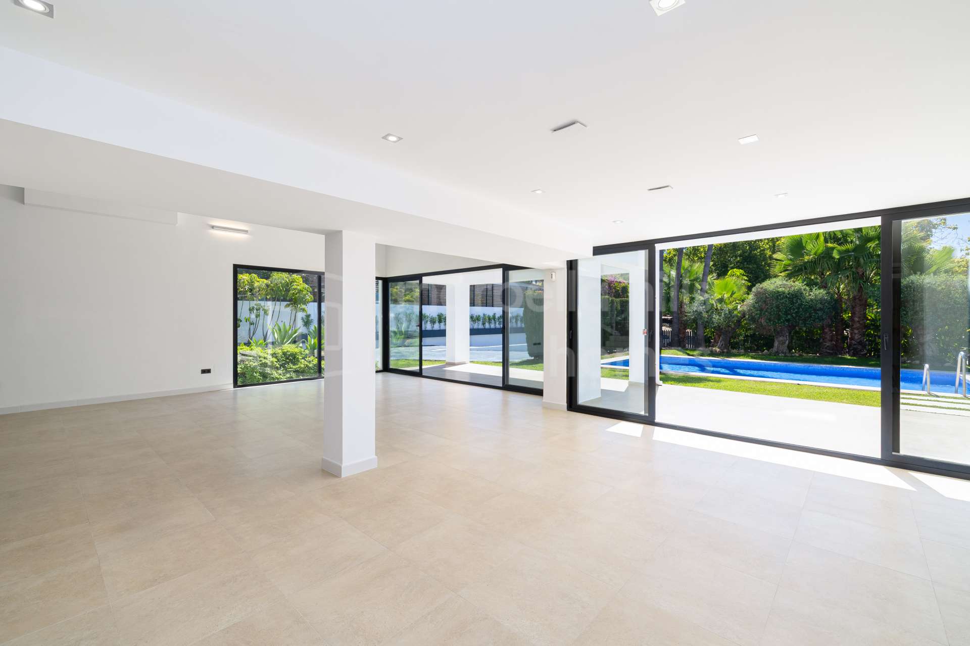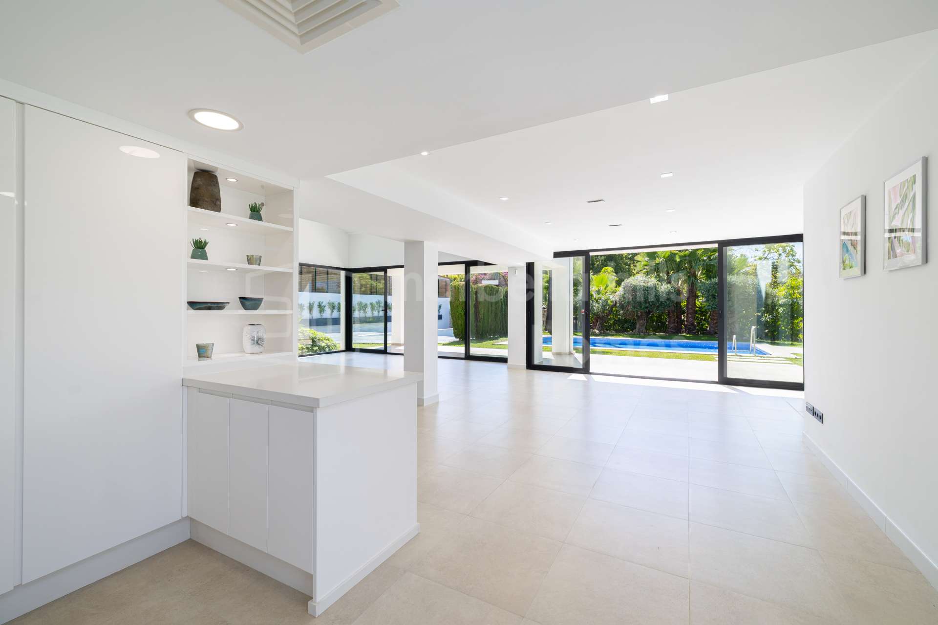 La cuisine ouverte est entièrement équipée avec des électroménagers Bosch haut de gamme et des meubles de qualité, et s’ouvre naturellement sur la salle à manger avec accès direct au jardin. Le salon, avec ses impressionnants plafonds à double hauteur, donne directement sur la terrasse couverte et la piscine, créant un espace parfait pour la vie quotidienne et les réceptions.