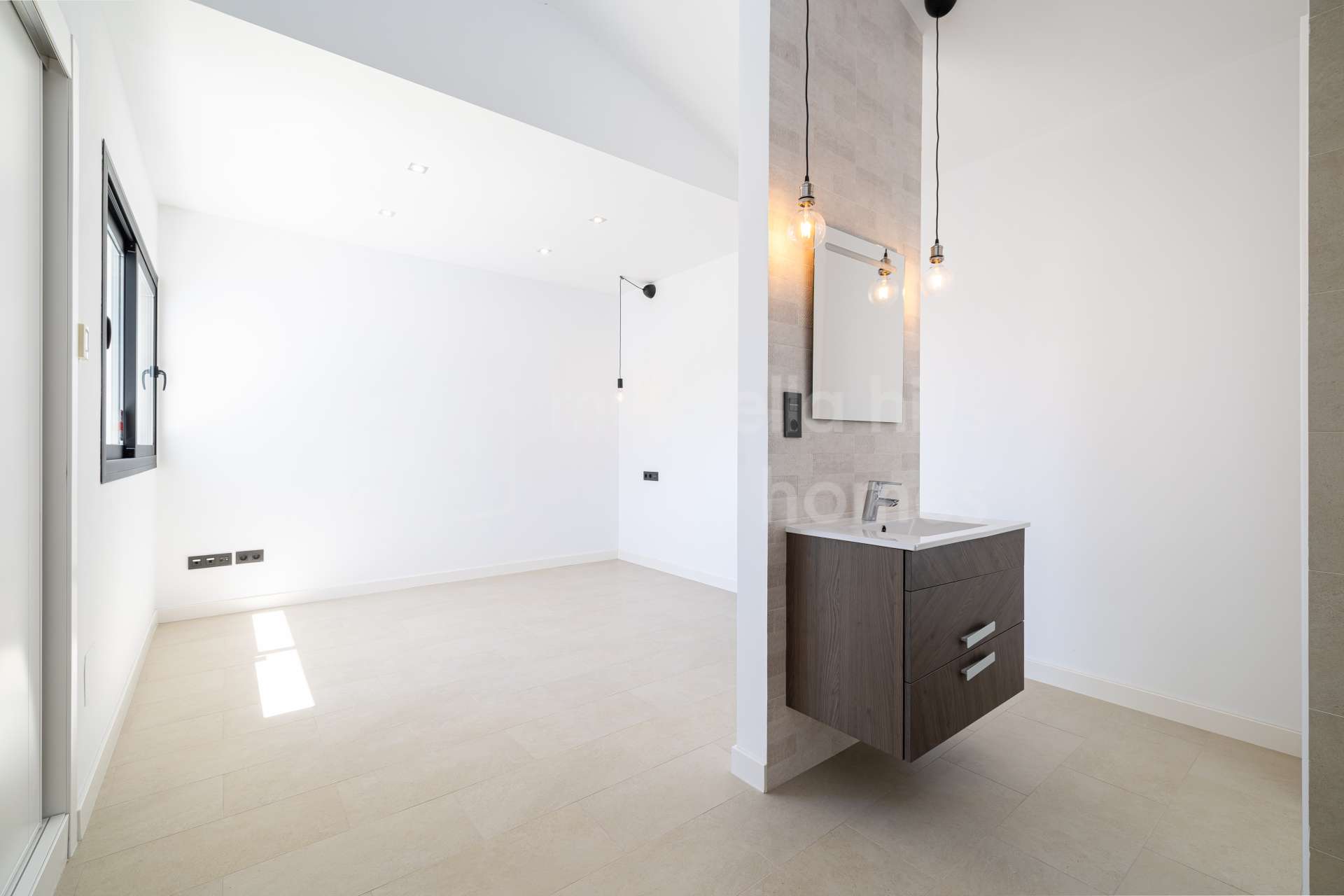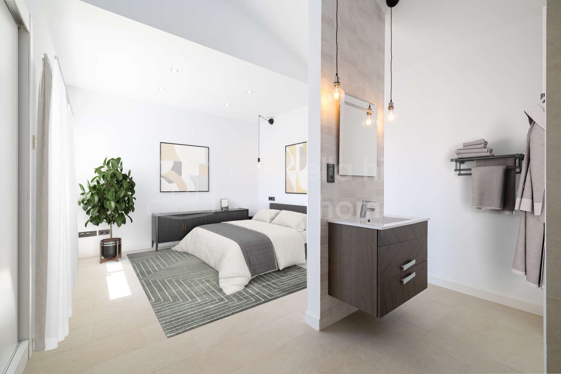 La villa dispose de quatre chambres spacieuses, toutes avec salle de bains en suite, ainsi que de toilettes invités. La suite parentale, située à l’étage, bénéficie d’une terrasse privée, d’un dressing et d’une salle de bains élégante avec baignoire et douche à l’italienne. Un espace bureau ouvert avec vue sur le salon complète l’étage, idéal pour le télétravail.