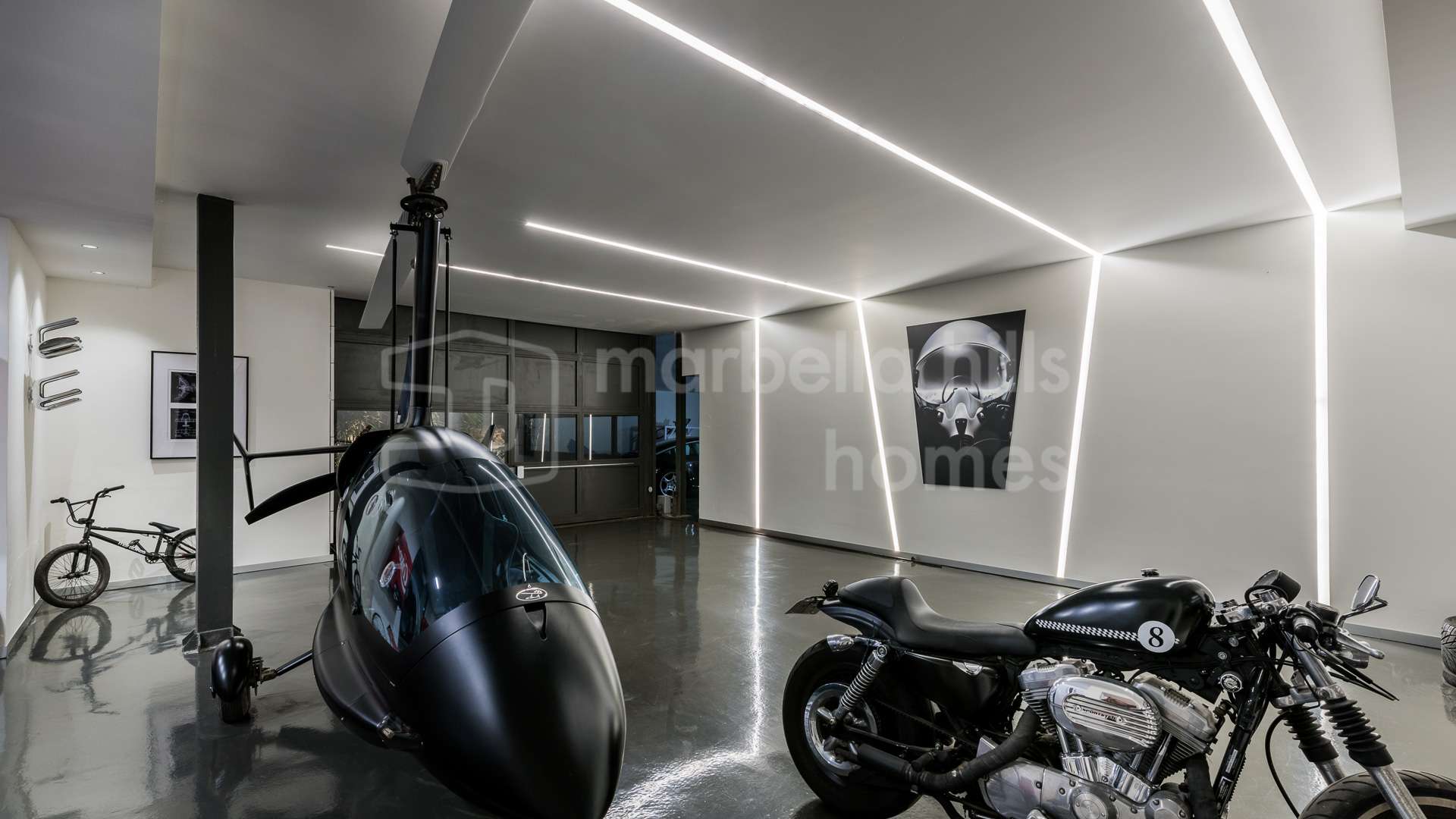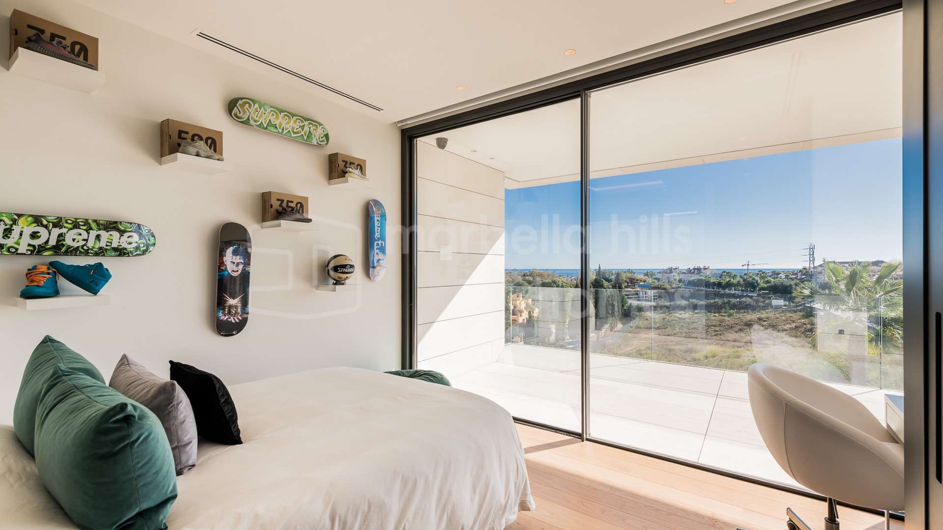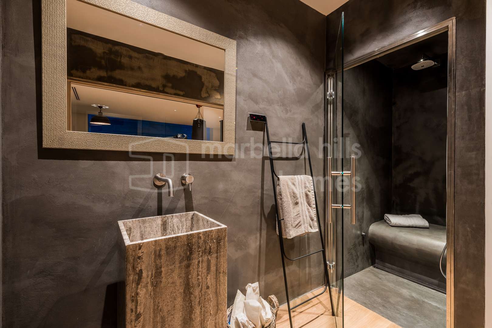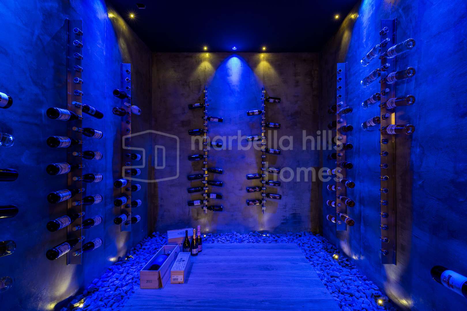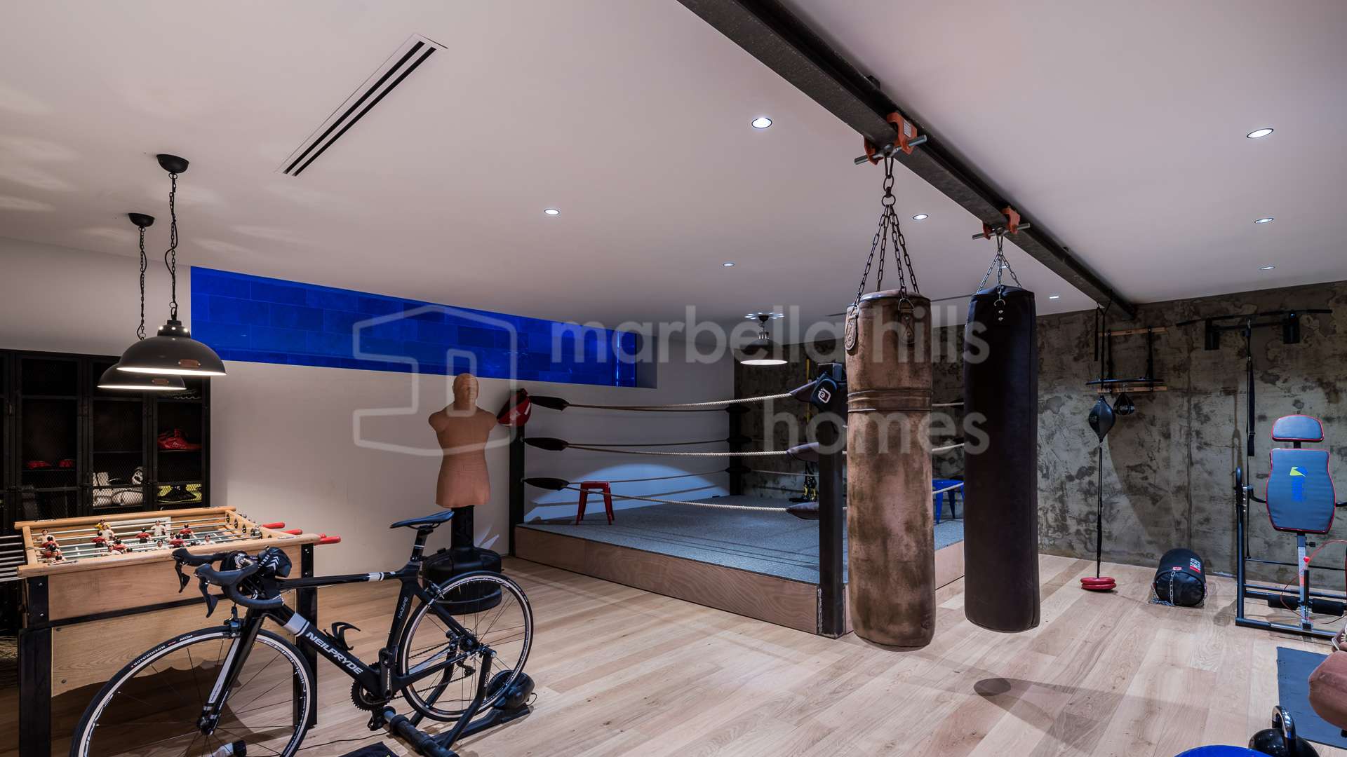 Le niveau inférieur est entièrement dédié au bien-être et aux loisirs, comprenant un spa privé avec sauna et jacuzzi, une salle de sport entièrement équipée avec zones de crossfit et de boxe, une salle de jeux, un cinéma privé ainsi qu’une élégante cave à vin. Ces prestations transforment la villa en un véritable refuge de luxe offrant des services dignes d’un resort haut de gamme.