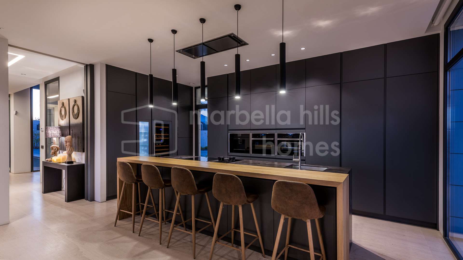 La villa dispose de sept chambres spacieuses et de neuf salles de bains, offrant des volumes généreux pour accueillir famille et invités. Les espaces de vie ouverts sont baignés de lumière naturelle grâce aux grandes baies vitrées du sol au plafond, assurant une parfaite continuité entre les espaces intérieurs, les terrasses, les jardins et la zone piscine. Une cuisine principale design est complétée par une cuisine extérieure entièrement équipée, idéale pour les réceptions et la vie en plein air.
