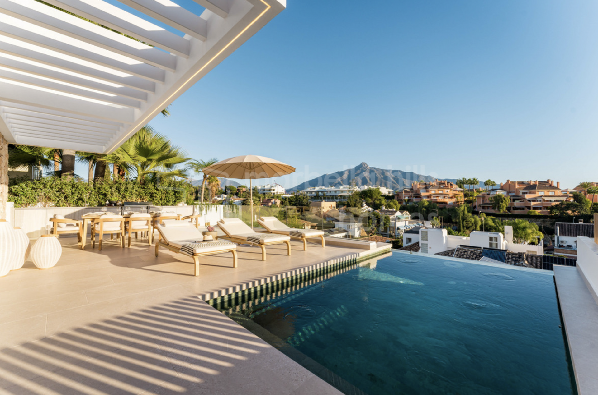 Située dans l’un des quartiers résidentiels les plus recherchés de Nueva Andalucía, cette remarquable villa de luxe au design contemporain bénéficie d’une position dominante offrant des vues panoramiques spectaculaires sur la Vallée du Golf, la mer Méditerranée, la montagne de La Concha et jusqu’à Gibraltar. Entièrement reconstruite récemment selon des standards de qualité très élevés, la propriété allie architecture moderne, matériaux raffinés et fonctionnalité optimale.