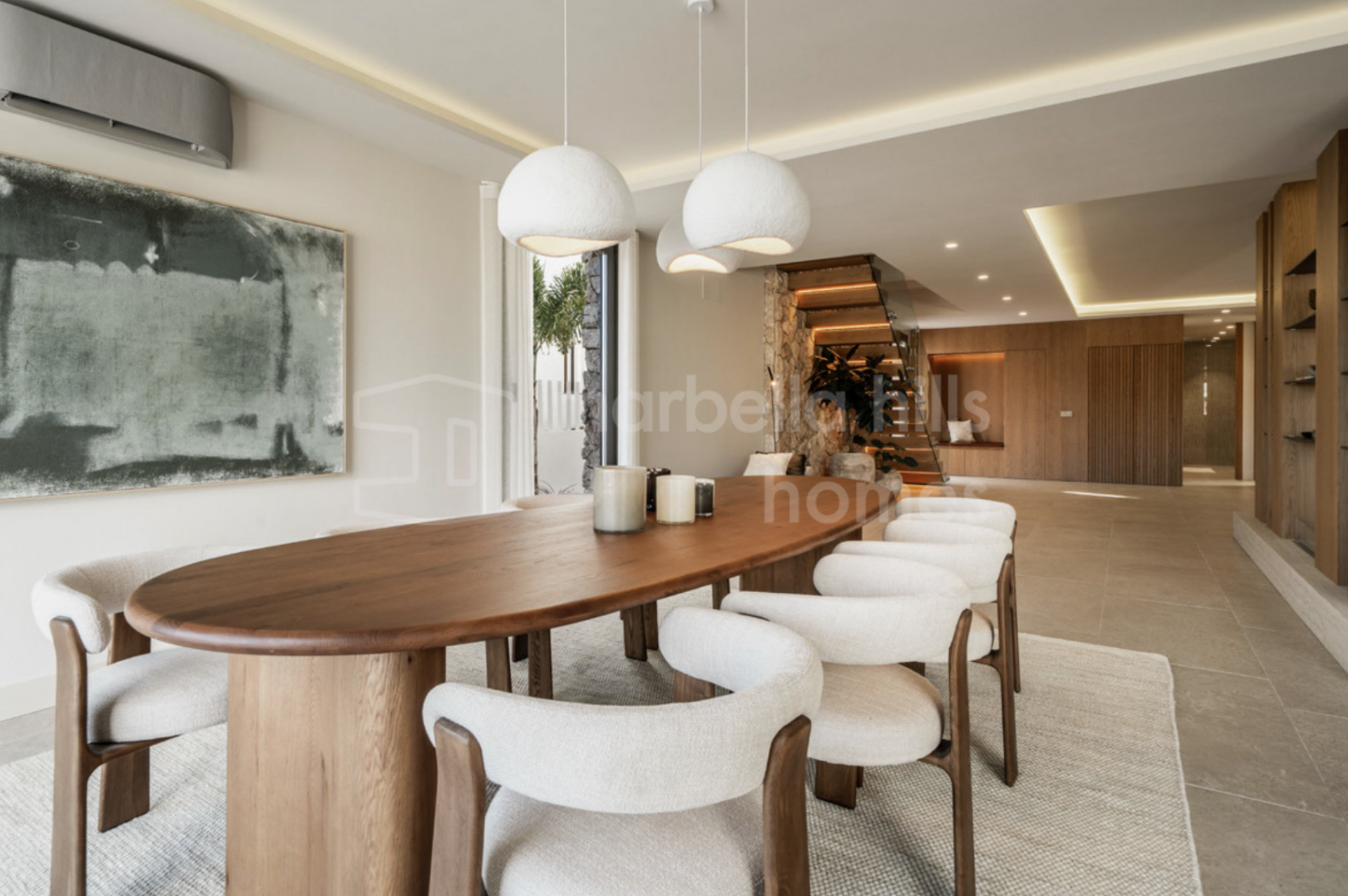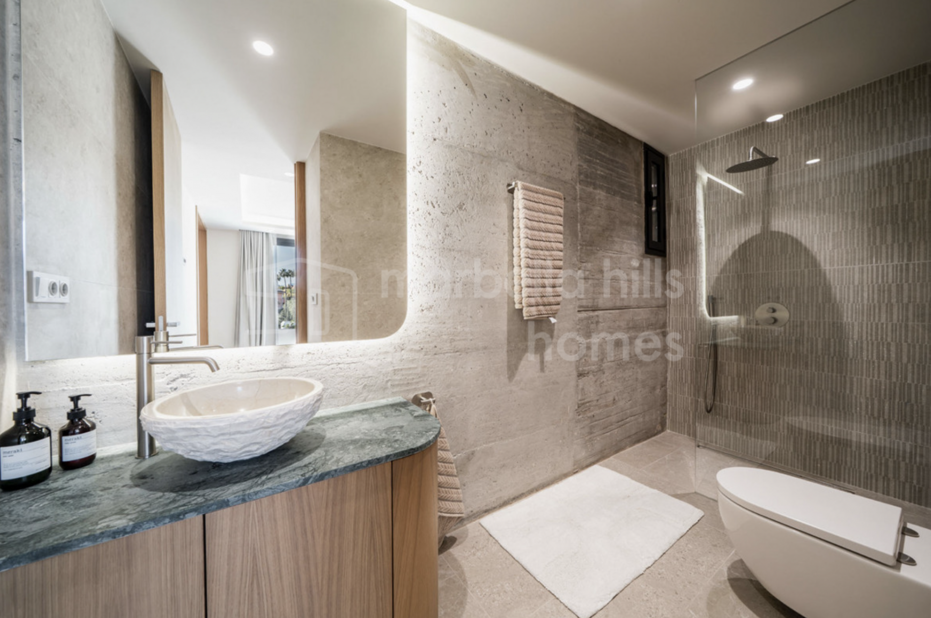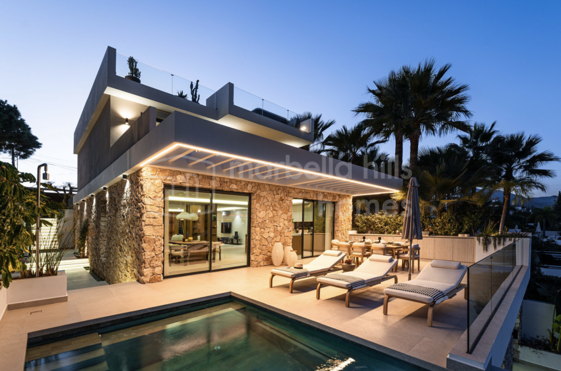 La villa dispose de cinq chambres spacieuses et de quatre salles de bains modernes, offrant une distribution flexible adaptée aussi bien à une vie familiale qu’à l’accueil d’invités. Les finitions haut de gamme, telles que les sols en grès cérame, la menuiserie sur mesure et les éléments en pierre naturelle, confèrent à l’ensemble une élégance intemporelle et une atmosphère chaleureuse.