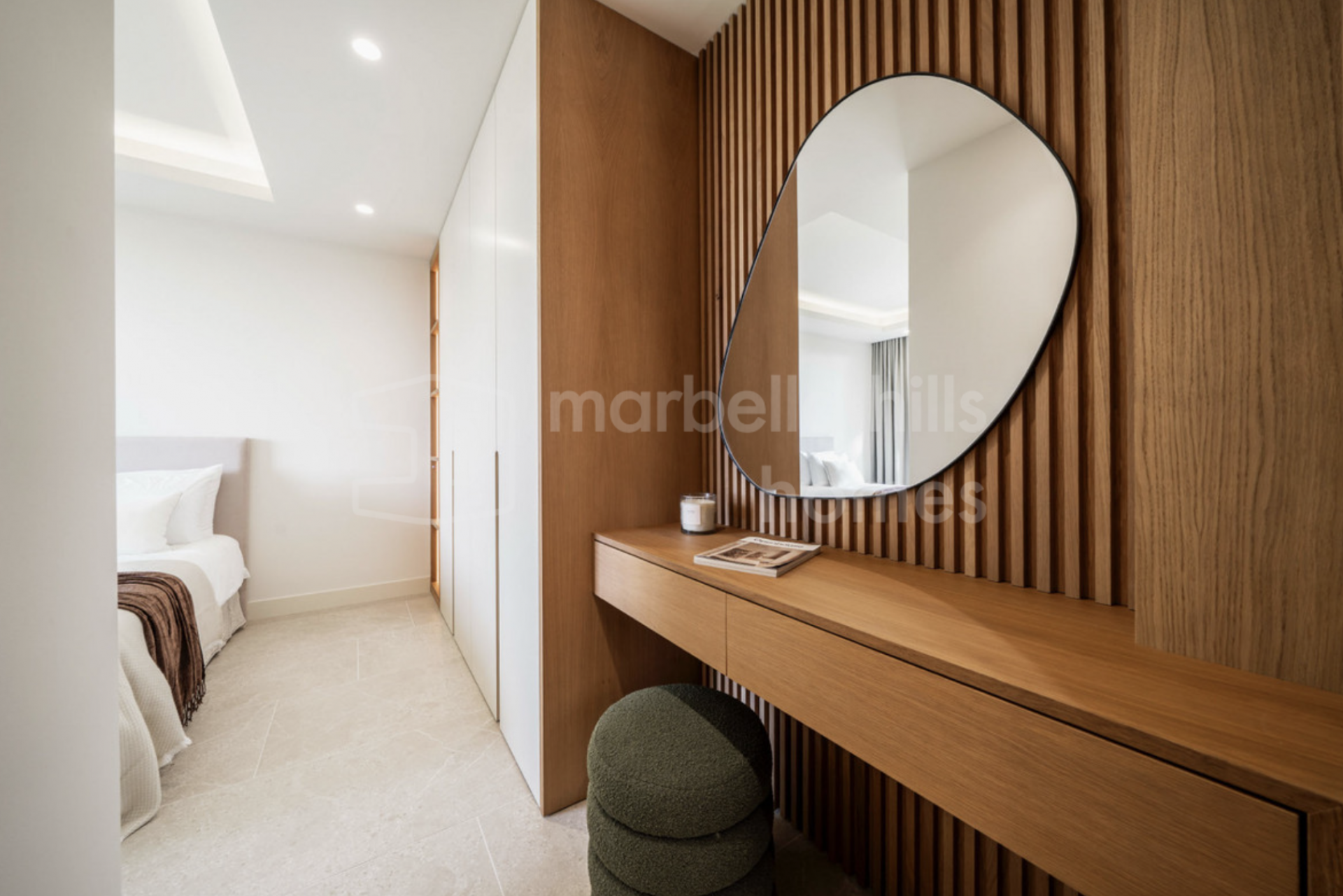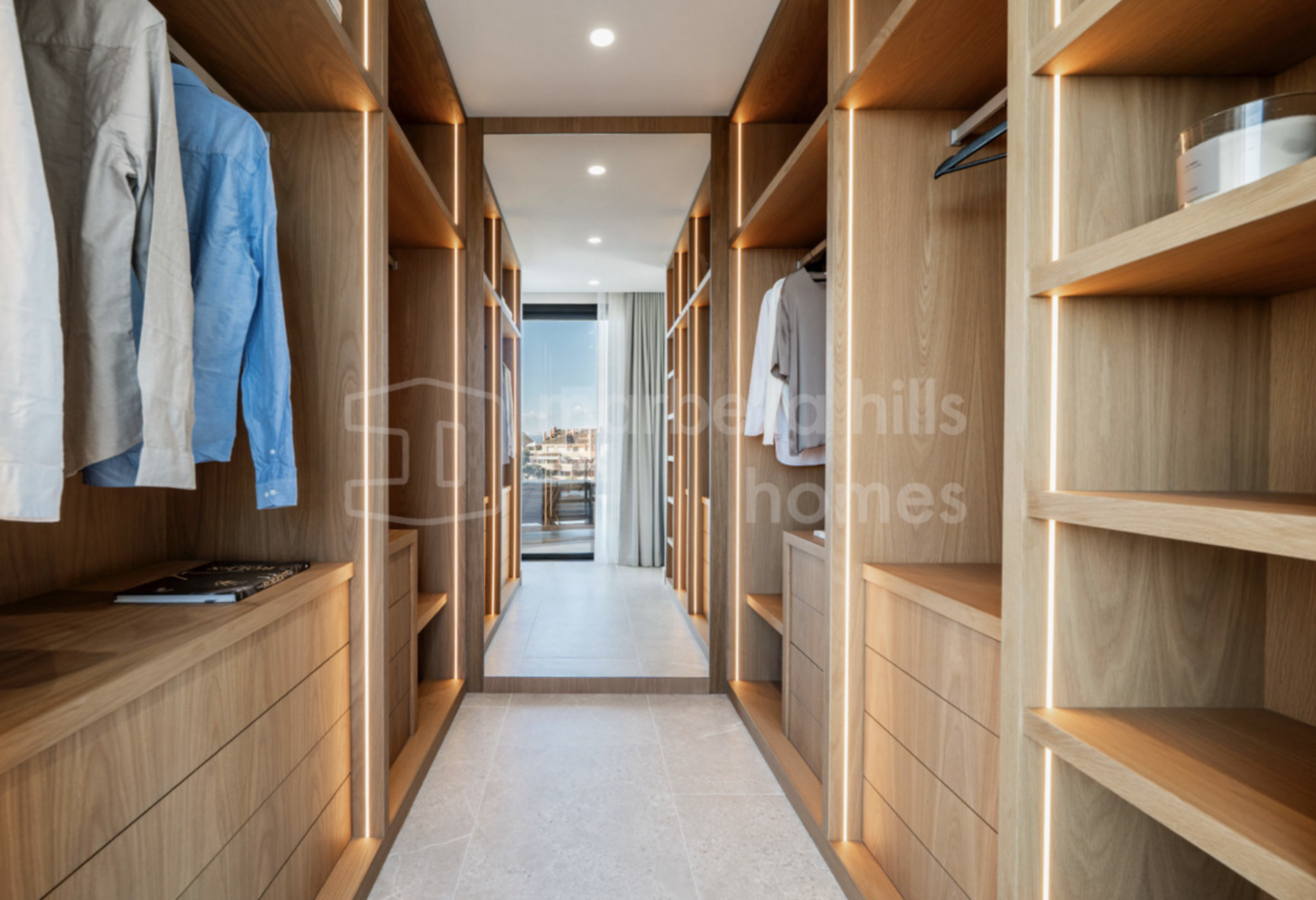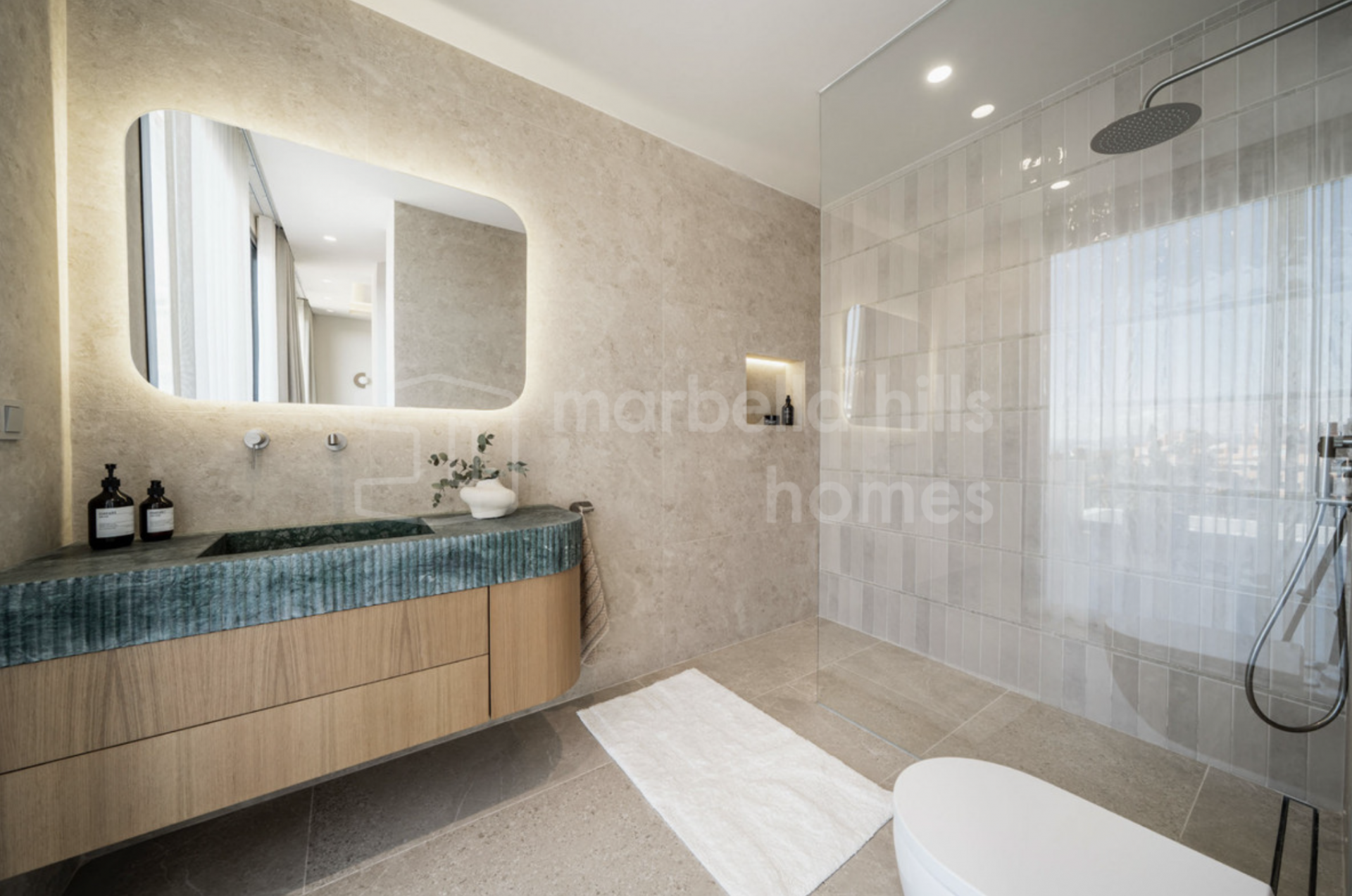 La villa dispose de cinq chambres spacieuses et de quatre salles de bains modernes, offrant une distribution flexible adaptée aussi bien à une vie familiale qu’à l’accueil d’invités. Les finitions haut de gamme, telles que les sols en grès cérame, la menuiserie sur mesure et les éléments en pierre naturelle, confèrent à l’ensemble une élégance intemporelle et une atmosphère chaleureuse.
