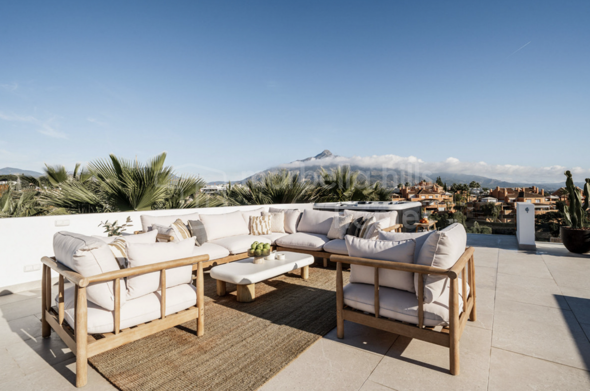 L’un des atouts majeurs de la propriété est sa terrasse sur le toit, équipée d’un jacuzzi et offrant des vues panoramiques à 360°. Cet espace privilégié est idéal pour se détendre, pratiquer le yoga au lever du soleil ou profiter de moments conviviaux face au paysage environnant.