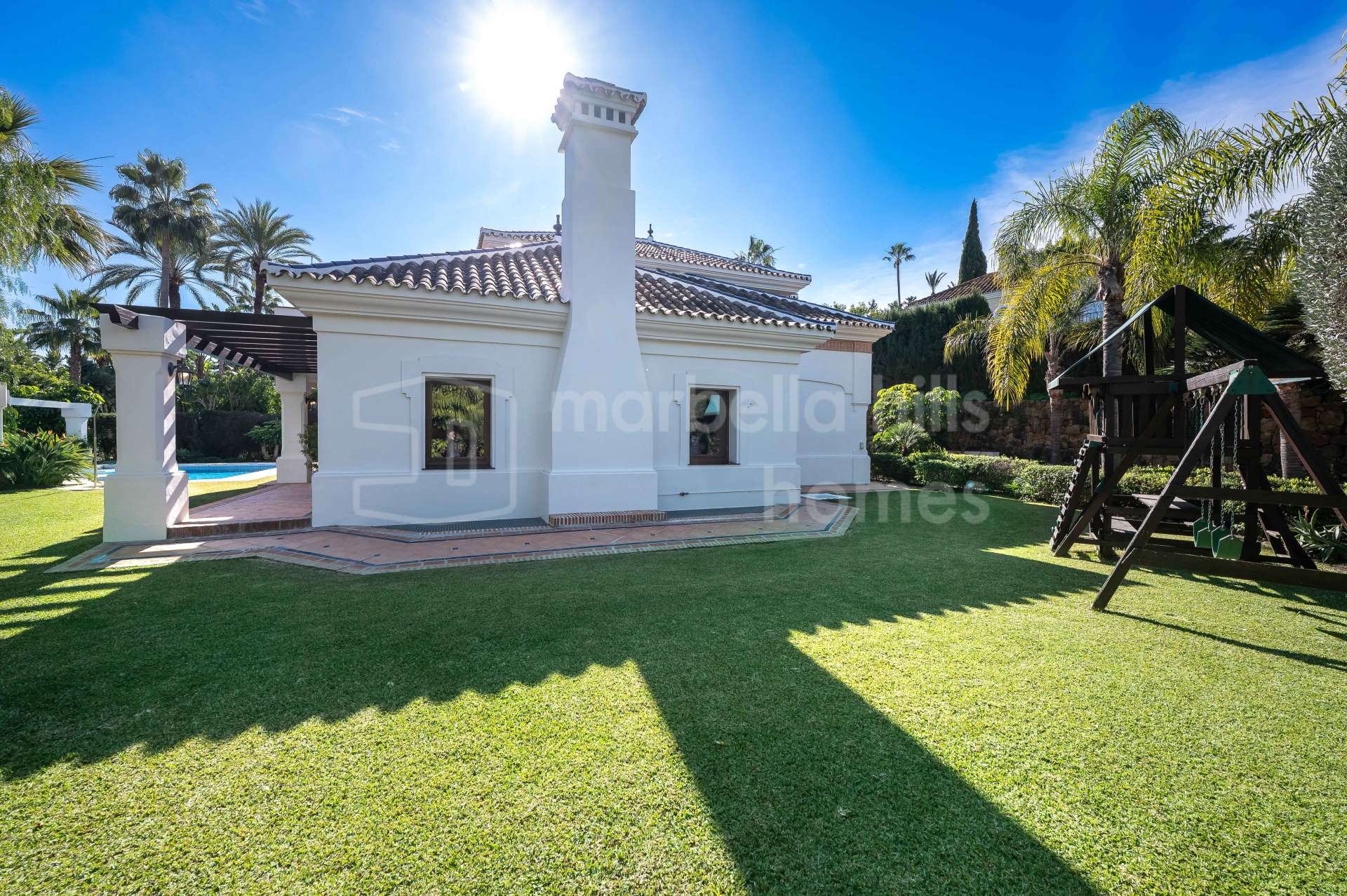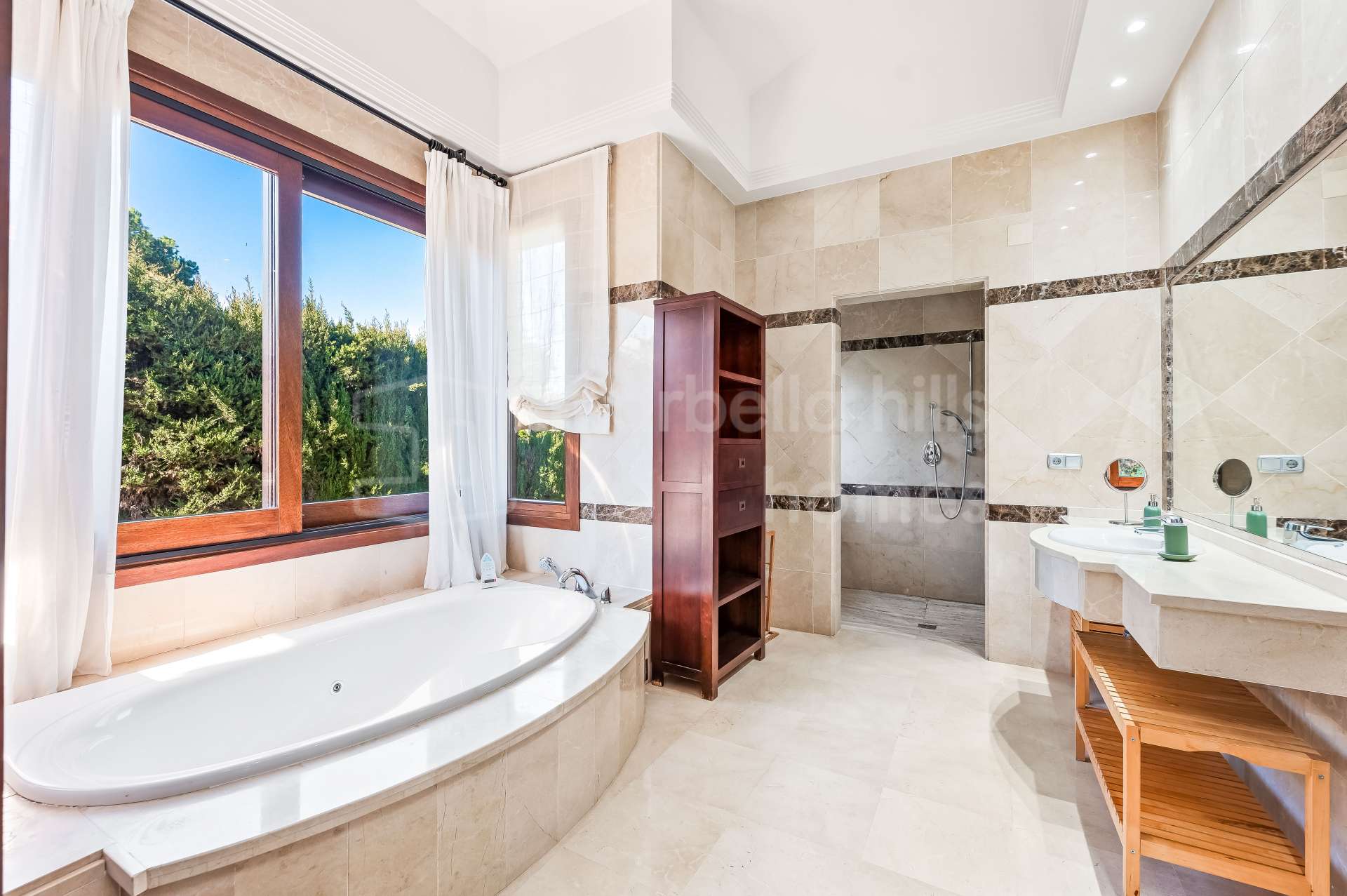 Implantée sur un terrain privé de 1 550 m² et offrant 620 m² construits, la villa bénéficie d’une orientation sud-est et de vues dégagées sur ses jardins paysagers, la piscine privée et la majestueuse montagne de La Concha. Son emplacement est idéal, à distance de marche des commerces, restaurants, supermarchés et services quotidiens, et à seulement cinq minutes en voiture de Puerto Banús et des plages.