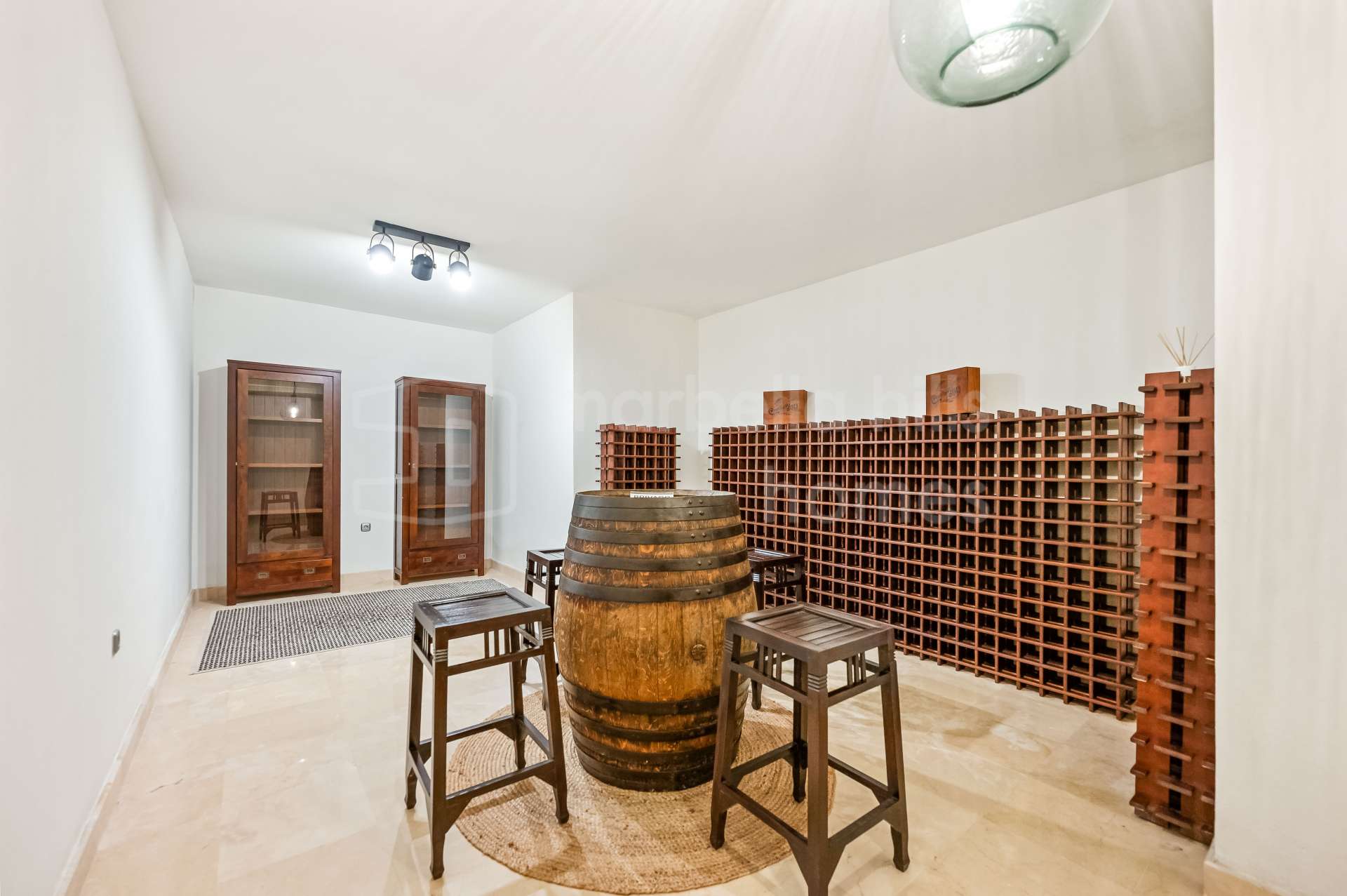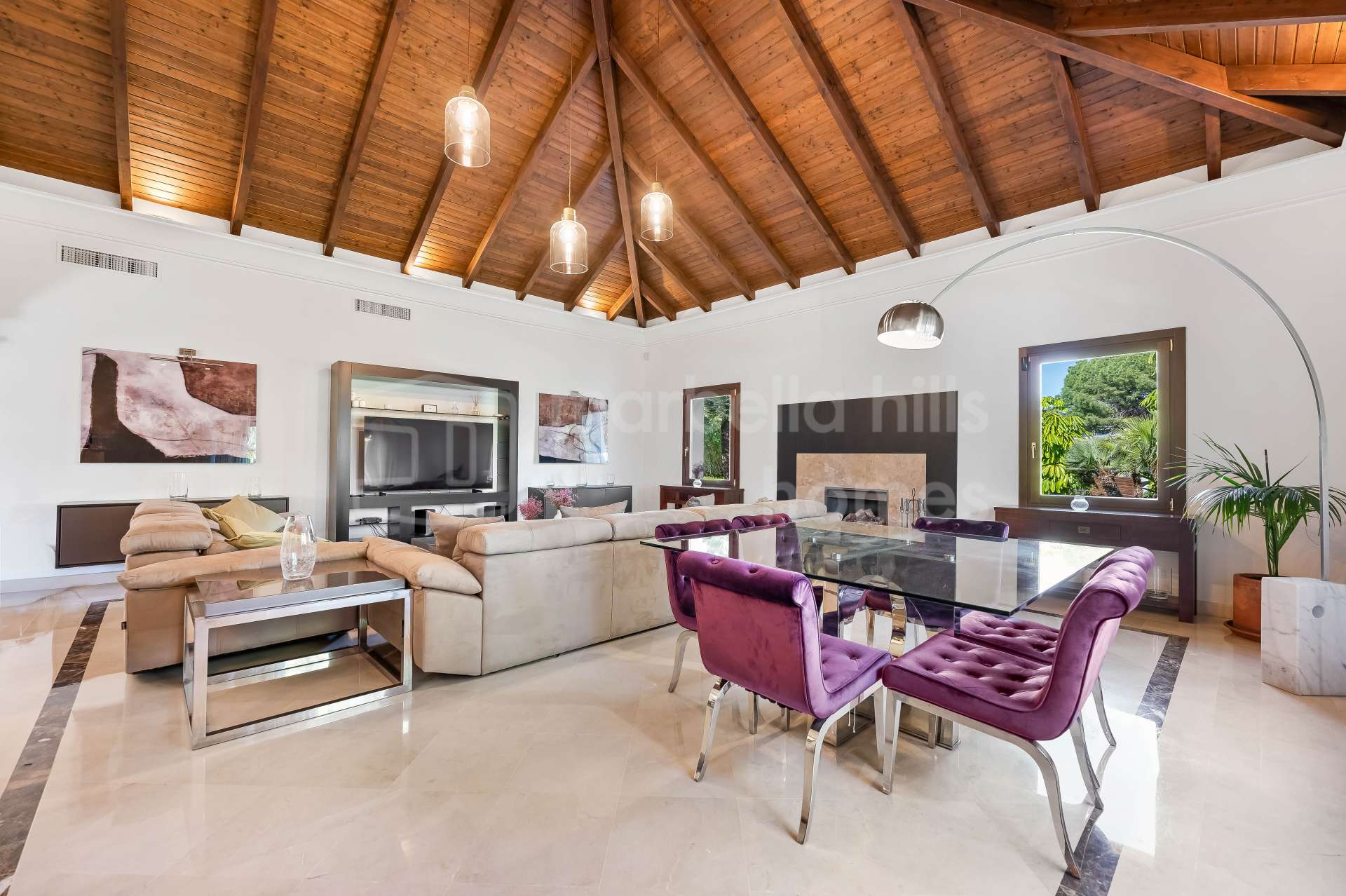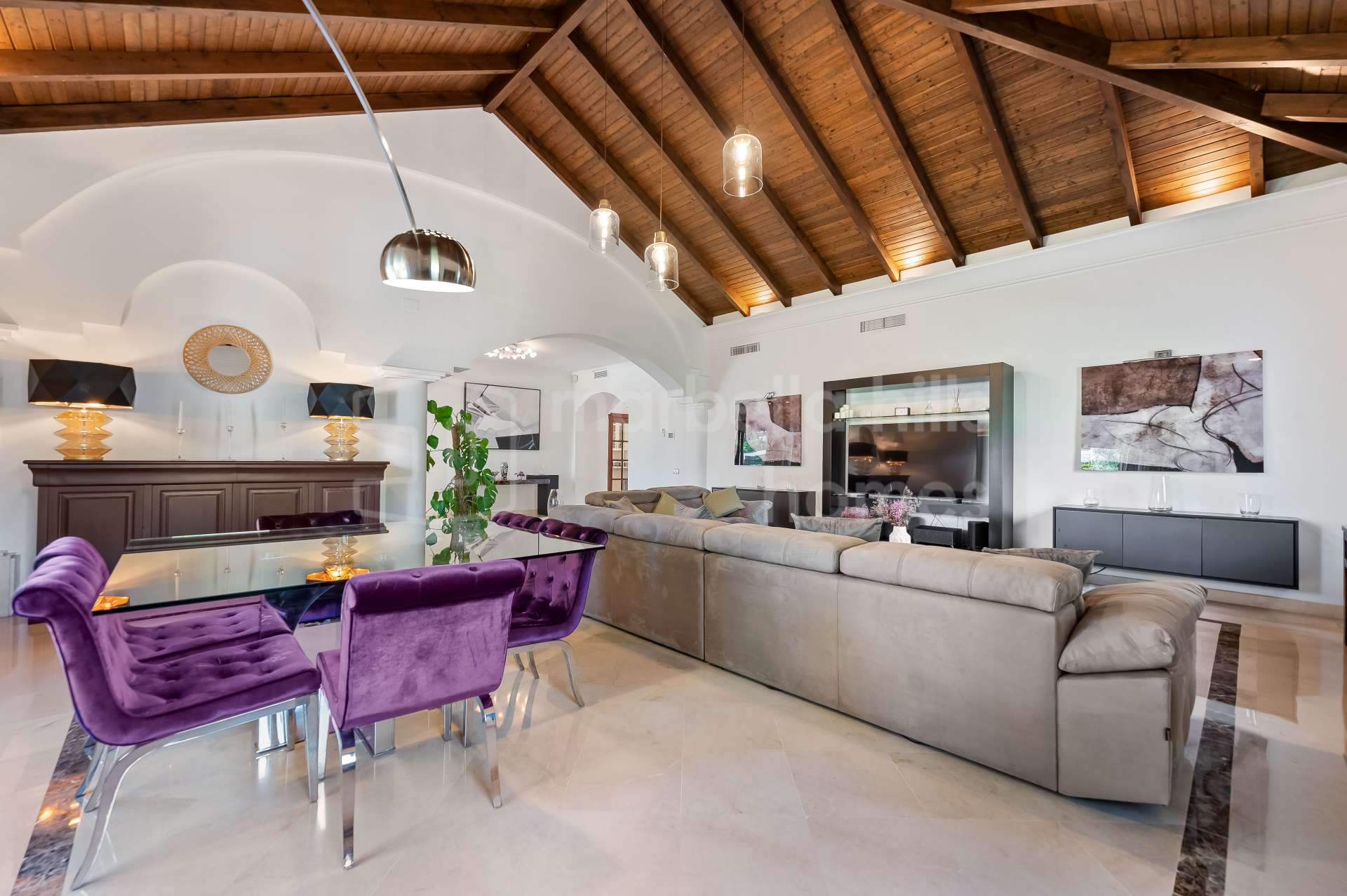 Le niveau principal s’ouvre sur un vaste hall d’entrée menant à un grand salon et salle à manger avec plafonds en bois culminant à 5,5 mètres, cheminée en marbre et bois, et larges fenêtres laissant entrer une abondante lumière naturelle. L’espace de vie donne directement sur une terrasse couverte et le jardin avec piscine, créant un cadre parfait pour profiter du climat de la Costa del Sol toute l’année.