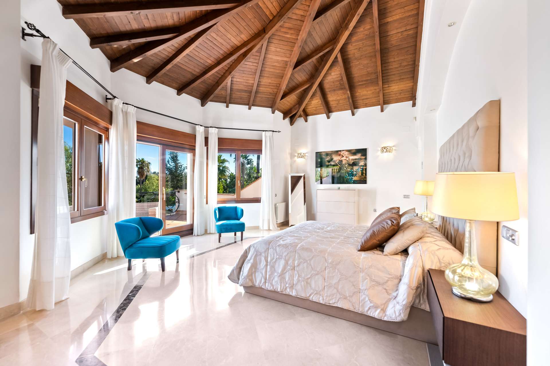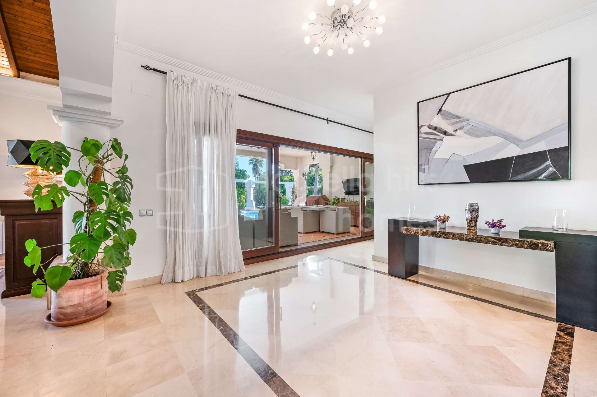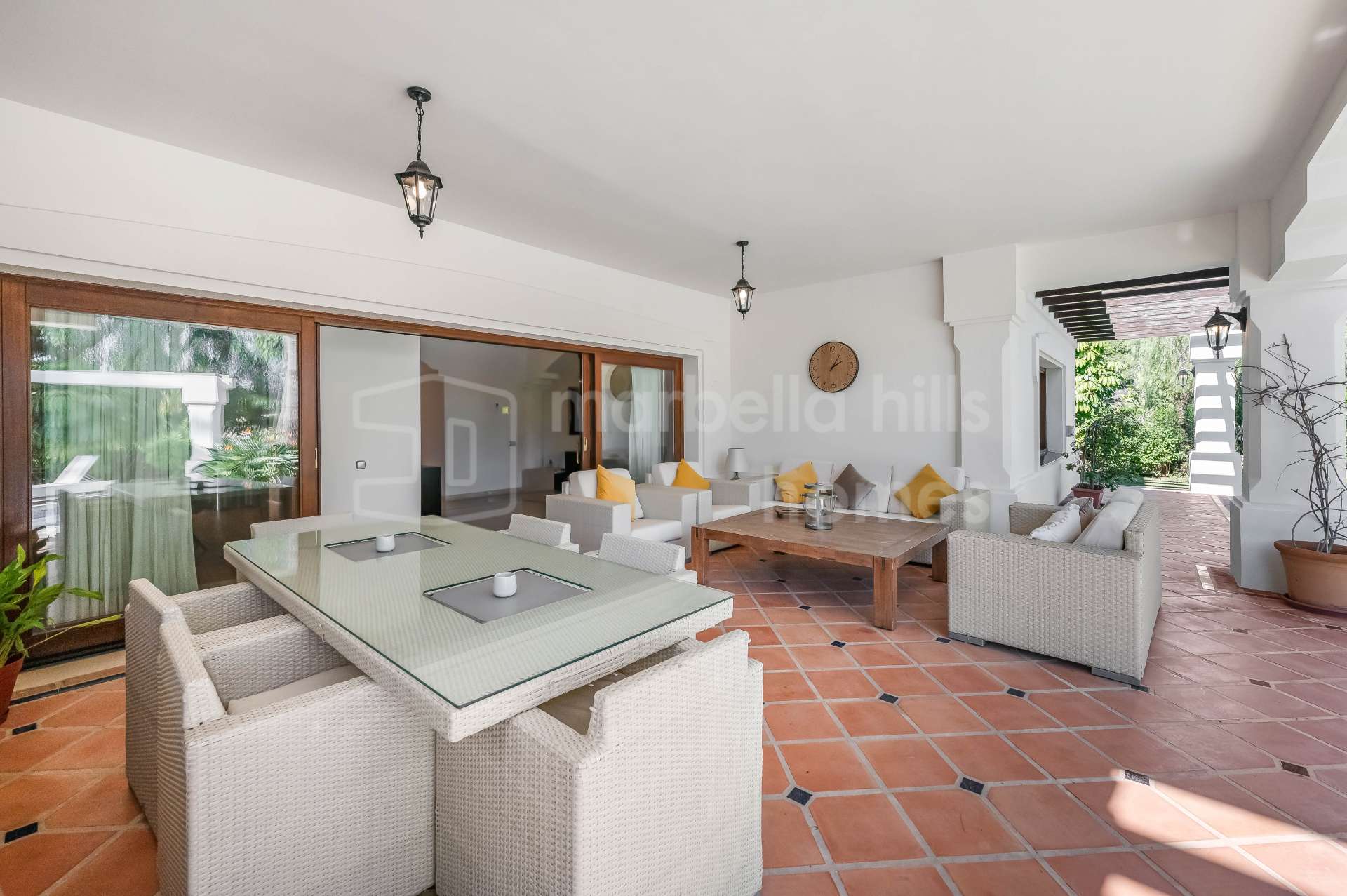 Le niveau principal s’ouvre sur un vaste hall d’entrée menant à un grand salon et salle à manger avec plafonds en bois culminant à 5,5 mètres, cheminée en marbre et bois, et larges fenêtres laissant entrer une abondante lumière naturelle. L’espace de vie donne directement sur une terrasse couverte et le jardin avec piscine, créant un cadre parfait pour profiter du climat de la Costa del Sol toute l’année.