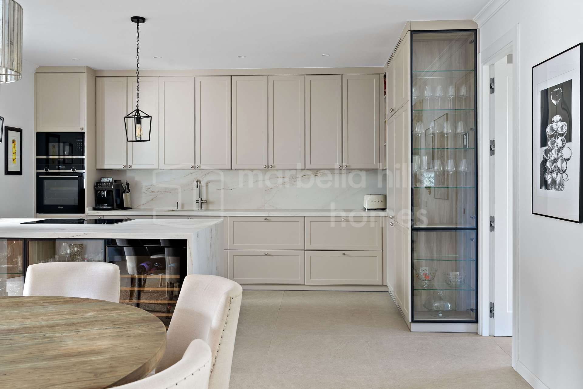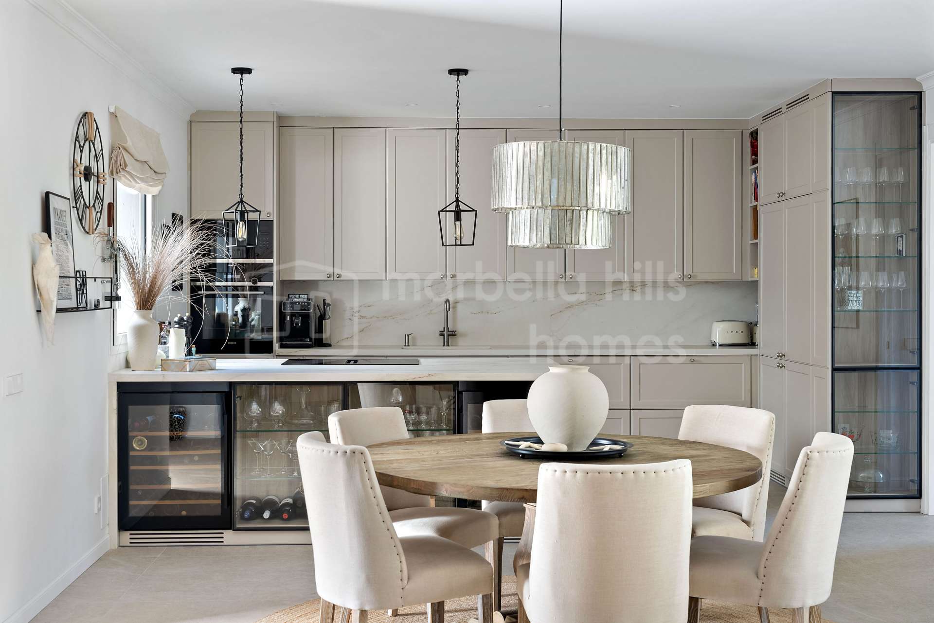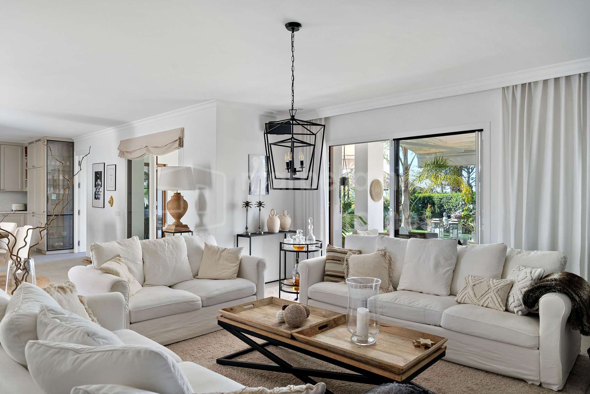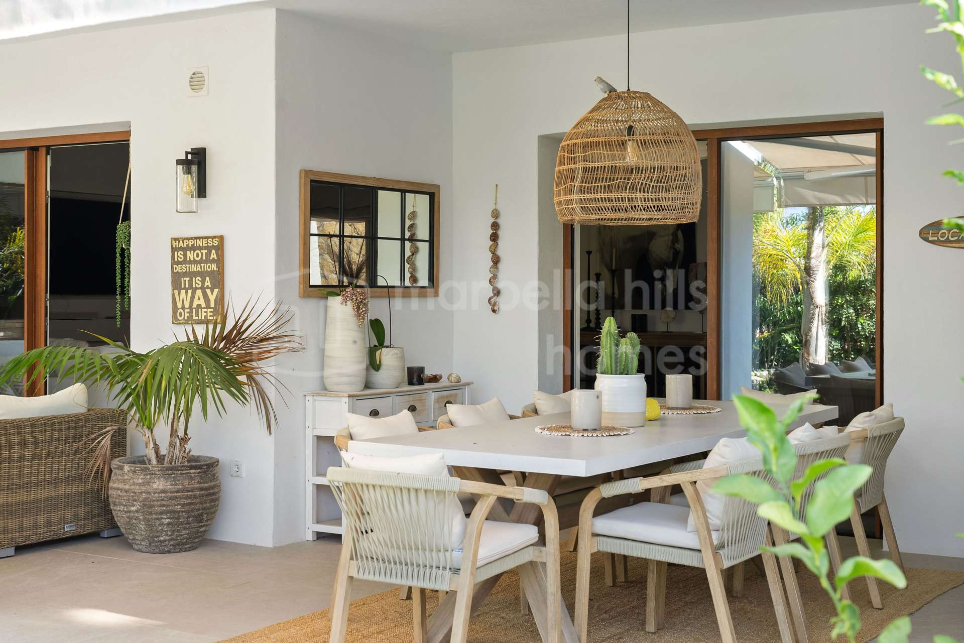 La propriété offre 207 m² construits répartis sur deux niveaux, complétés par une terrasse de 50 m² et un jardin privé de 110 m². Le niveau principal propose un espace de vie lumineux et ouvert intégrant salon, salle à manger et cuisine nordique sur mesure, créant une atmosphère élégante et chaleureuse. De larges baies vitrées s’ouvrent directement sur le jardin paysager, pensé pour profiter pleinement du style de vie méditerranéen, avec espace barbecue, four à pizza au feu de bois et sauna avec douche extérieure.