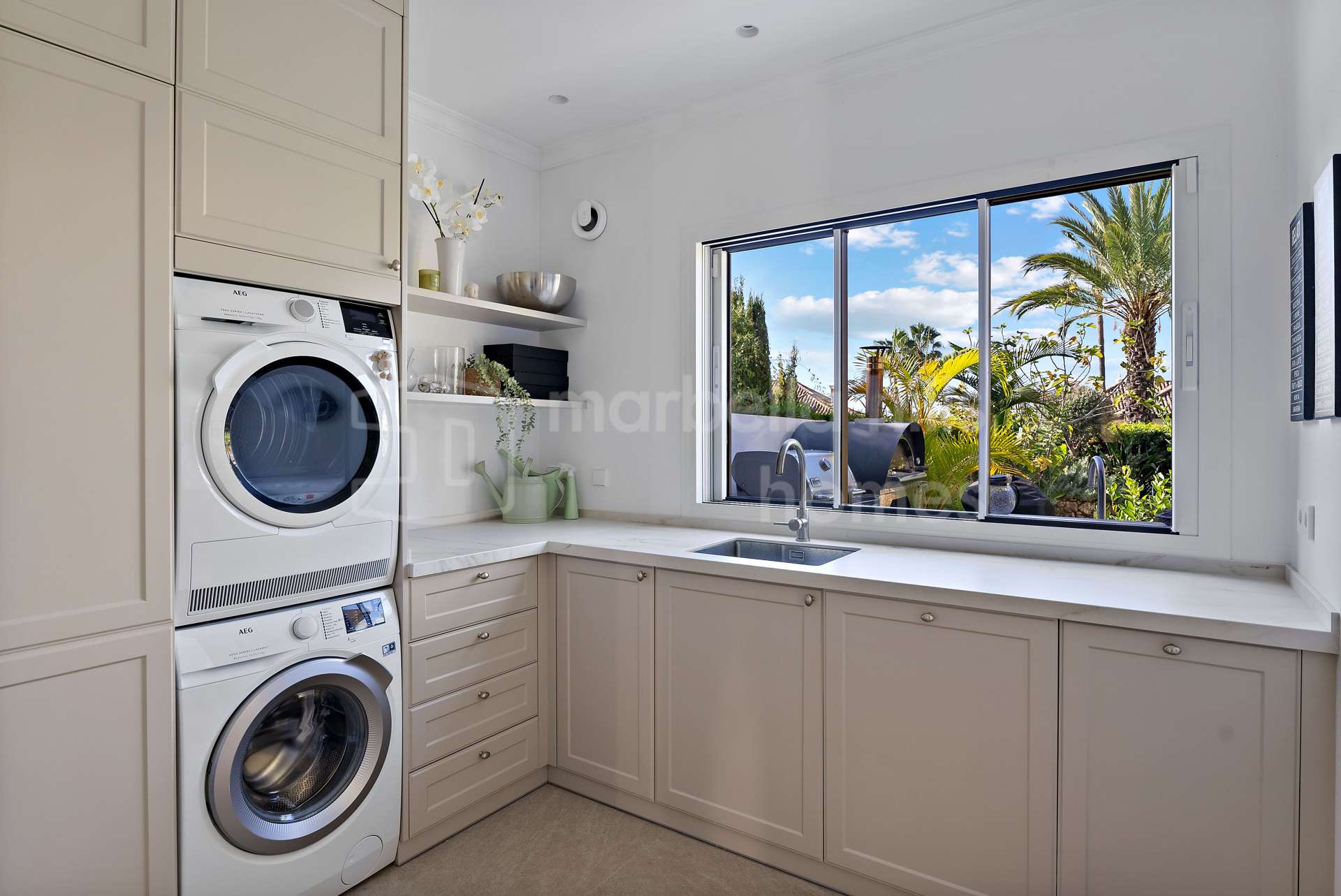 Les prestations incluent chauffage au sol hydraulique, chauffage au sol dans les salles de bains, climatisation individuelle Airzone, système de circulation d’eau chaude instantanée, système audio Sonos et robinet Grohe Blue dans la cuisine fournissant eau filtrée et réfrigérée. Un garage privé avec prise pour voiturette de golf ainsi qu’un débarras de 12 m² complètent l’ensemble.