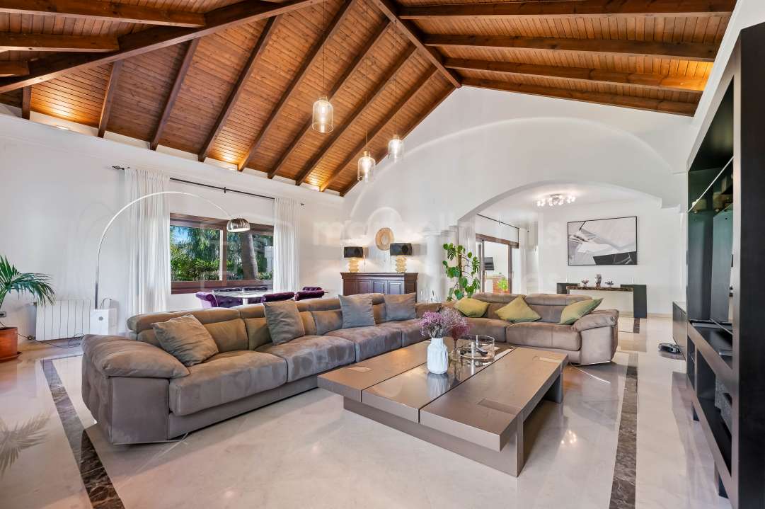 La villa s’ouvre sur un impressionnant hall d’entrée à double hauteur menant à un vaste espace de vie et salle à manger décloisonné avec plafonds voûtés. De larges baies vitrées du sol au plafond inondent les intérieurs de lumière naturelle et assurent une parfaite continuité entre l’intérieur et les terrasses extérieures. La cuisine moderne entièrement équipée, dotée d’un grand îlot central, constitue le cœur de la maison, idéale pour la vie quotidienne comme pour recevoir. Une cheminée apporte une touche chaleureuse, mariant charme classique et design contemporain.