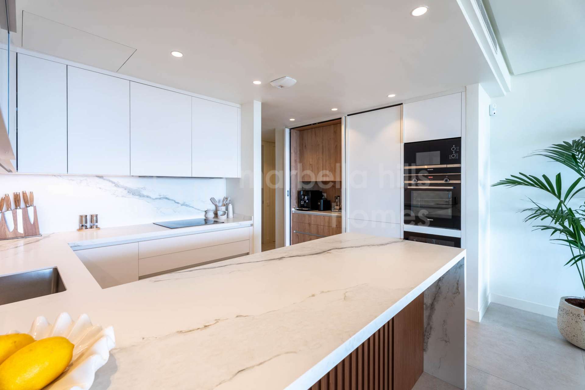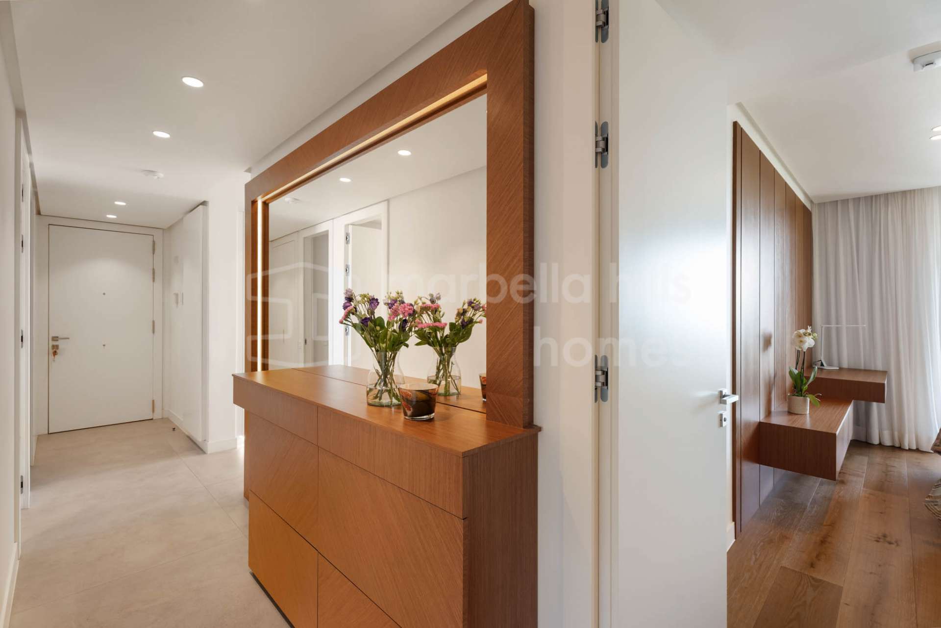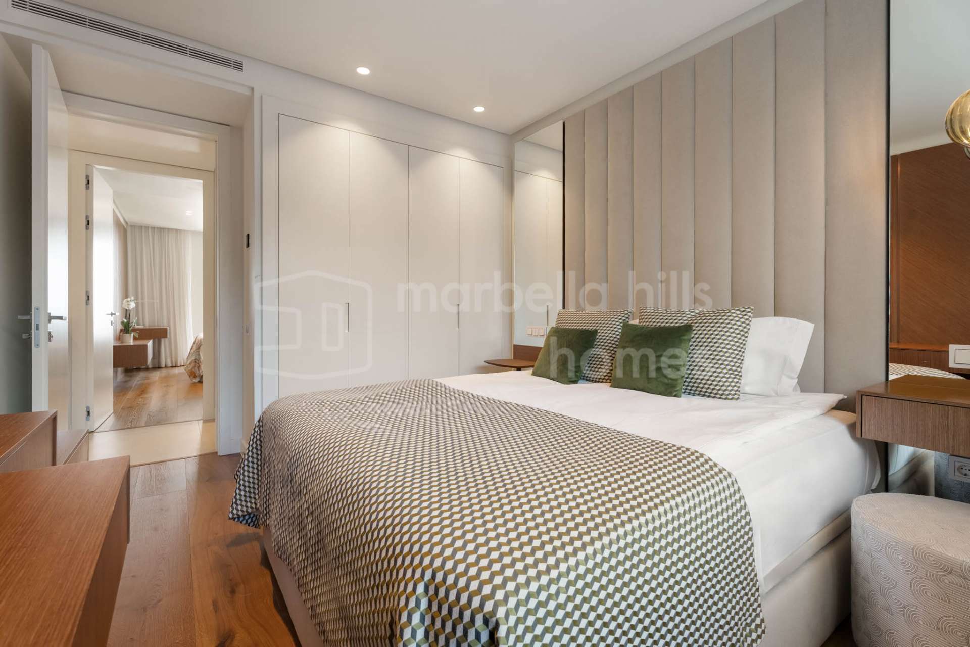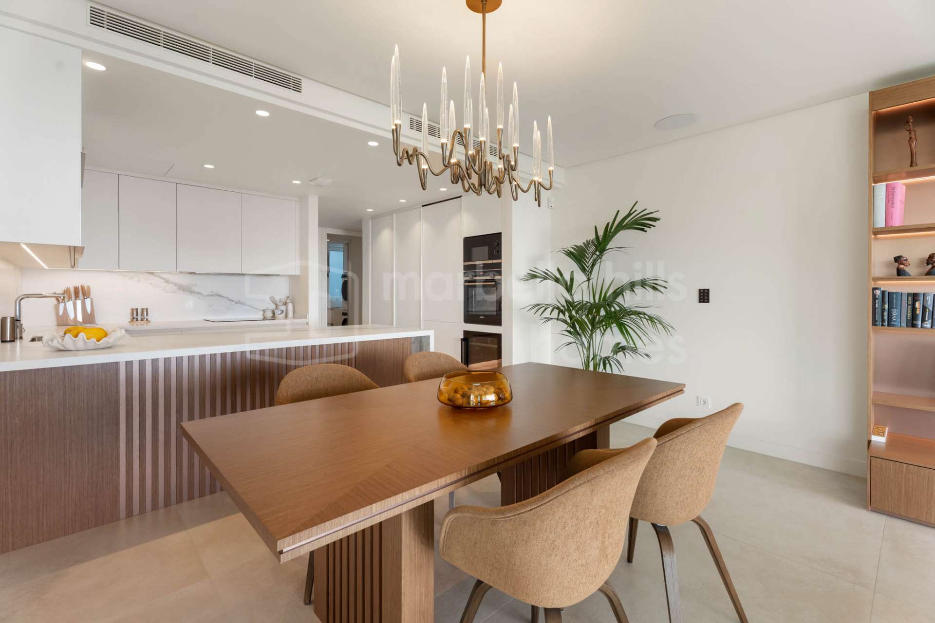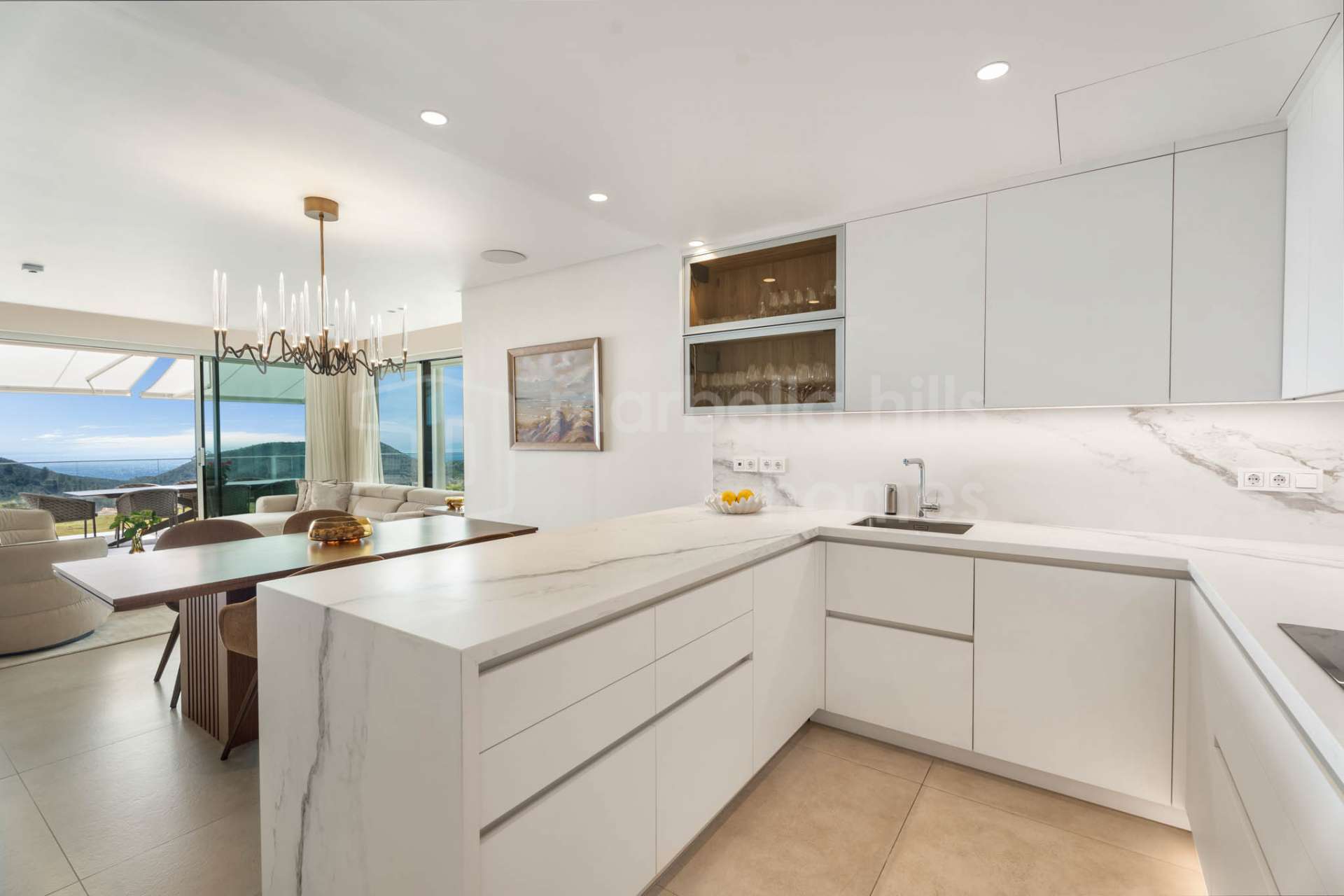 D’une superficie construite totale de 209 m², comprenant 158 m² habitables et une terrasse couverte de 51 m², ce bien propose une distribution ouverte conçue pour maximiser la lumière naturelle et la continuité entre les espaces intérieurs et extérieurs. De grandes baies vitrées coulissantes du sol au plafond relient le salon et la salle à manger à la terrasse et au jardin privé, créant un cadre idéal pour profiter du climat privilégié de la Costa del Sol toute l’année.
