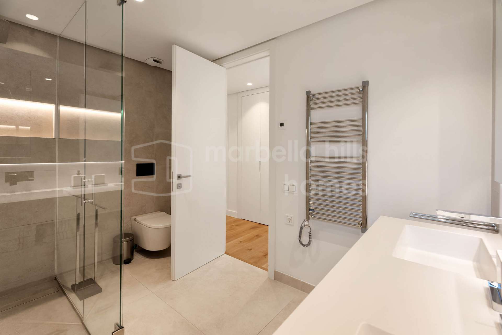 L’appartement dispose de trois chambres et de deux salles de bains, dont une suite parentale avec salle de bains privative et accès direct à la terrasse et au jardin. Les deux autres chambres partagent une salle de bains moderne, et un toilette invités complète l’ensemble. Les matériaux de haute qualité, les lignes architecturales épurées et les finitions soignées soulignent le caractère raffiné de la propriété.