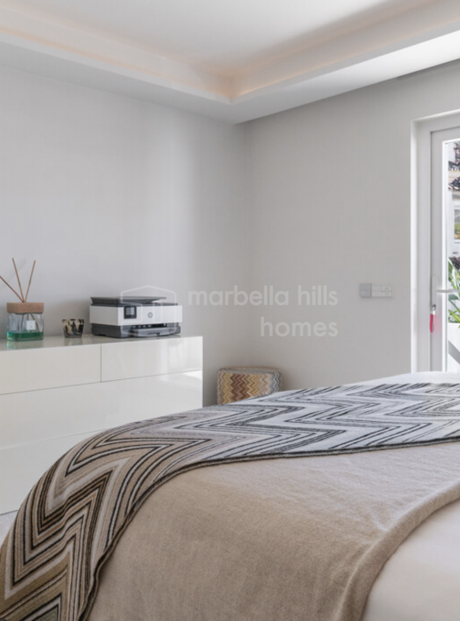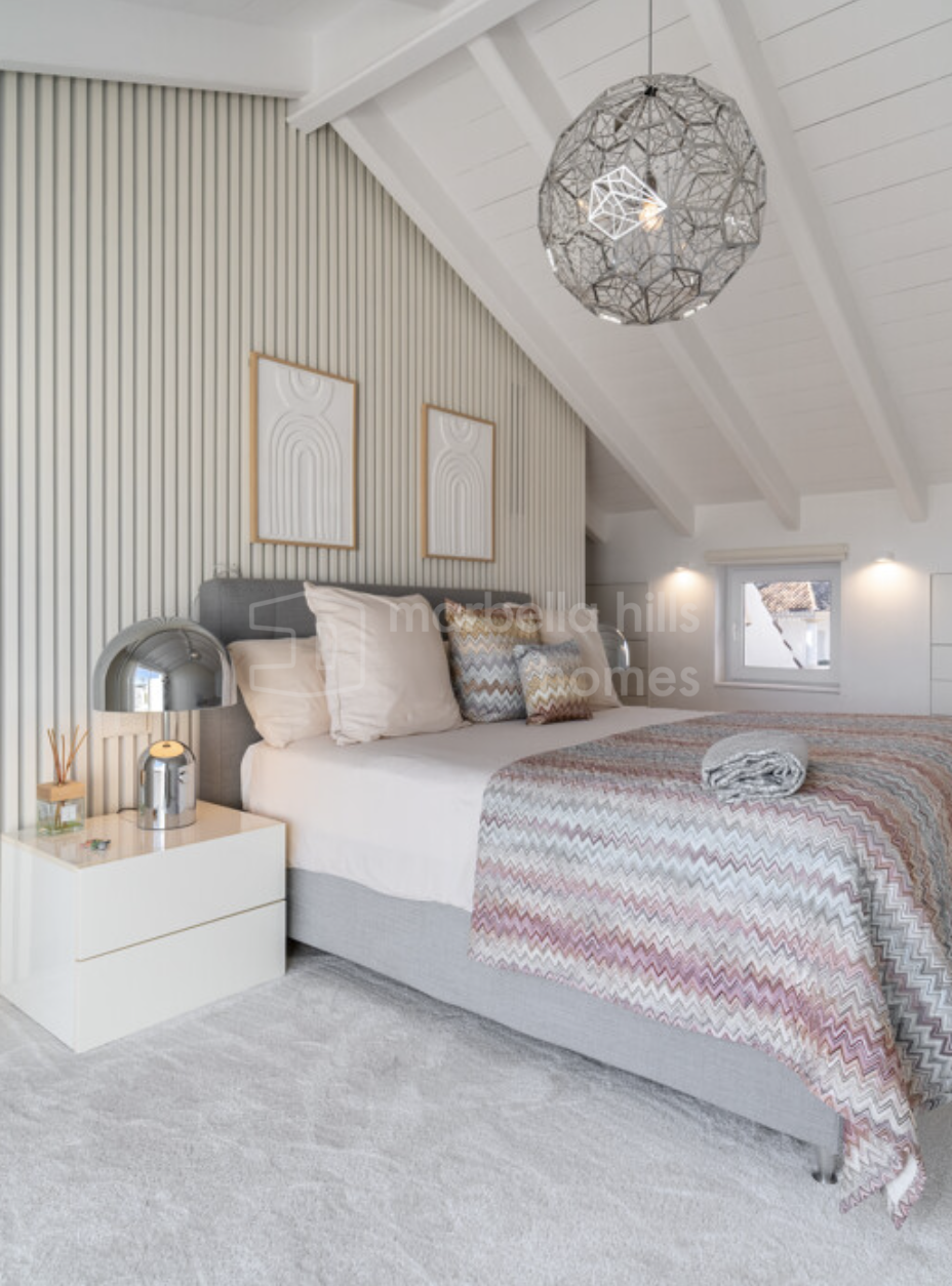 L’étage supérieur est entièrement dédié à la superbe suite parentale, créant un véritable espace de retraite sous de hauts plafonds voûtés. La chambre s’ouvre sur une terrasse privée offrant des vues panoramiques exceptionnelles sur la mer Méditerranée, Gibraltar et la côte africaine. La salle de bains spacieuse comprend une baignoire positionnée face à la vue, créant une atmosphère digne d’un spa.