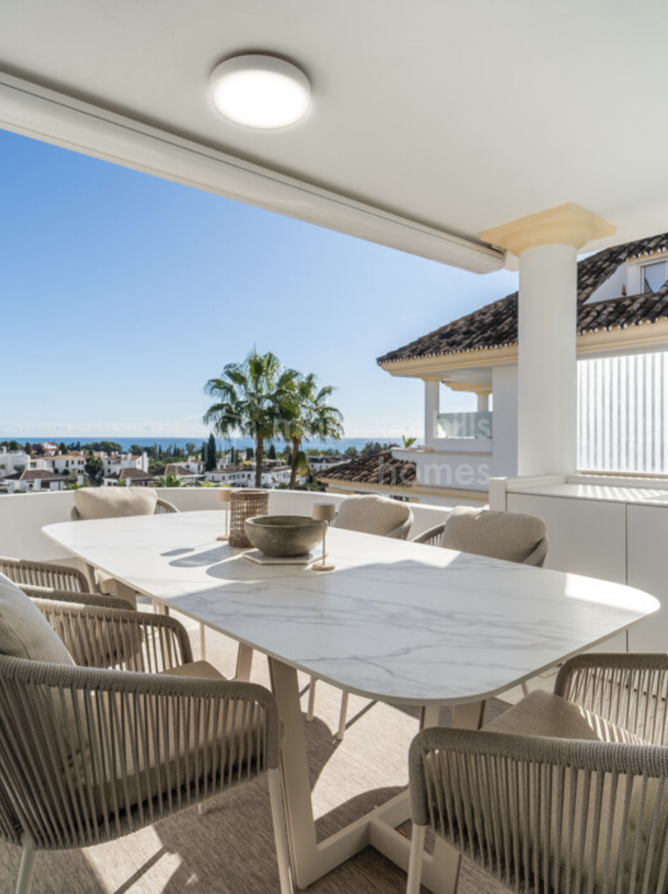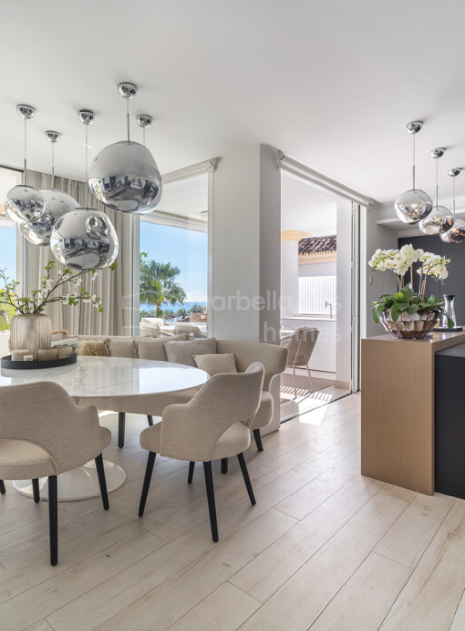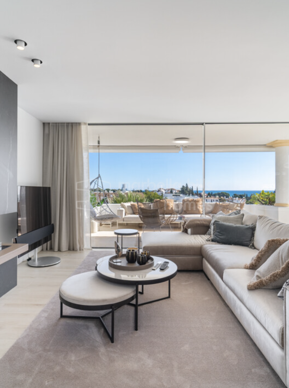 Penthouse duplex de luxe rénové sur le Golden Mile de Marbella, 4 chambres, vues panoramiques sur la mer, vastes terrasses et piscine privée dans un environnement exclusif.