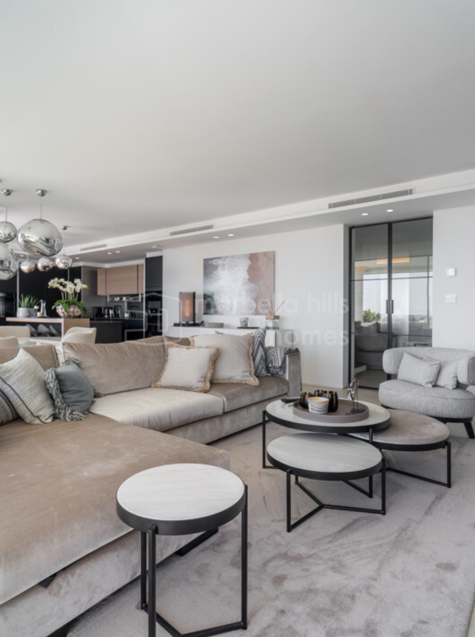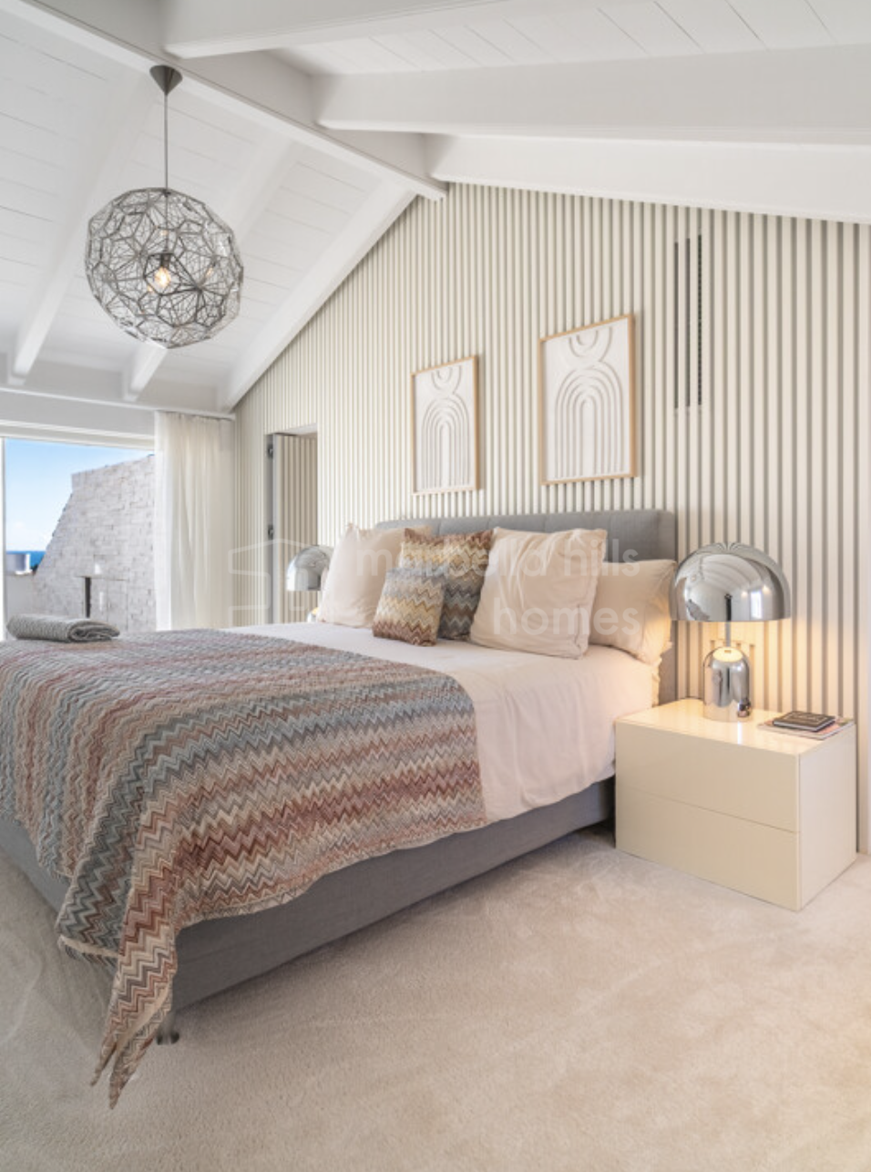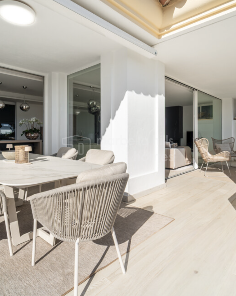 Penthouse duplex de luxe rénové sur le Golden Mile de Marbella, 4 chambres, vues panoramiques sur la mer, vastes terrasses et piscine privée dans un environnement exclusif.