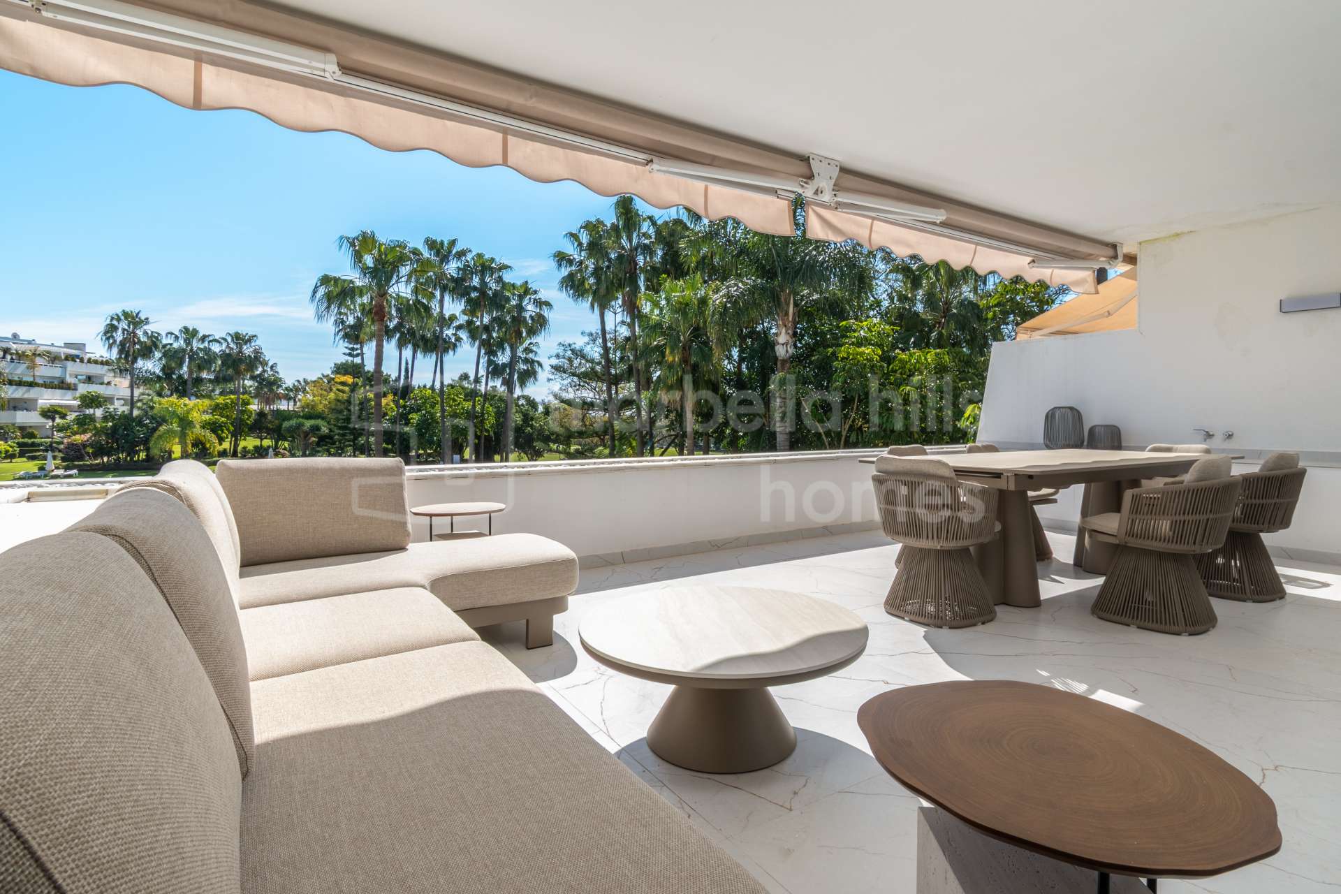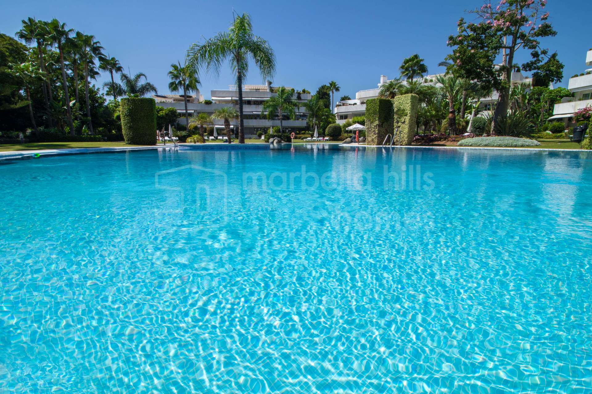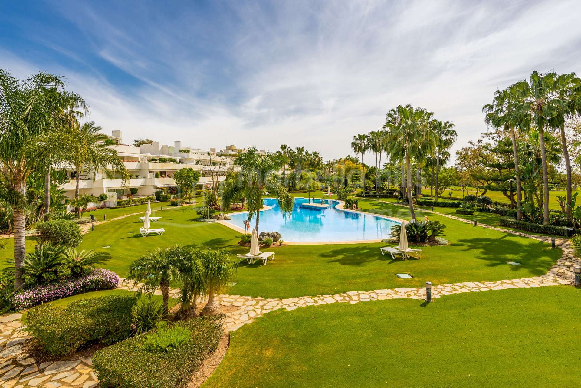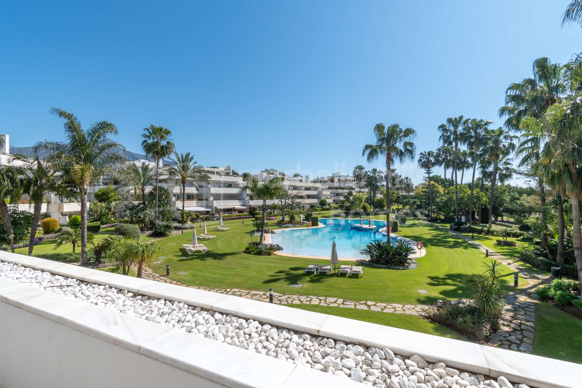 Appartement à vendre à Nueva Andalucía, situé dans la résidence recherchée Los Granados Golf, offrant un intérieur récemment rénové et de beaux espaces extérieurs.