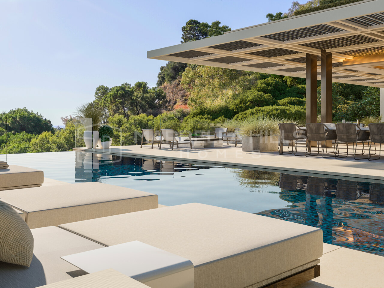 Édifiée sur un terrain de 1 210 m², la villa propose 606 m² d’espaces intérieurs et 307 m² de terrasses répartis sur trois niveaux spacieux. Le niveau principal présente un concept ouvert lumineux, avec de larges baies vitrées du sol au plafond qui encadrent le paysage environnant. La cuisine design, la salle à manger et le séjour s’intègrent harmonieusement et s’ouvrent sur de vastes terrasses dotées d’une spectaculaire piscine à débordement se confondant avec l’horizon.