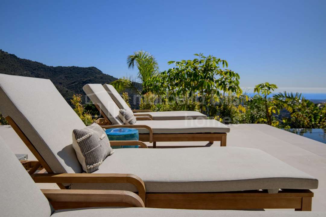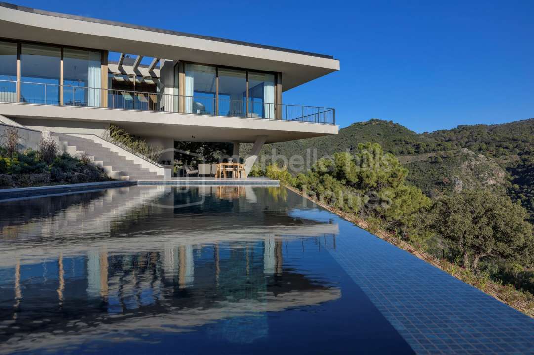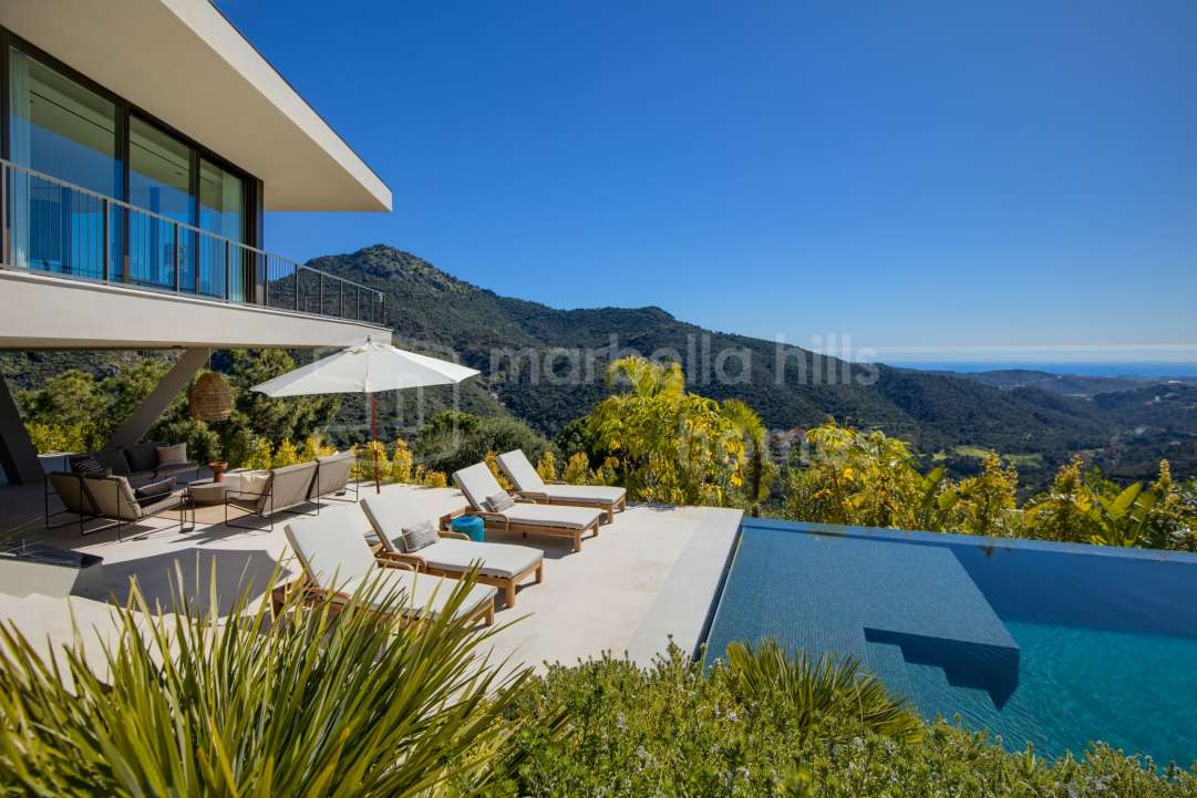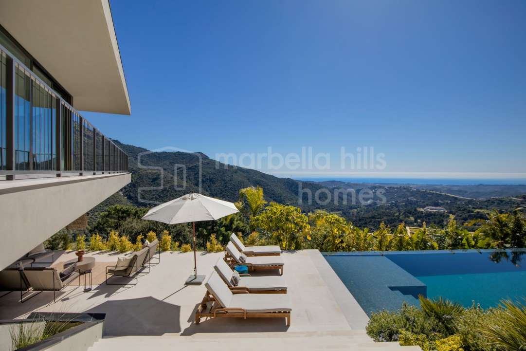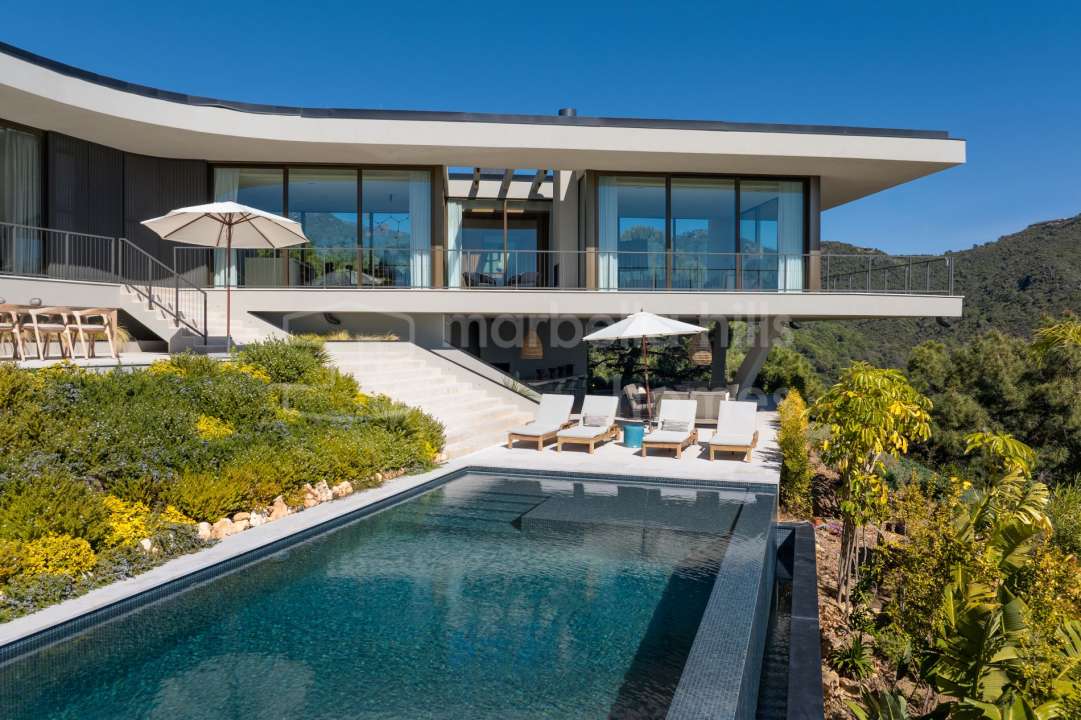 Moderne Luxusvilla zum Verkauf in Monte Mayor, Benahavís. 5 Schlafzimmer, Gästehaus, Infinity-Pool, Panoramablick auf Meer und Berge, nachhaltiges Design und maximale Privatsphäre.