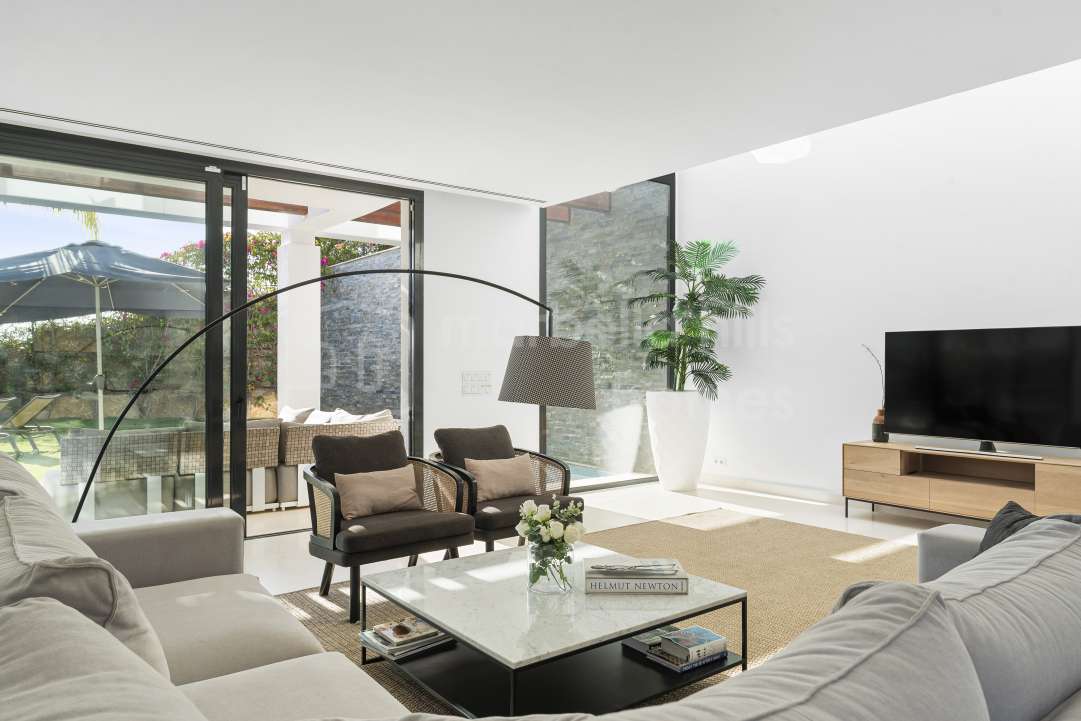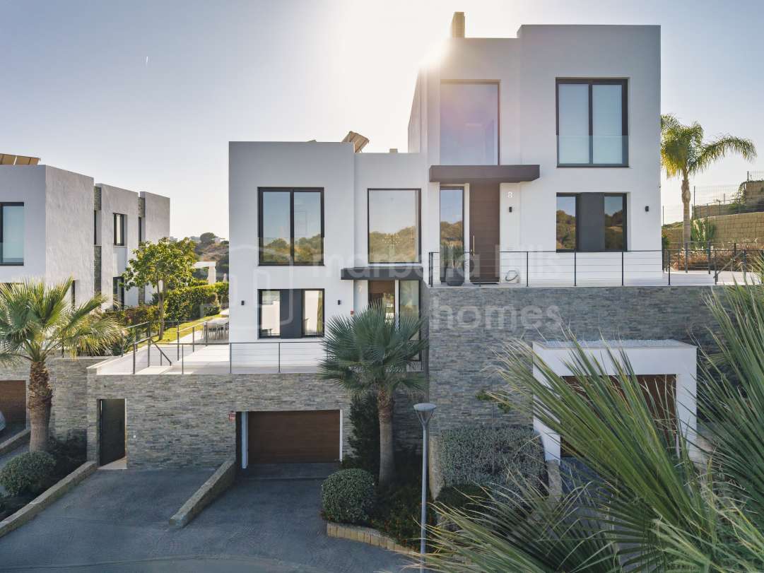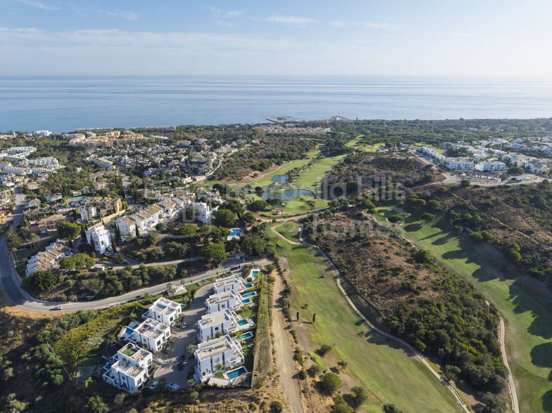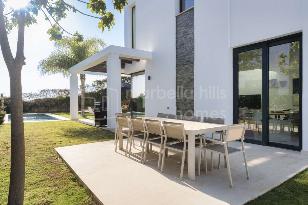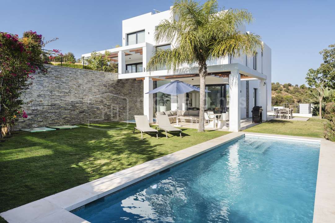 Stilvolle Doppelhaushälfte in Cabopino, Marbella Ost, mit Panorama-Blick auf Meer, Golfplatz und Berge. Mit 5 Schlafzimmern, Design-Interieur, privatem Garten, beheizbarem Pool...