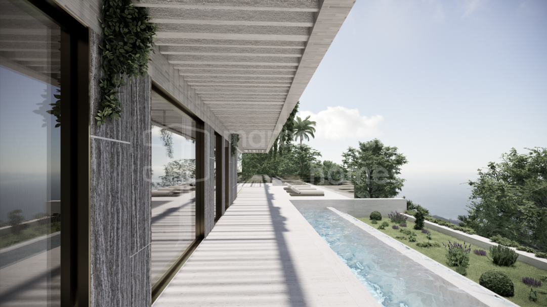Außergewöhnliche Luxusvilla zum Verkauf in Puerto del Almendro Benahavís mit Panoramablick auf das Meer, Gästehaus, Kino, Fitnessraum und großem Privatgrundstück nahe Marbella.