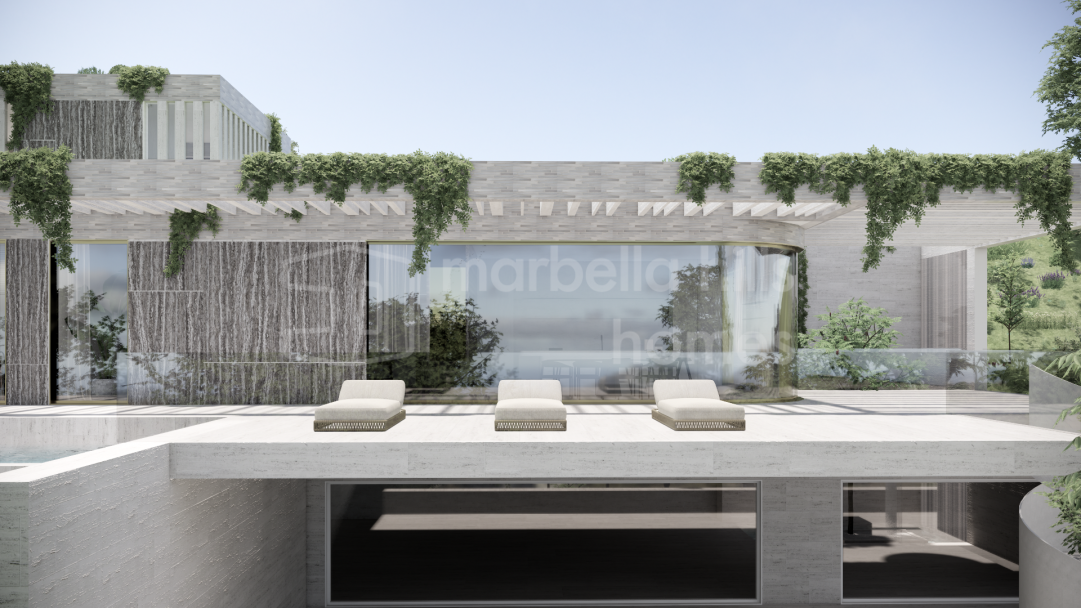 Moderne Luxusvilla zum Verkauf in Monte Mayor, Benahavís. 5 Schlafzimmer, Gästehaus, Infinity-Pool, Panoramablick auf Meer und Berge, nachhaltiges Design und maximale Privatsphäre.