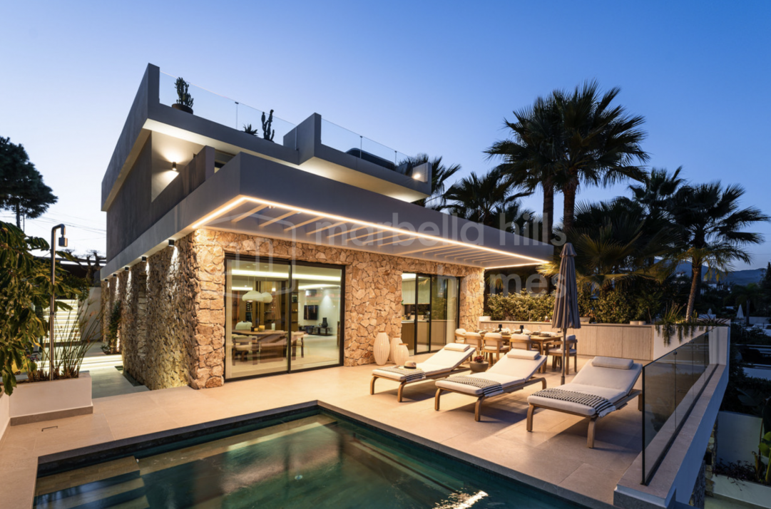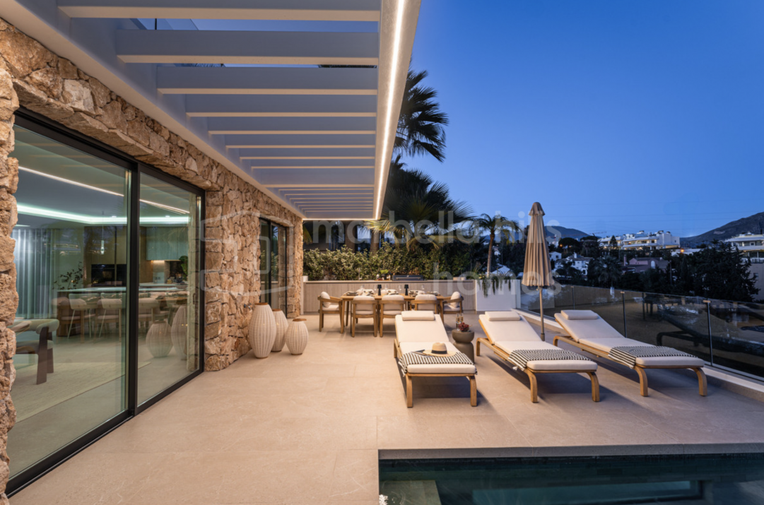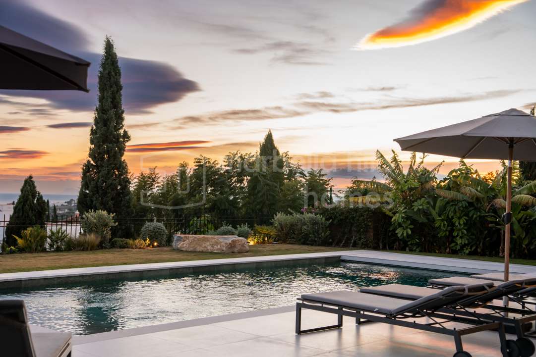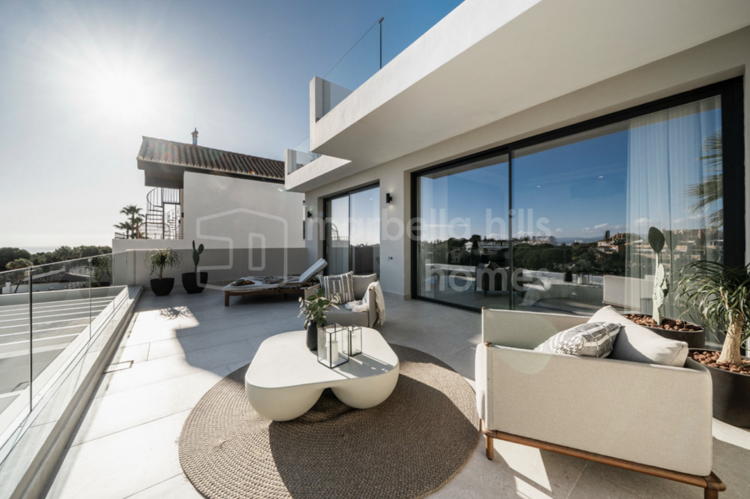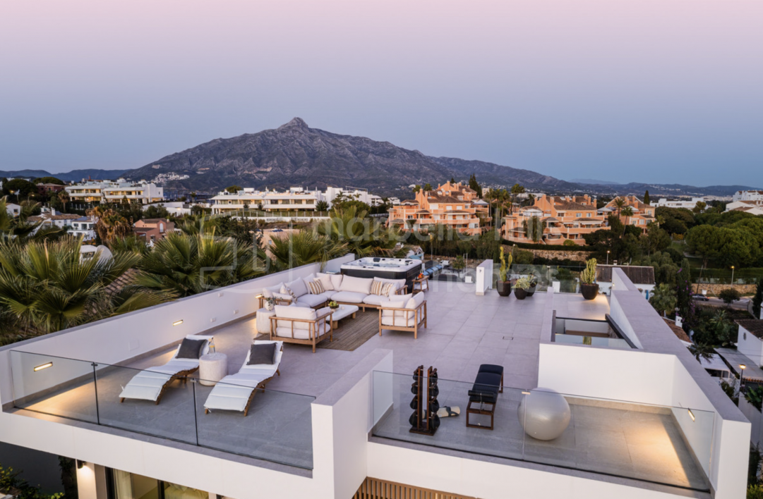 Fully renovated contemporary villa in Nueva Andalucía offering panoramic sea and mountain views, rooftop jacuzzi, private pool, guest apartment and excellent rental potential,...