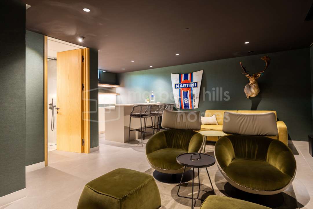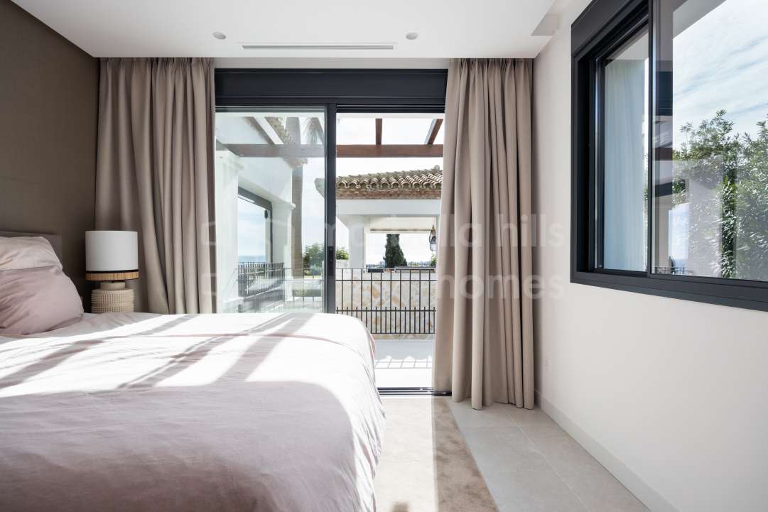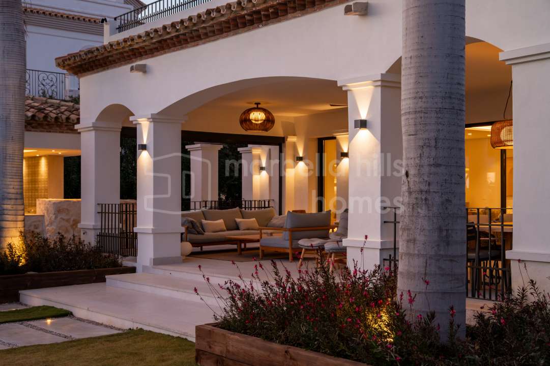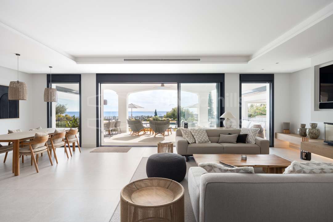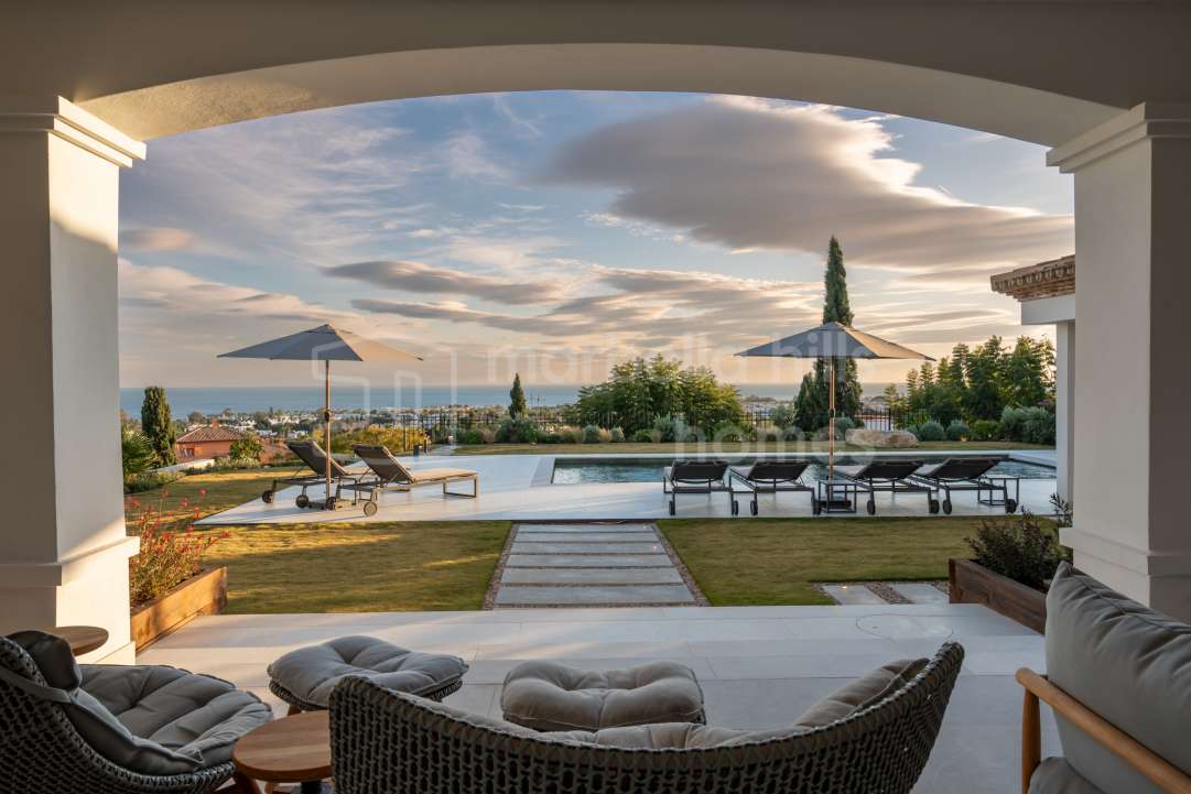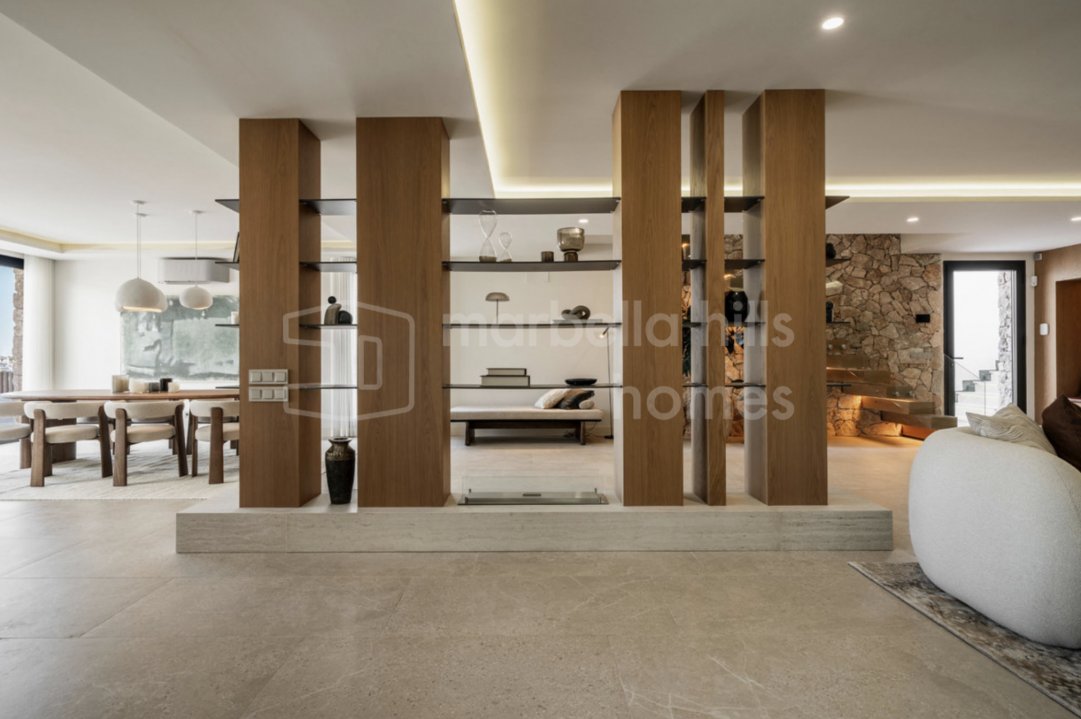 Exceptional renovated luxury villa in the gated community of Los Flamingos, Benahavís, offering panoramic sea views, four bedrooms, wellness facilities, landscaped gardens and...