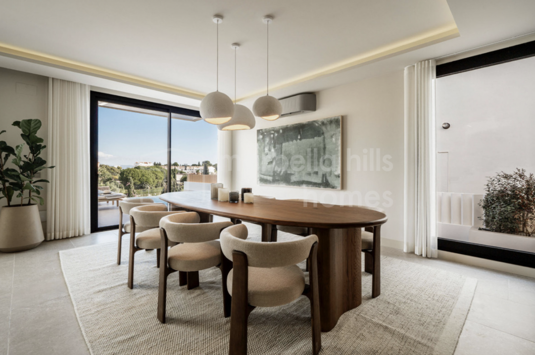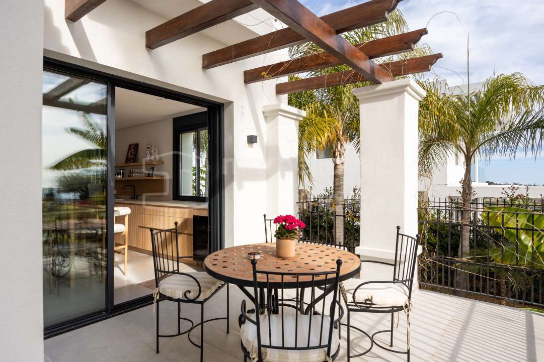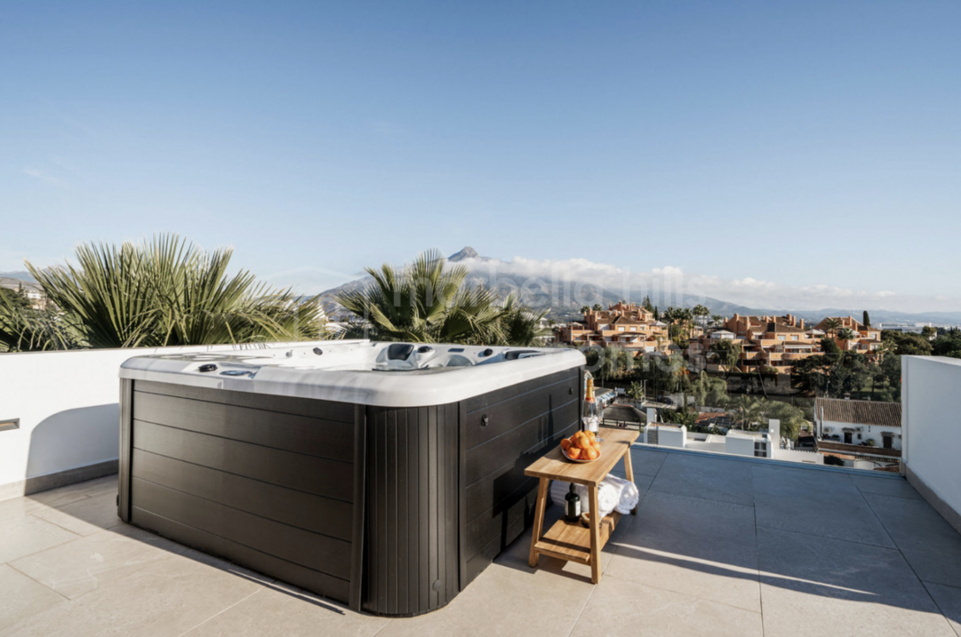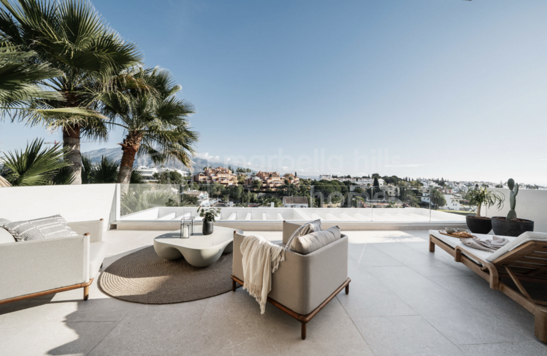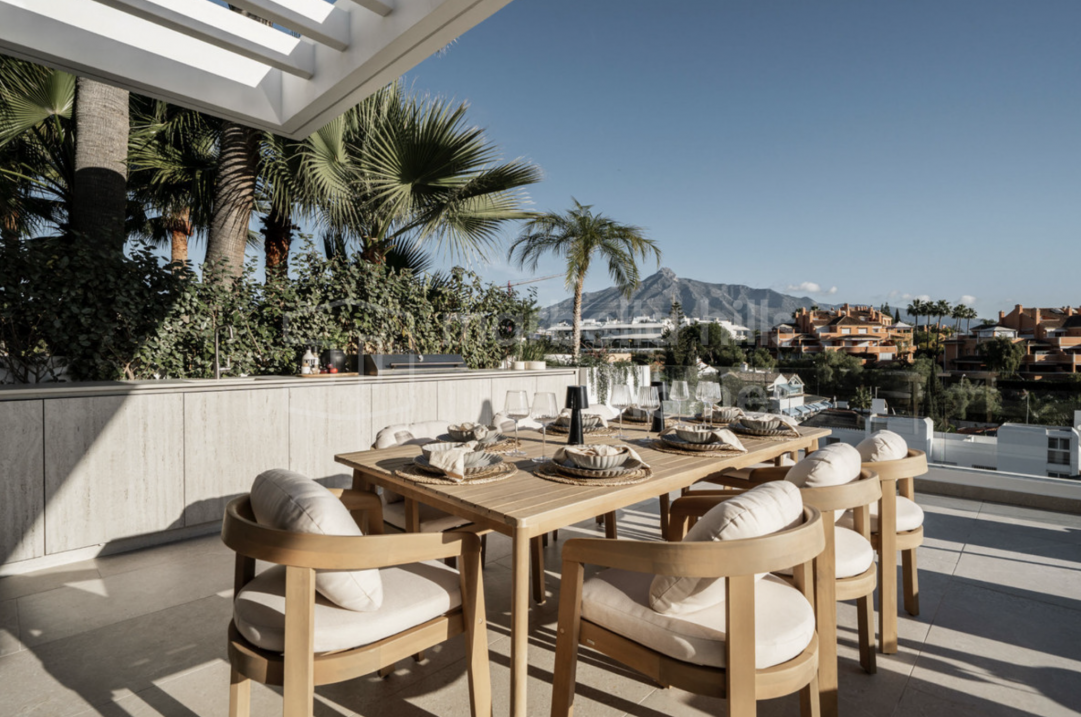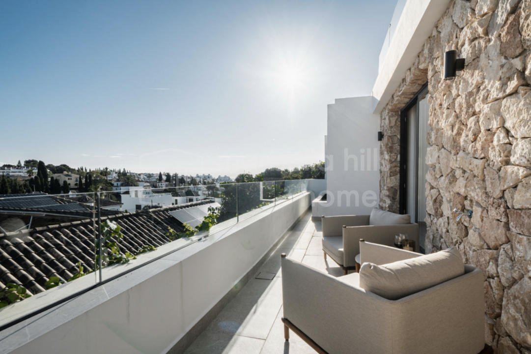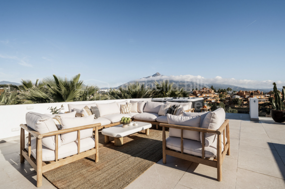 Elegant renovated three-bedroom townhouse in Aloha, Nueva Andalucía, featuring multiple terraces, sea views, rooftop solarium, high-end finishes and a prime location close to...
