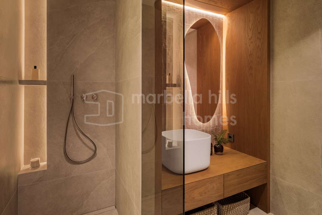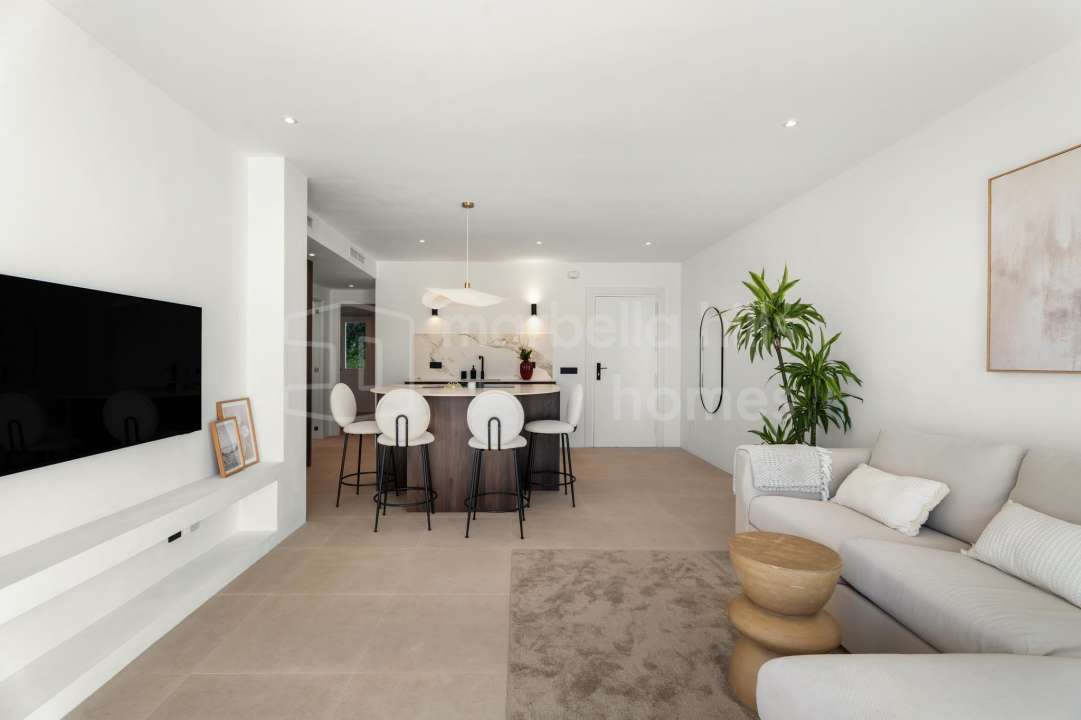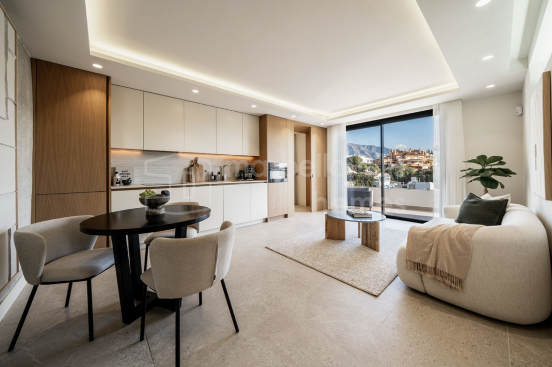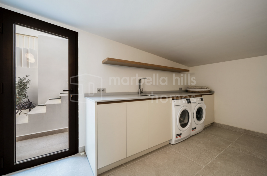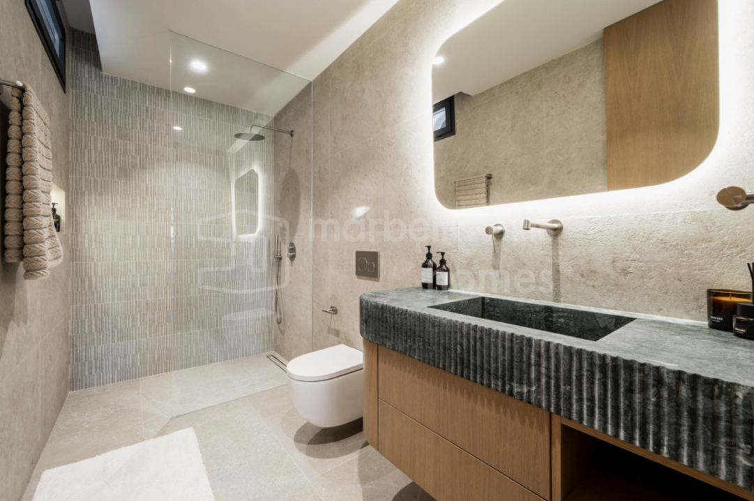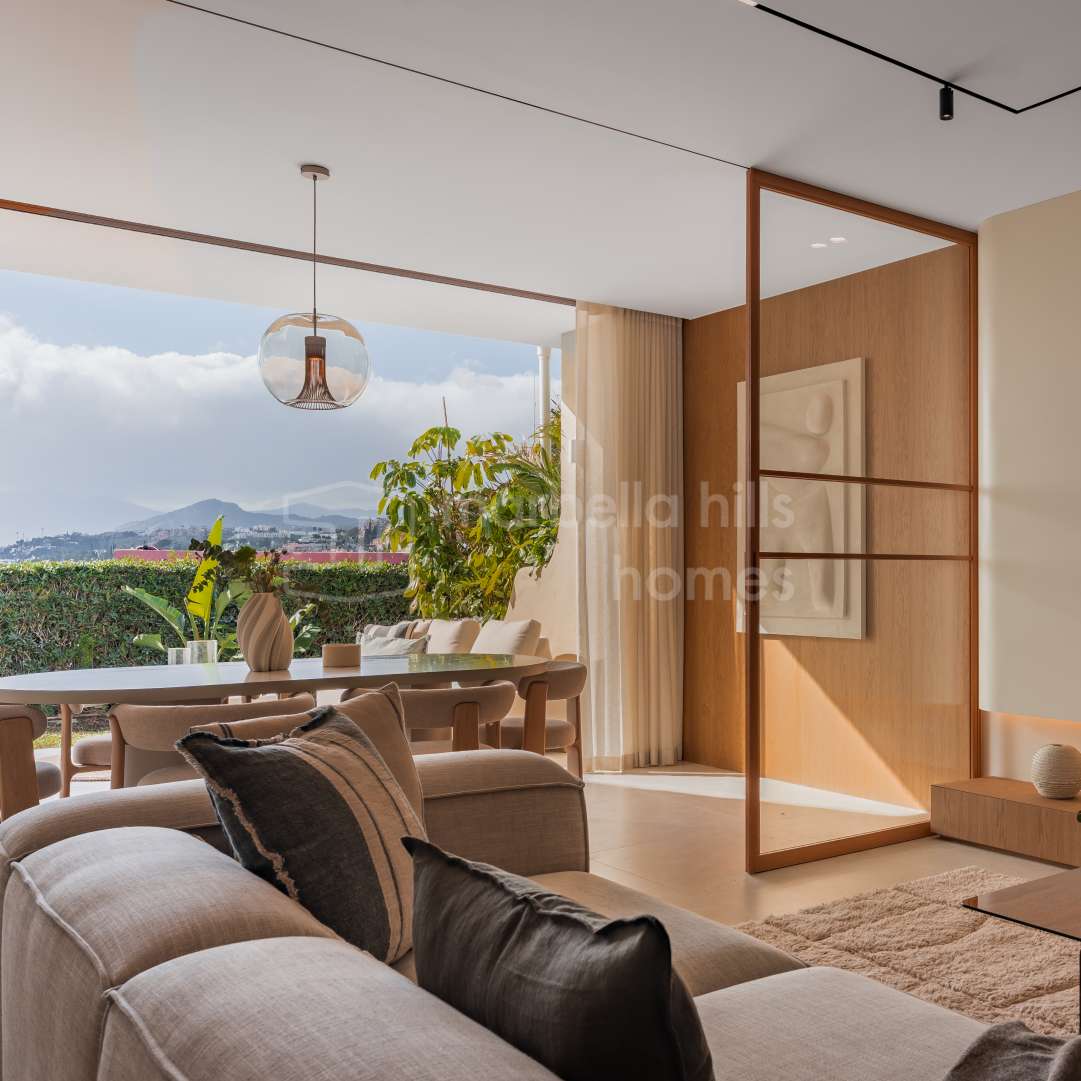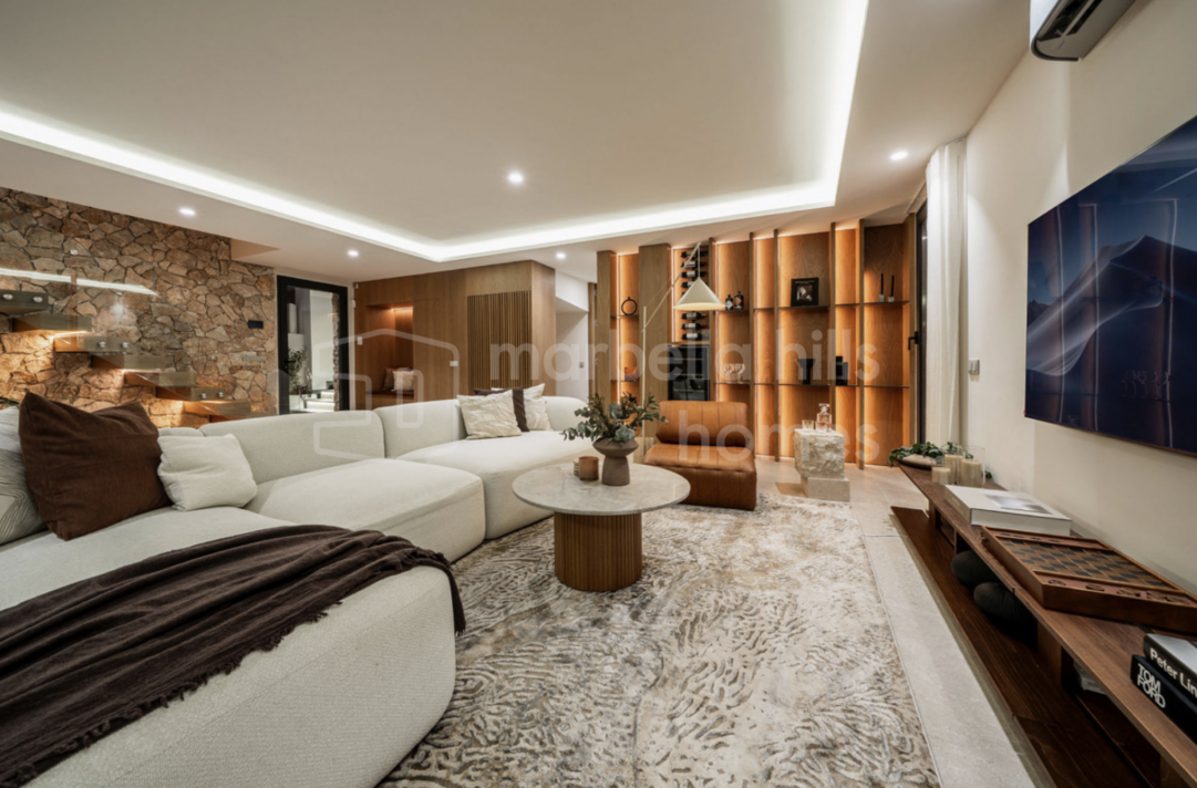 Elegant renovated three-bedroom townhouse in Aloha, Nueva Andalucía, featuring multiple terraces, sea views, rooftop solarium, high-end finishes and a prime location close to...