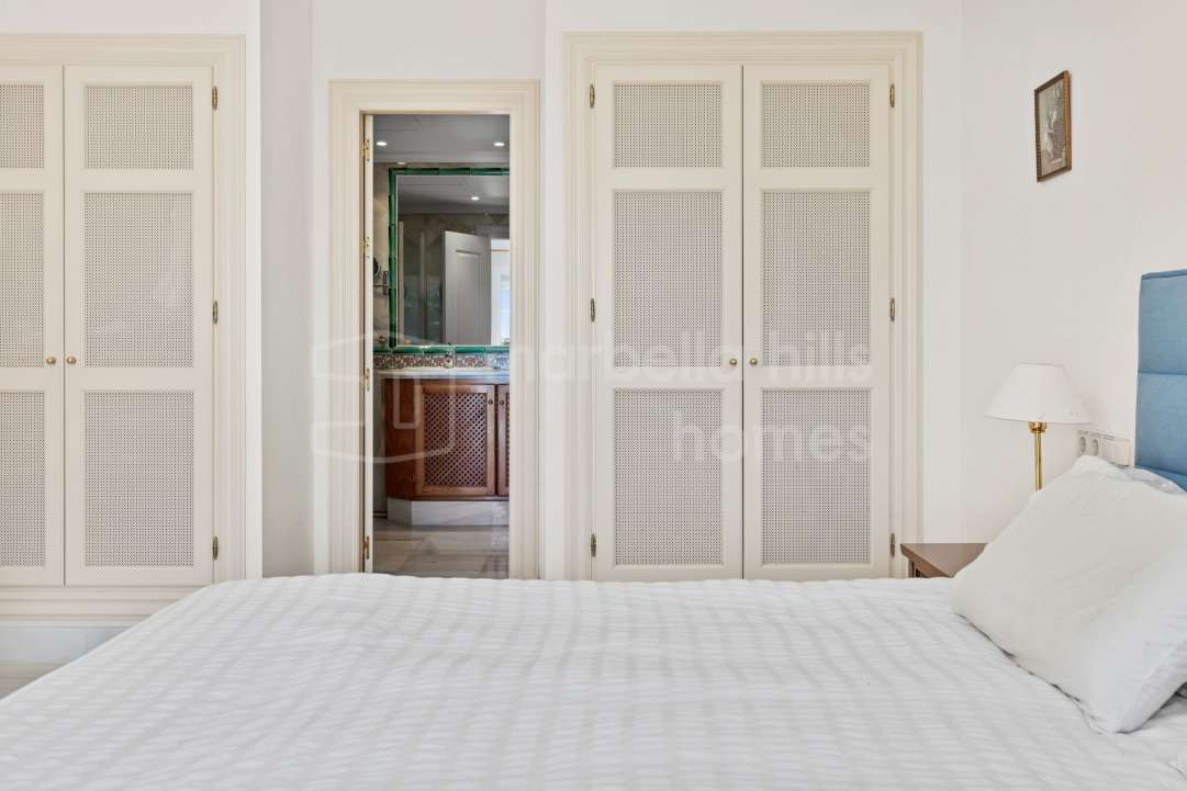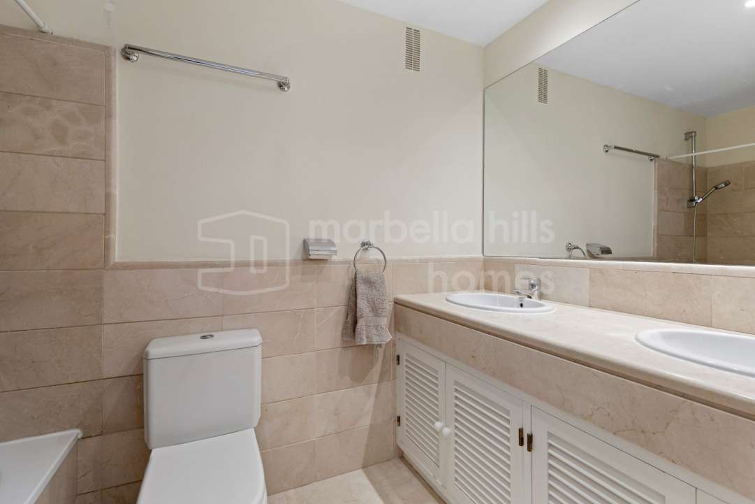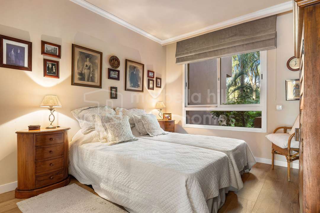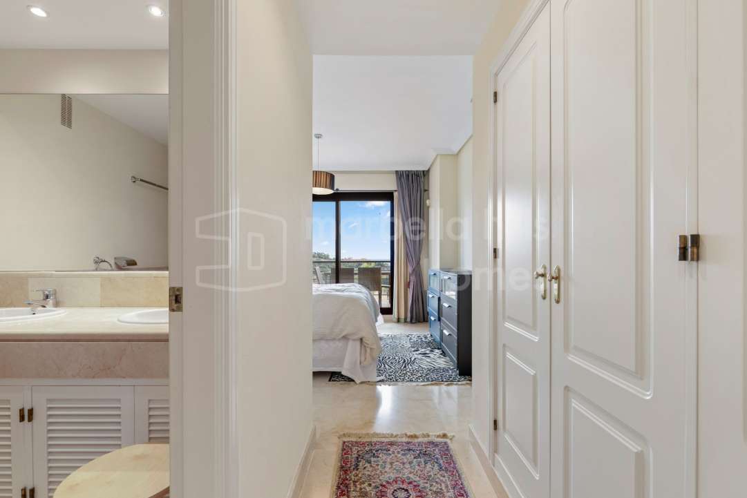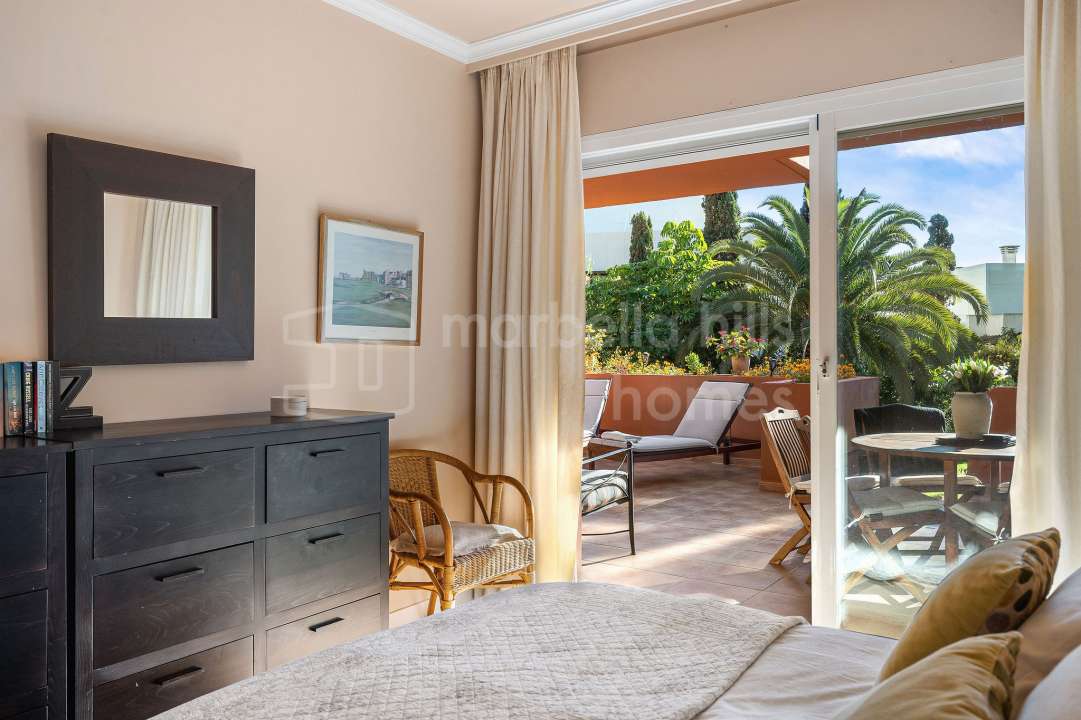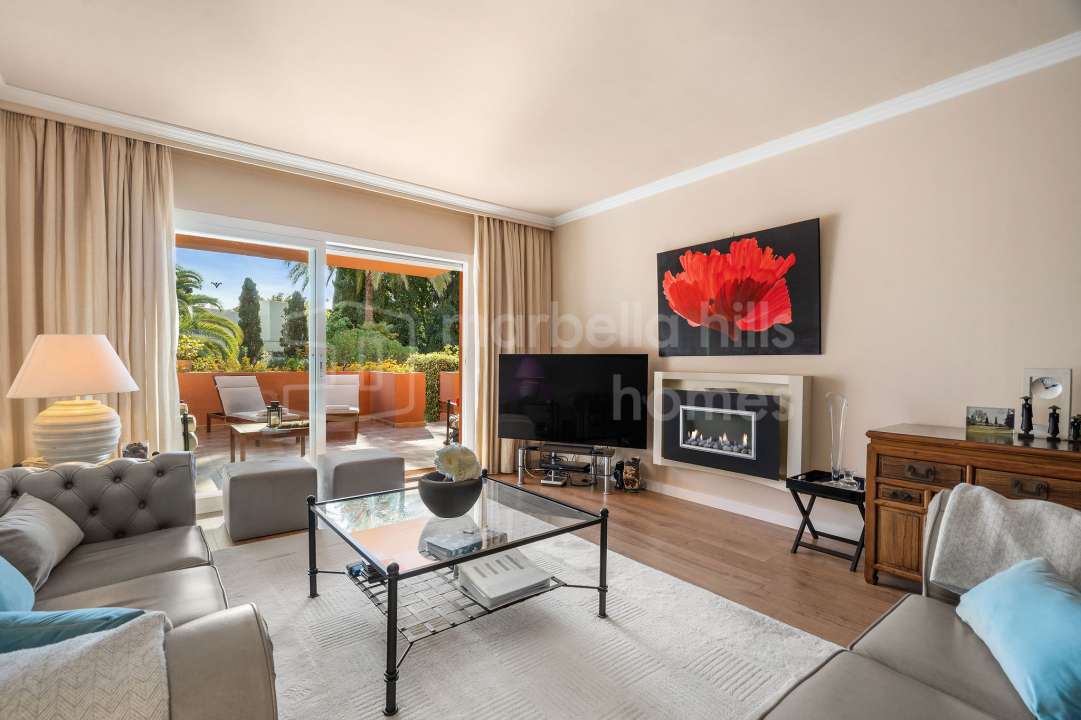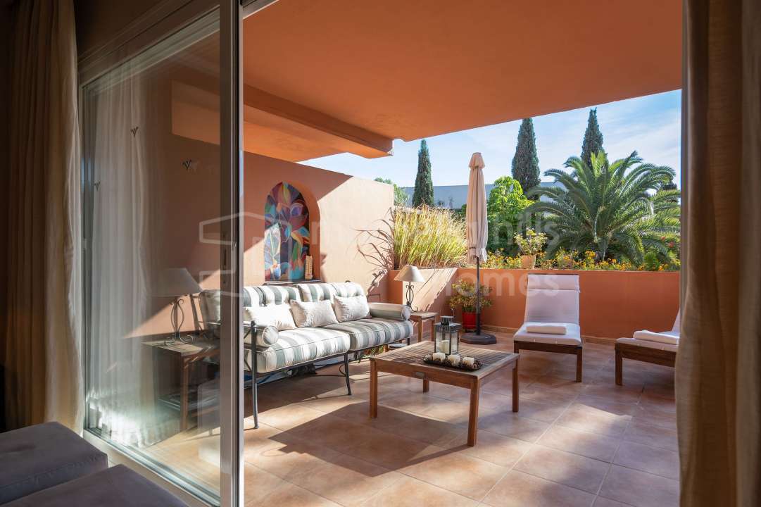 Spacious 2-bedroom south-facing apartment for sale in El Embrujo Playa, Puerto Banús. Private terrace with garden access, gated community, pools and 24h security.