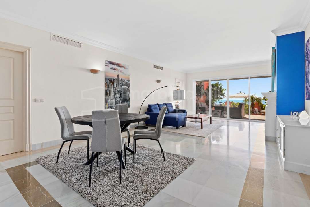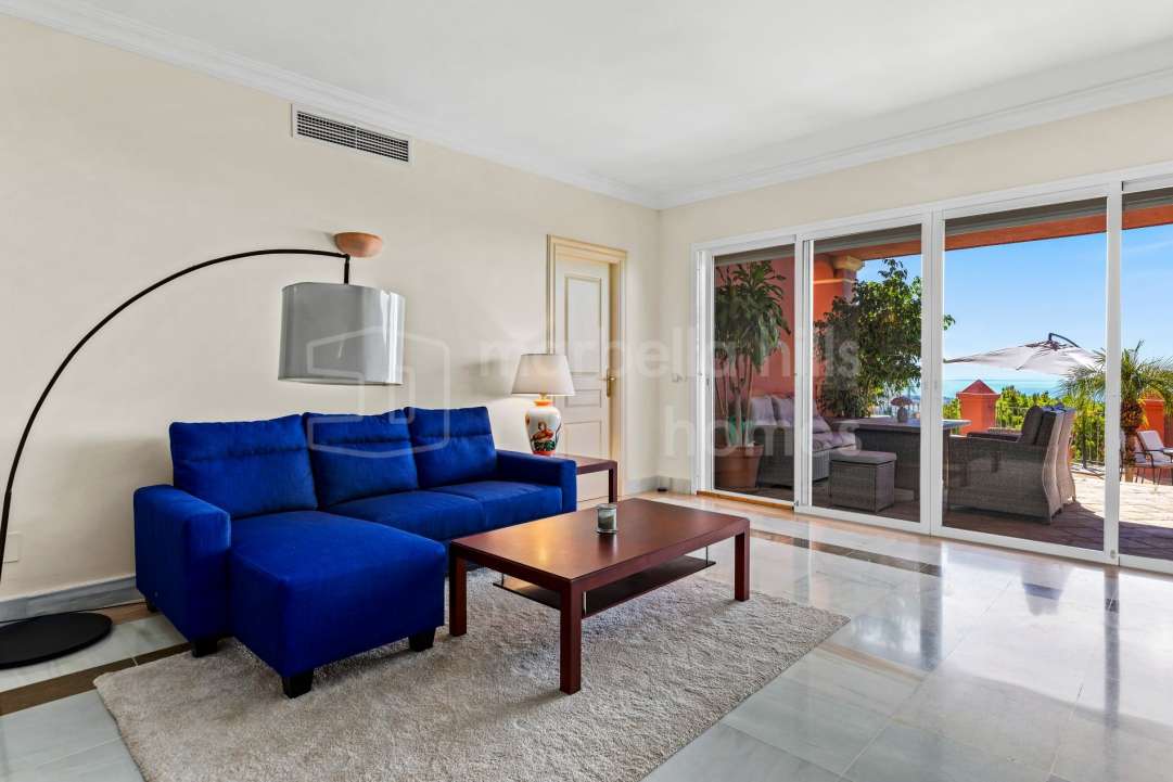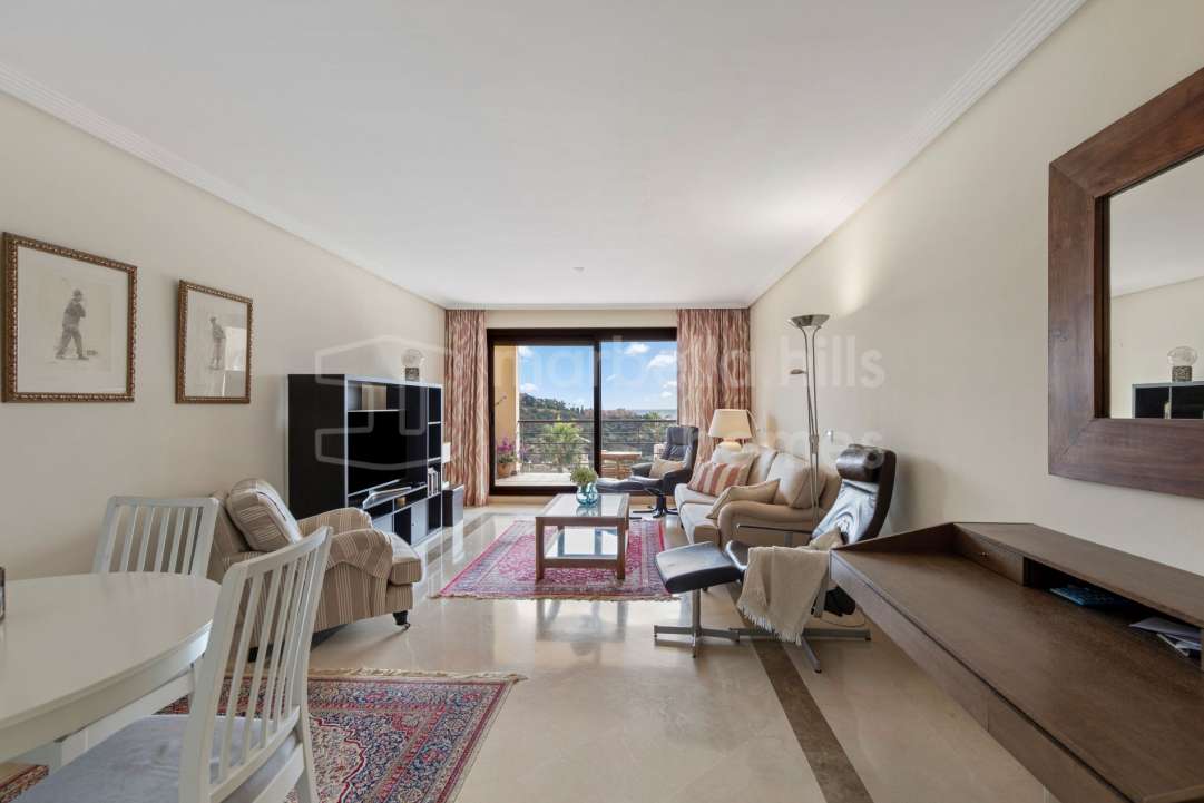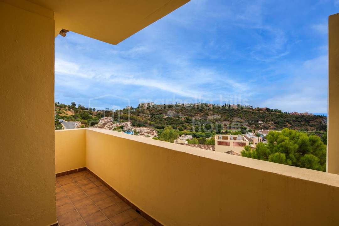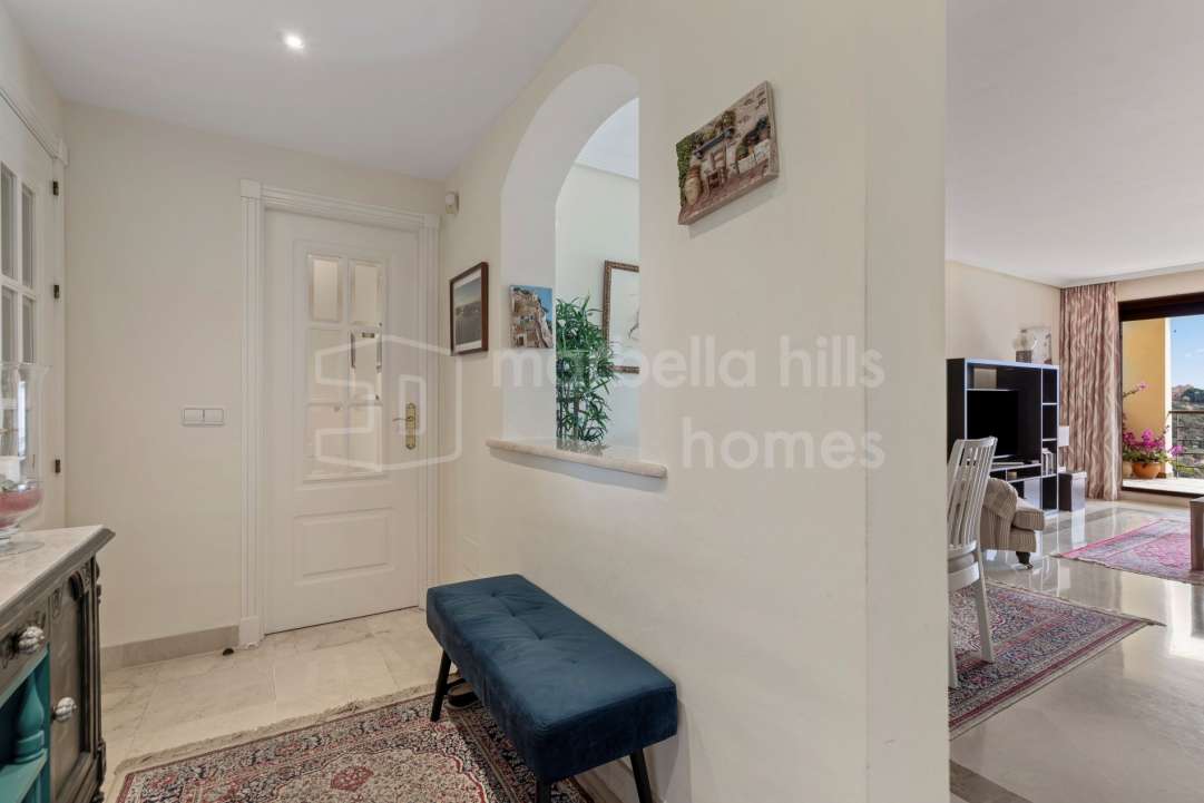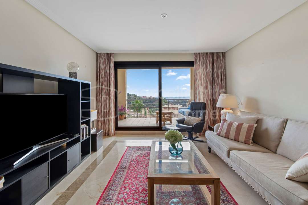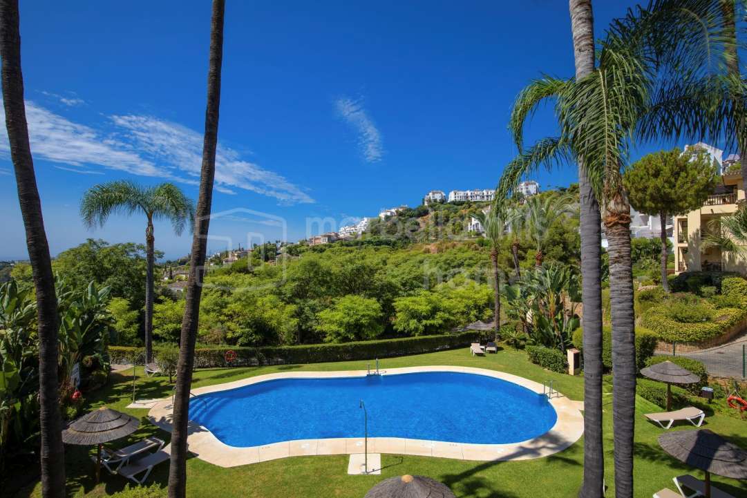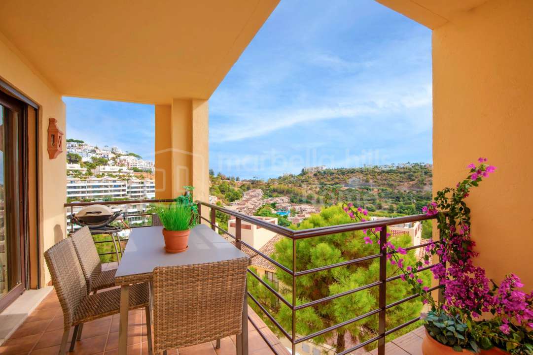 Renovated three bedroom apartment for sale in Benahavís featuring open plan living, private terrace, panoramic views, communal pool and gardens, close to Marbella.