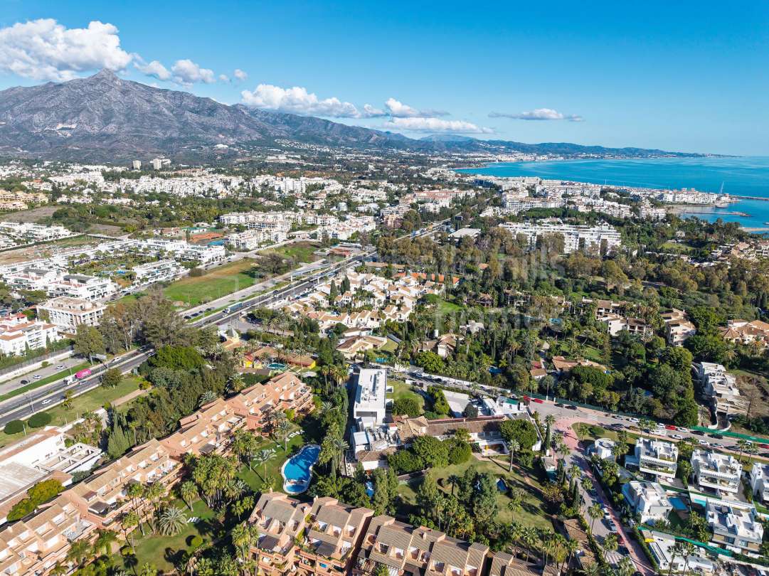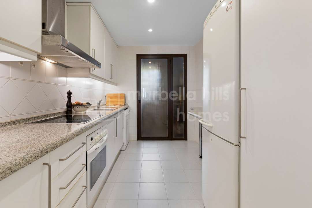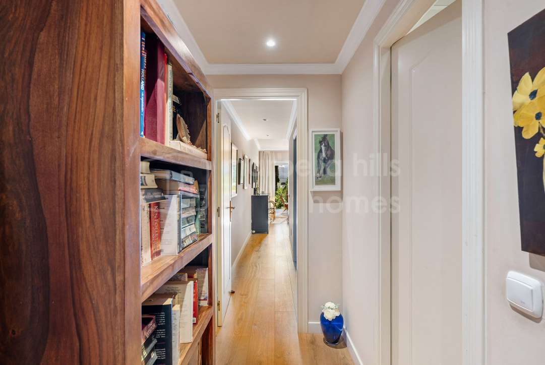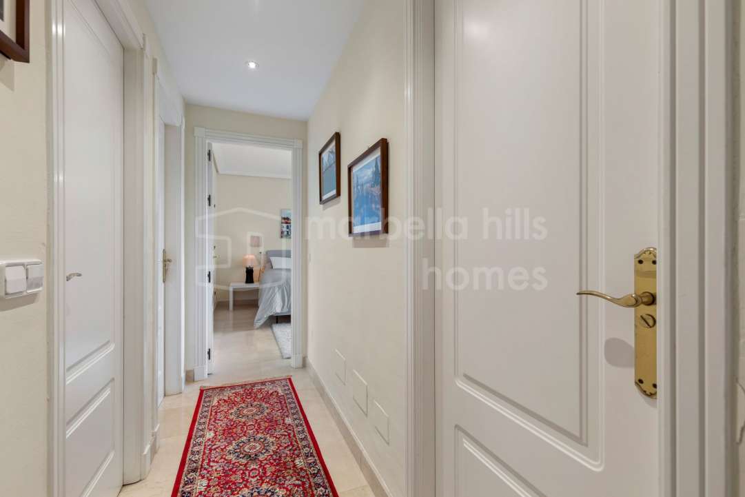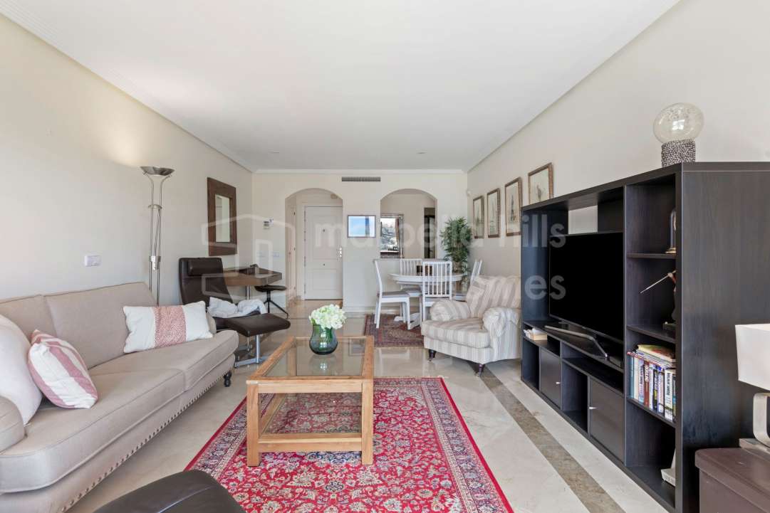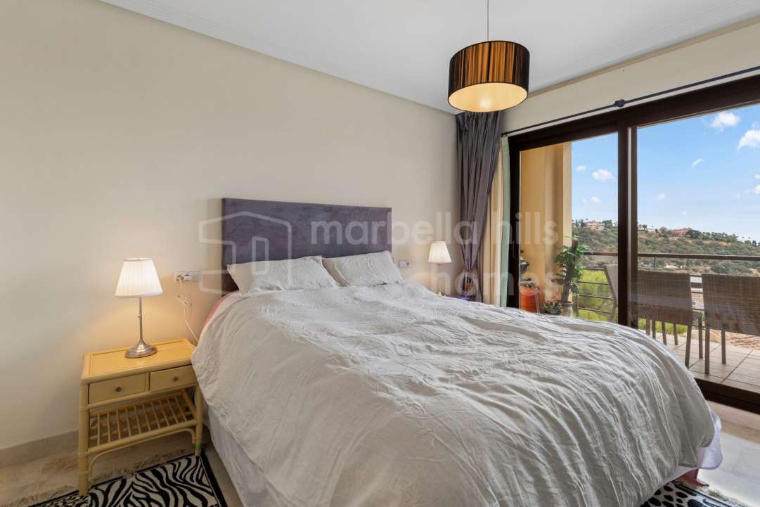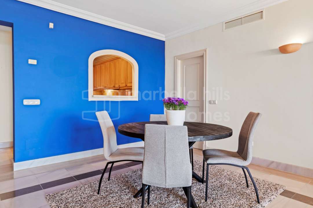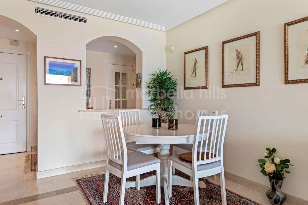 Renovated three bedroom apartment for sale in Benahavís featuring open plan living, private terrace, panoramic views, communal pool and gardens, close to Marbella.