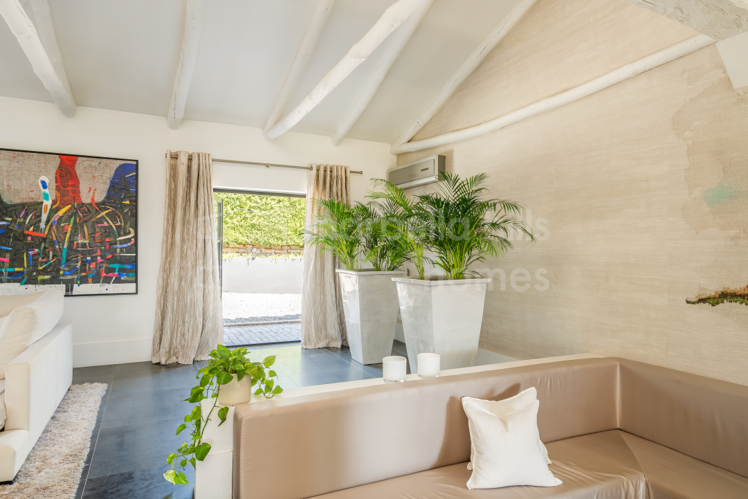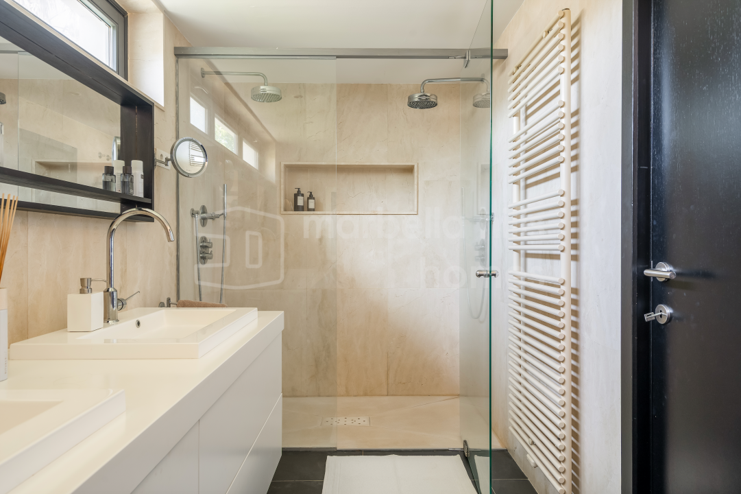 Elegant contemporary villa for sale in Los Arqueros, Benahavís, offering 4 bedrooms, private pool, landscaped garden, open-plan interiors and close proximity to golf and Marbella.
