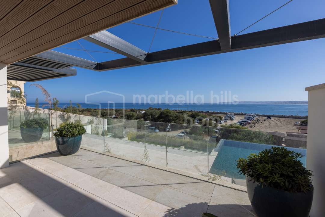 Unique frontline beach villa for sale in La Perla de la Bahía, Casares – private pool, sea views, direct beach access and Andalusian charm.