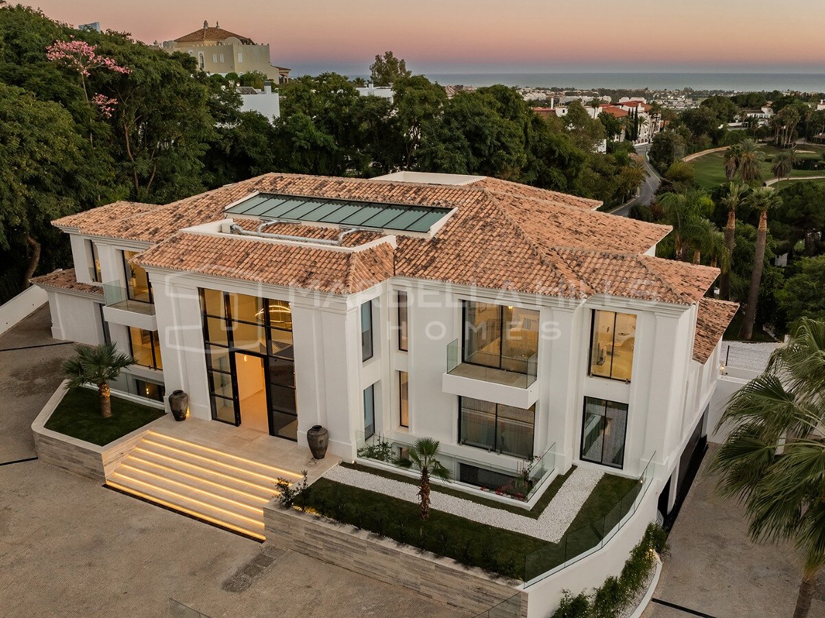 Luxury panoramic sea view villa for sale in El Herrojo Alto, Benahavís, located within one of the most exclusive gated communities above Marbella’s Golf Valley. This exceptional contemporary residence offers eight bedrooms, a private spa with indoor pool, cinema room, gym, and breathtaking views across the Mediterranean coastline, representing a rare opportunity to acquire a high-end villa in Benahavís just minutes from Marbella and Puerto Banús.