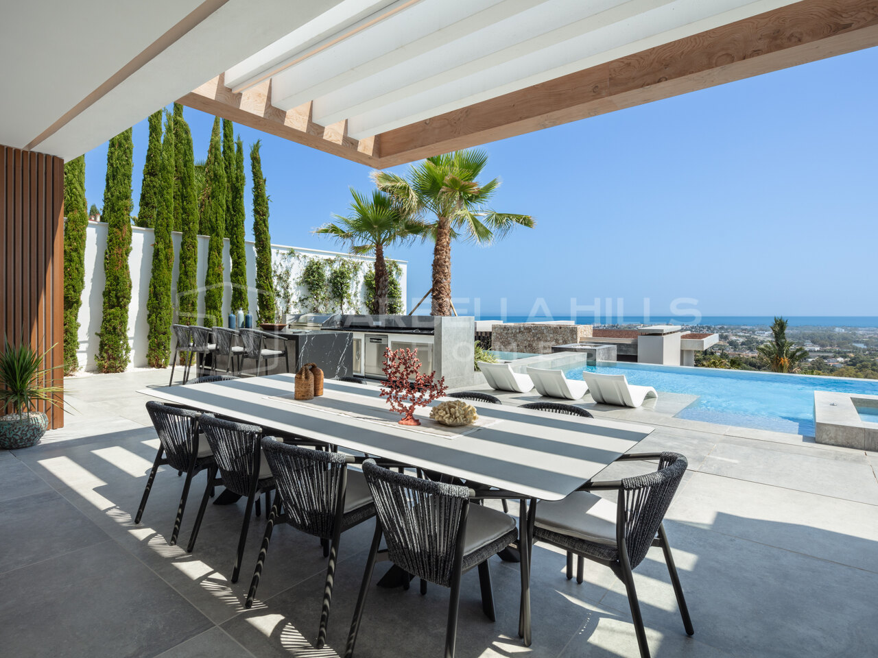 Positioned at the highest point of El Herrojo Alto, this villa enjoys uninterrupted panoramic views over the sea, Gibraltar, and the surrounding mountains. The elevated setting ensures absolute privacy while maintaining immediate access to Nueva Andalucía, La Quinta Golf, international schools, fine dining, and the vibrant lifestyle of Marbella’s Golden Mile.